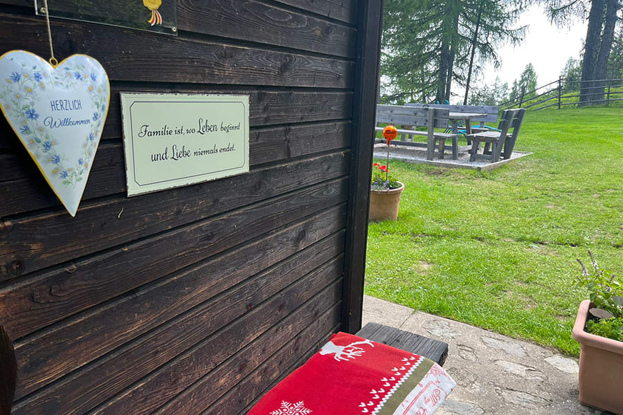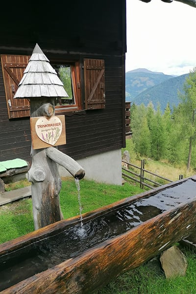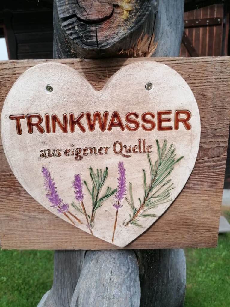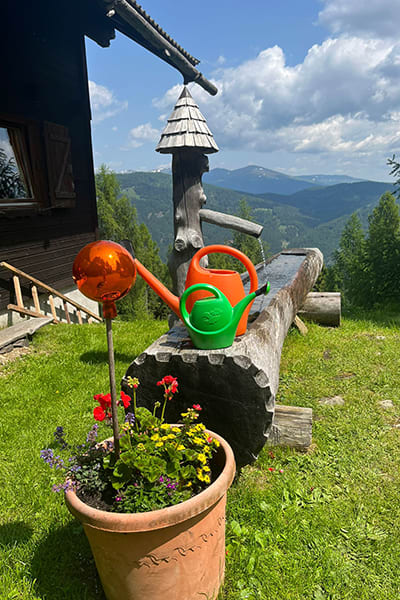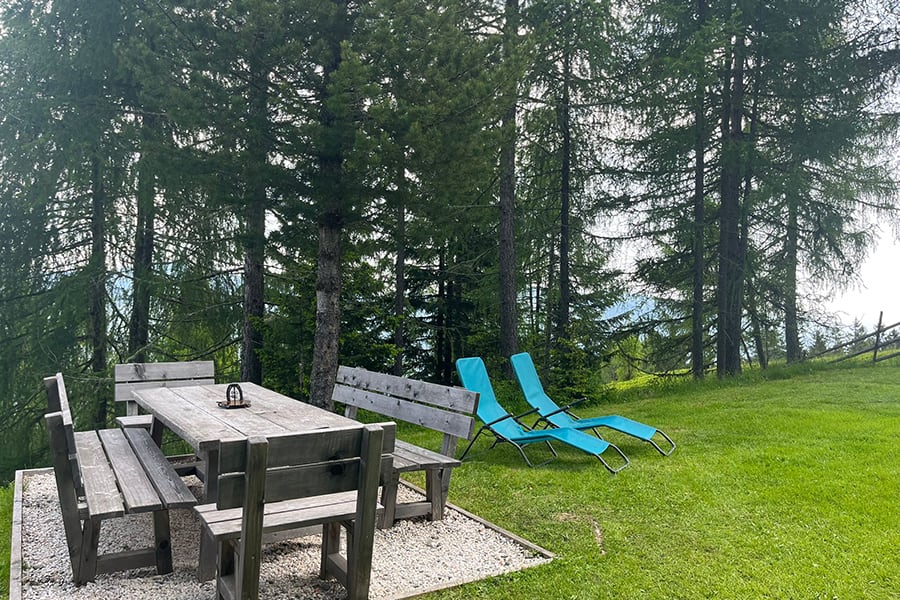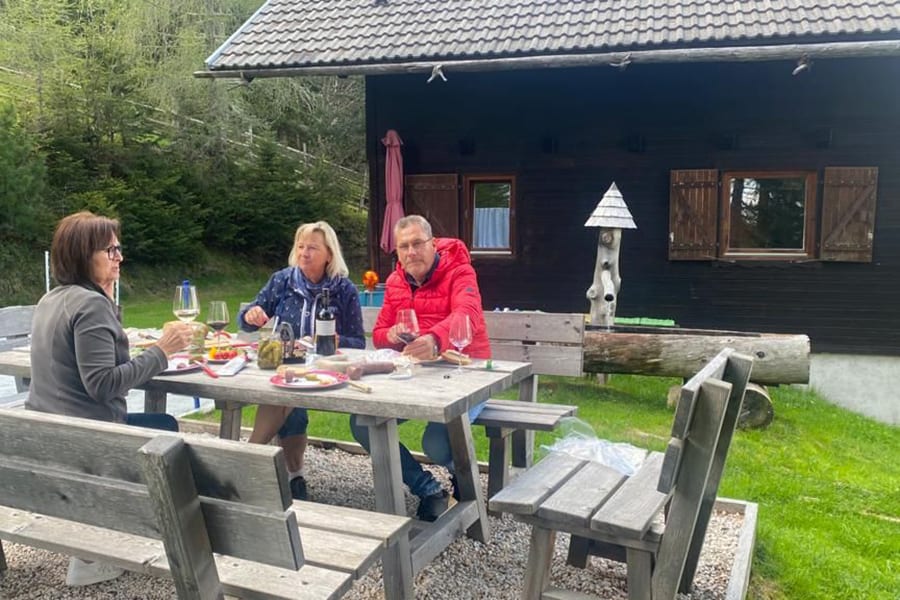 Eingezäunter Hüttenplatz mit großer, gemütlicher Sitzgruppe, Brunnen. Photovoltaik-Strom.