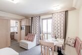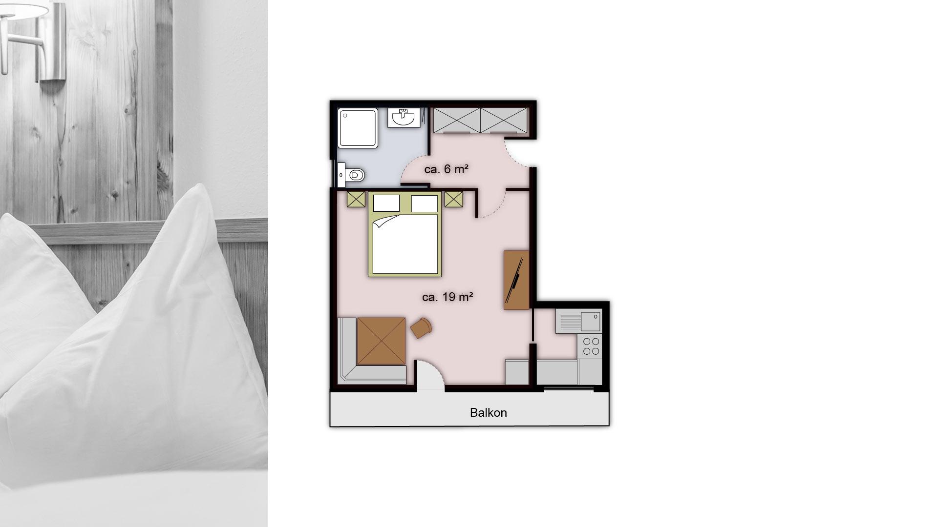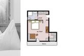 Ferienwohnung-Ausstattung: 1-Zimmer-Wohnung, 1. oder 2. Etage, ca. 20 m², Vorraum mit Garderobe, Wohn/Schlafraum mit Doppelbett und Essecke, durch eine Schiebetür abgetrennte Kochecke (4 Ceranfelder, Mikrowelle, Geschirrspüler, Backofen, Kaffeemaschine, Wasserkocher), Dusche/WC, WIFI-Hotspot, Balkon.