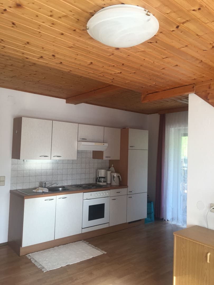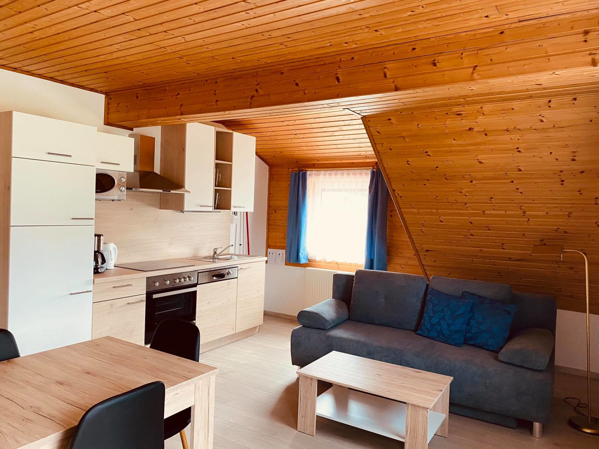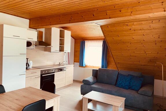 • Eine großzügige Wohnküche mit ausziehbarer Couch, Eckbank und voll ausgestatteter Küchenzeile (Kühlschrank mit Gefrierfach, Cerankochfeld mit Backofen, Kaffeemaschine, Wasserkocher, Spülmaschine, Geschirr)