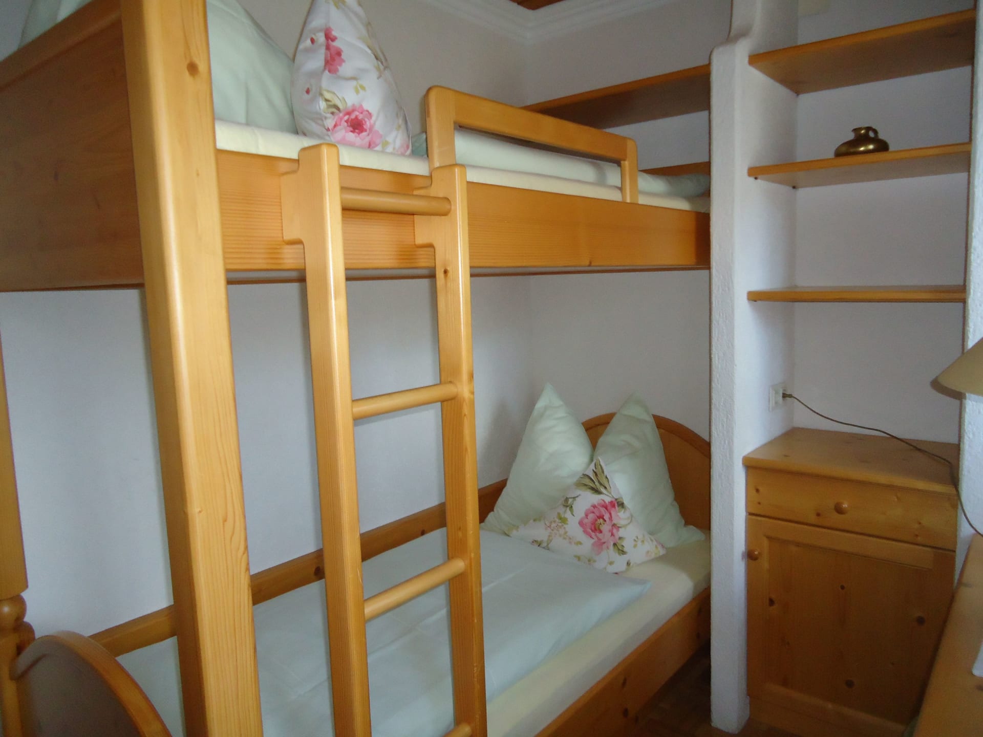 eingerichteten Ferienwohnung. Sie bietet ein Schlafzimmer, ein separates Kinderzimmer mit Stockbett, einen Wohnraum mit ausziehbarer Couch und Kochnische mit Essecke, Balkon, Dusche/WC.