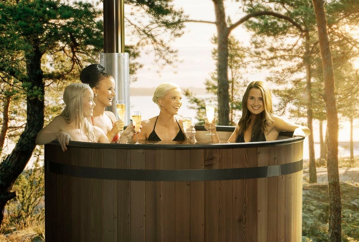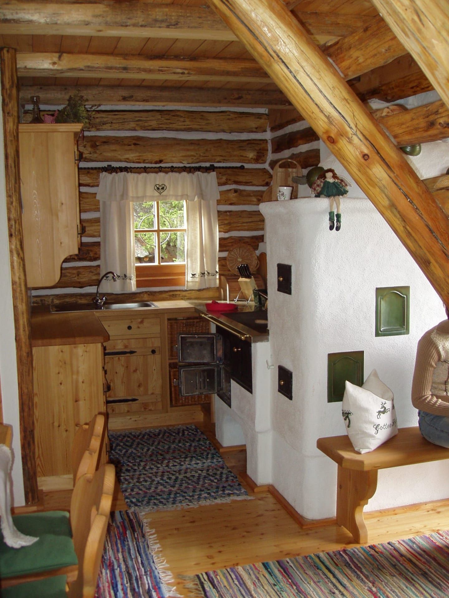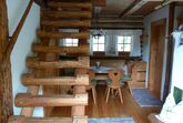 Hier findet man eine Küche mit Essecke eine Bettbank, ein Bad mit Dusche, ein WC und oben auf 3 kleine Zimmerchen für bis zu 6 Genießer. Es gibt fließend Wasser, Herd, Badeofen und HOT POT sind mit Holz zu heizen. Holz finden Sie gleich hinten in der Holzhütte ... natürlich dürfen Sie auch selbst Kleinholz machen, oder Brennholz fürs Lagerfeuer sammeln. Nebenan steht der HOT POT und die kleine Saunahütte ...davor zur Abkühlung eine besondere Baumdusche