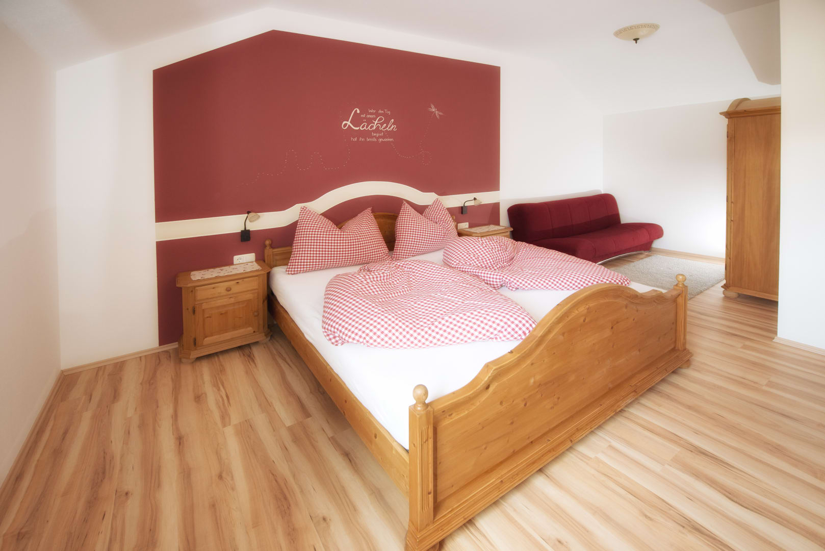 Doppelzimmer mit DU und WC und Balkon mit Verbindungstür zur Ferienwohnung Voralpenblick.