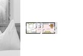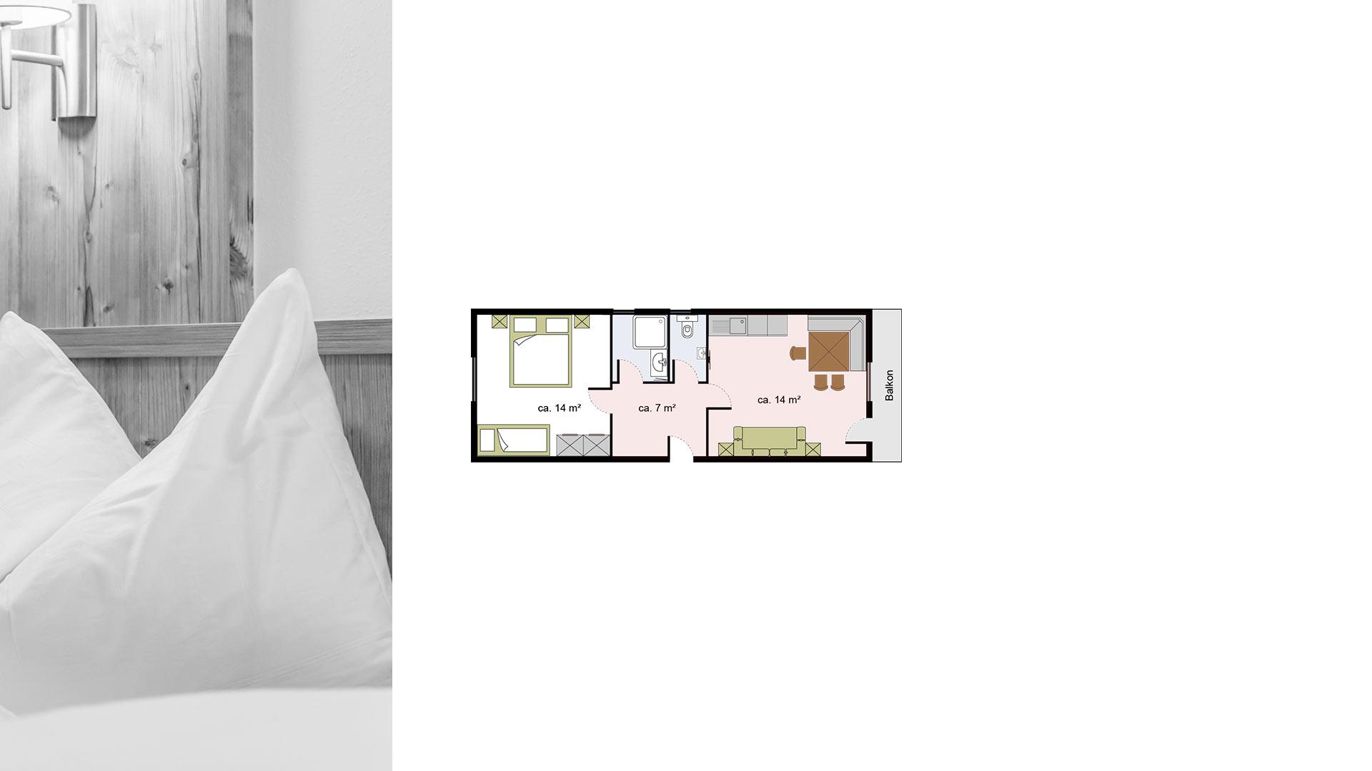 2-Zimmer-Wohnung, 1. Etage, ca. 33 m². Vorraum. Wohn-/Schlafraum mit Doppelbettcouch, Essecke und Küchenzeile (4 Platten, Backofen, Mikrowelle, Geschirrspüler, Kaffeemaschine). Schlafzimmer mit Doppelbett und Einzelbett. Dusche. Separates WC. Digital Flat-Screen. WLAN (kostenpflichtig).