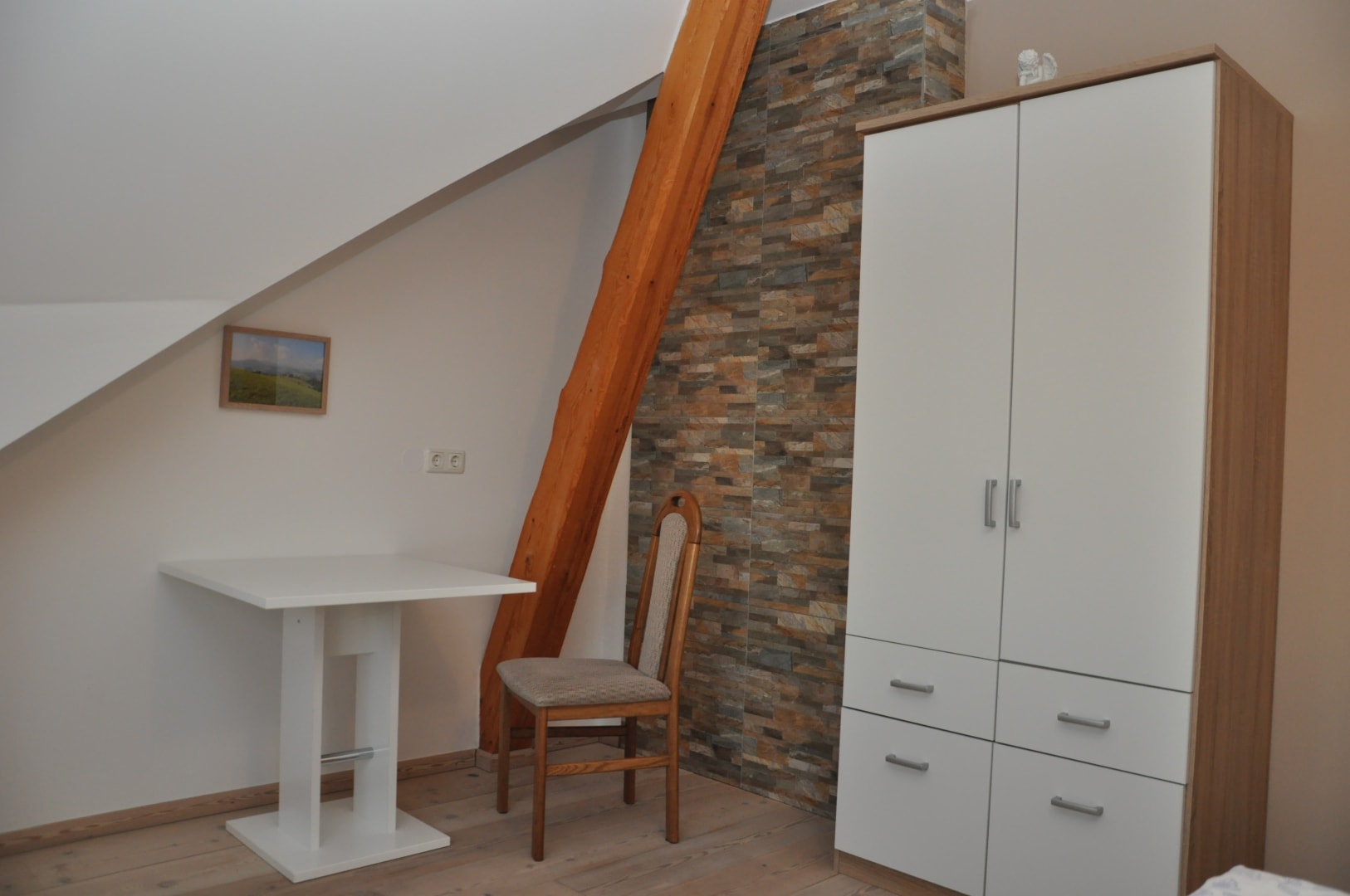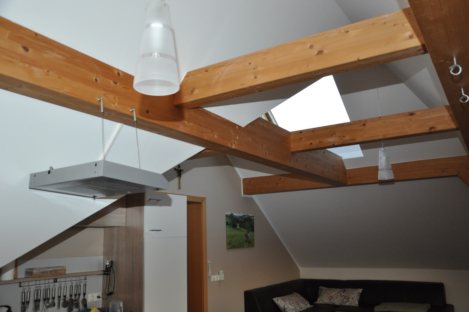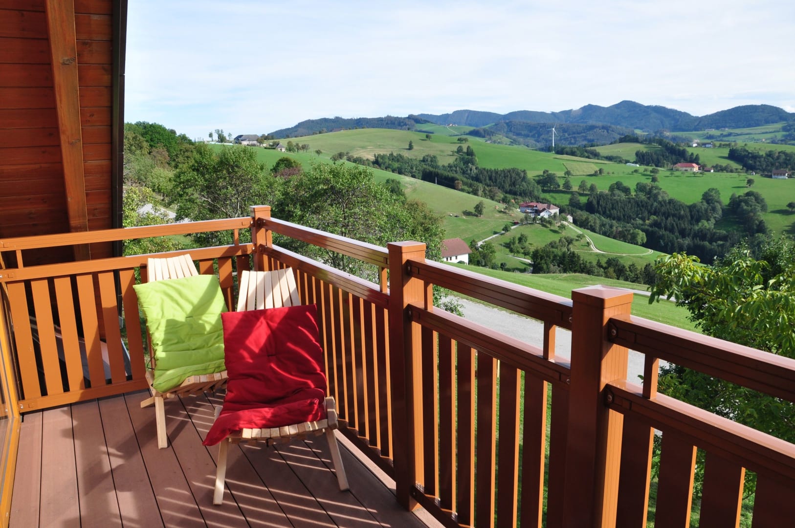 Das Appartement Voralpenblick im zweiten Stock bietet eine großzügige und ebenso voll ausgestatteten Wohnküche mit Balkon, zwei Schlafzimmer, ein Badezimmer mit Dusche, Badewanne und WC.