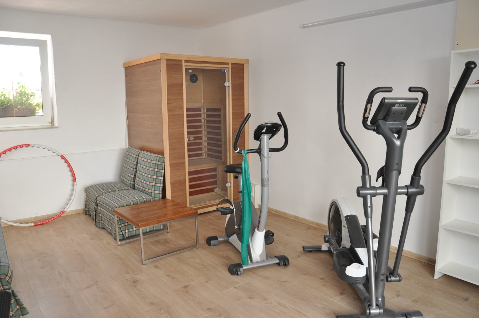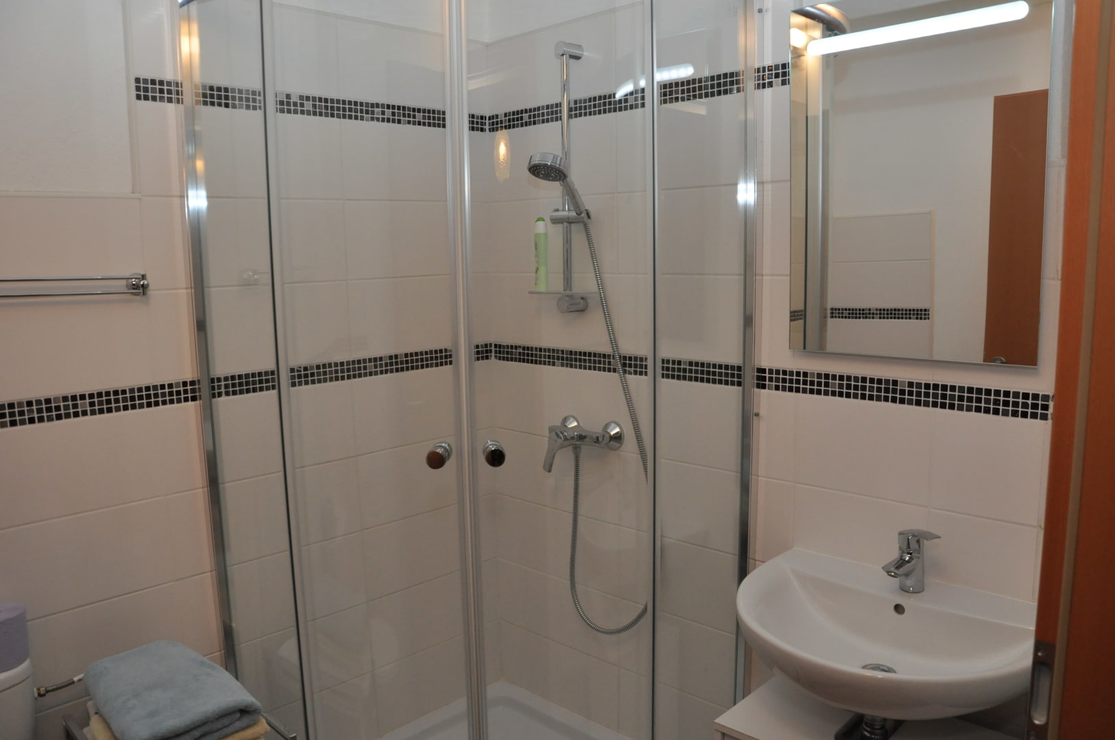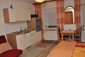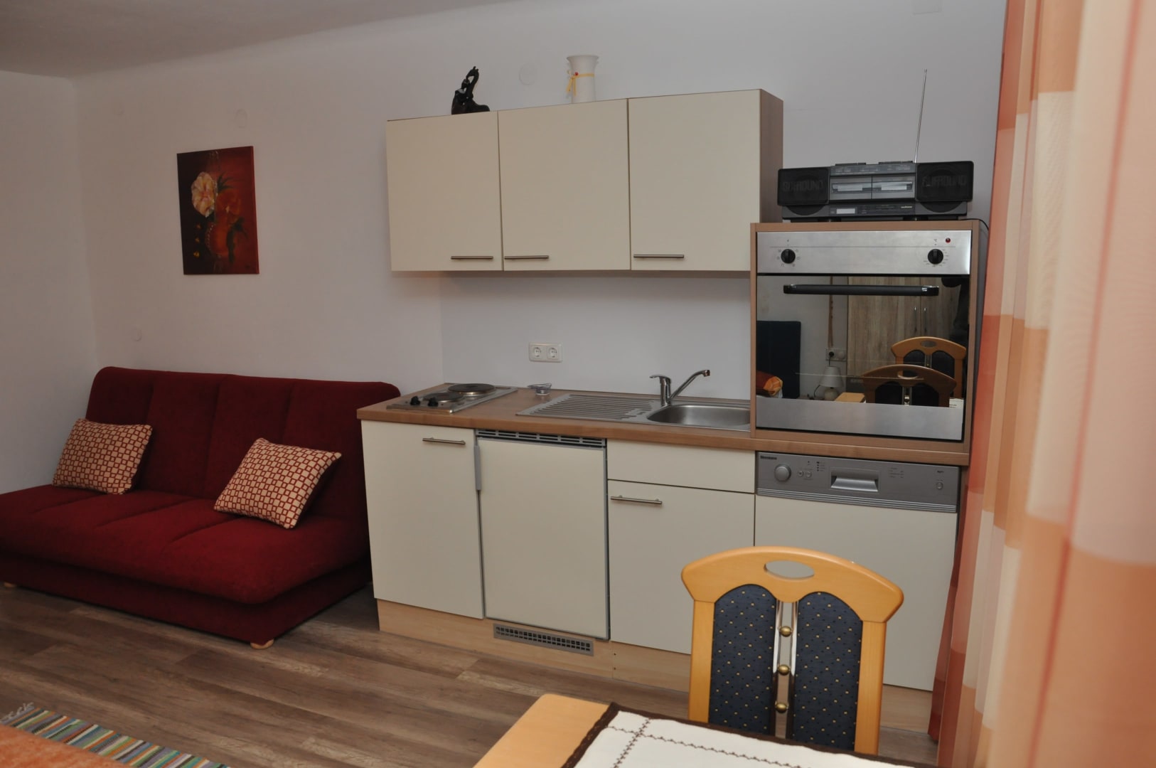 Das Giggerl-Zimmer im ersten Stock besteht aus einem großen Schlafzimmer mit Koch- Wohnbereich und einem Badezimmer mit Dusche und WC.