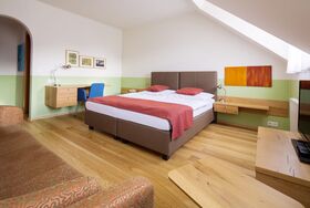 Die Doppelzimmer befinden sich im Erd- und Dachgeschoß. Neben einem geräumigen Doppelbett gibt es ein gemütliches Sofa mit einem kleinen Beistelltisch. Hier kann man es sich gemütlich machen und vielleicht ein gutes Gläschen Wein trinken. Wer arbeiten muß, findet auch einen geräumigen Schreibtisch mit Lampe. Das Bad ist mit Dusche und WC ausgestattet. Alle Zimmer sind klimatisiert.