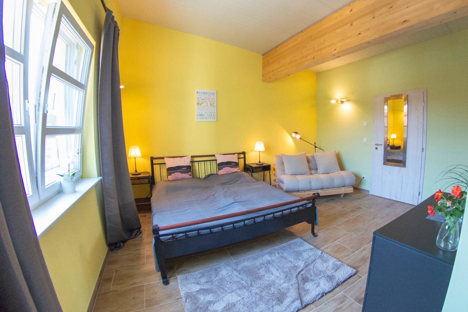 Dieses Ranchzimmer verfügt über eine bequeme Ausziehcouch. Vom Fenster aus haben Sie einen herlichen Blick auf unseren Garten und unsere Tiere. Der Fernseher verfügt über Netflix. Ein DVD Player und ein DVD Verleih ist ebenfalls vorhanden.