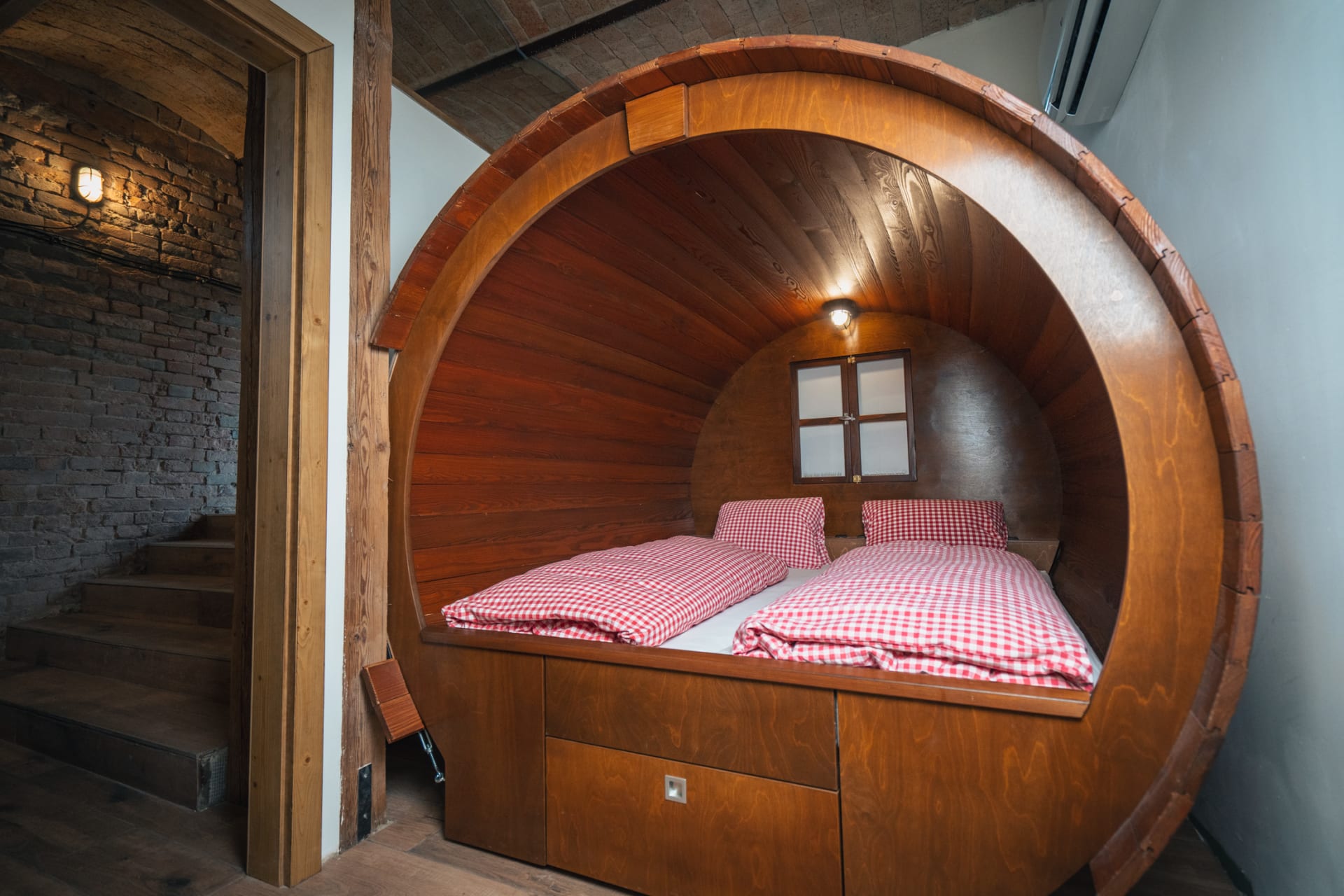 Wir bieten 12 weltweit einzigartigen Weinfass-Suiten mit jeglichem Komfort,
