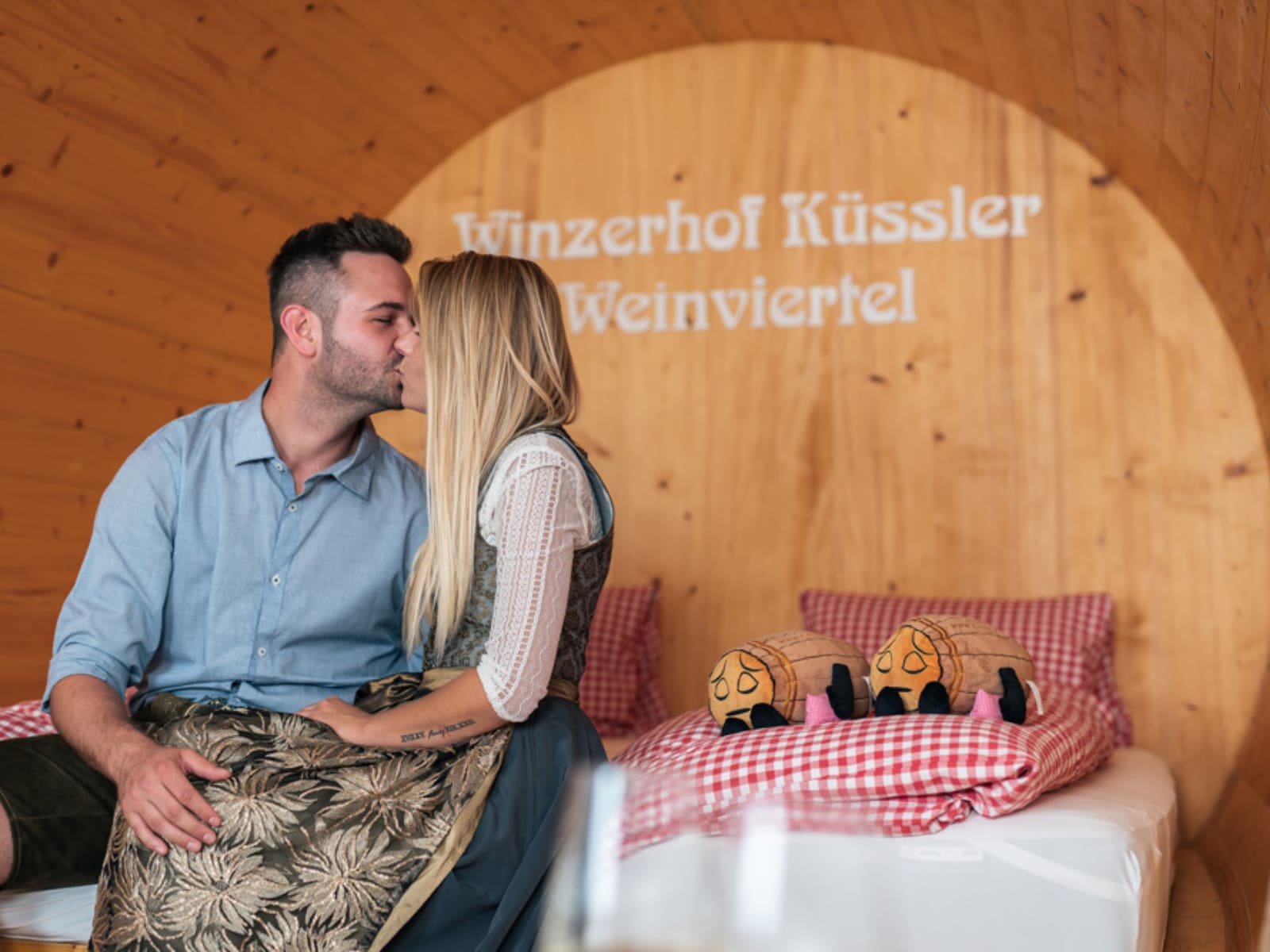 Ein ehemaliges Presshaus wurde stilgerecht in ein einzigartiges Weinfass-Chalet auf drei Ebenen umgebaut und ist ideal für bis zu 8 Personen. Im Dachgeschoss befindet sich eine Weinfass-Suite für zwei Personen mit einem Extradoppelbett, mit jeglichem Komfort wie Dusche, WC, Wlan, TV uvm. Außerdem verfügt das Weinfass-Chalet über eine gemütliche Weinviertler Stubn mit direktem Zugang zur Terrasse. Das Dachgeschoss ist mit einer stilvollen Eisenstiege mit dem Erdgeschoss verbunden. Im Erdgeschoss befinden sich zwei weitere Weinfass-Suiten mit je einer Komfort-Dusche, einem WC, Wlan und TV. Weiters Sitzgelegenheiten direkt im ehemaligen Presshaus. Zudem verfügt das Chalet über einen 70 m2 großen eigenen Weinkeller mit eigenem Sitzbereich und einer Wohlfühlzone zum Anstoßen. In den Weinregalen befindet sich eine Vielzahl an Küssler-Weinen. Im Außenbereich ist eine weitläufige Terrasse mit Sitzgelegenheiten, die zum Verweilen geradezu einlädt. Das Chalet wird als Appartment mit Frühstück und auch in Kombination mit einer Führung durch den Winzerhof, Weinverkostung im 300-jährigen Kellergewölbe sowie dem Genießen von Heurigenschmankerl und Mehlspeisen angeboten.