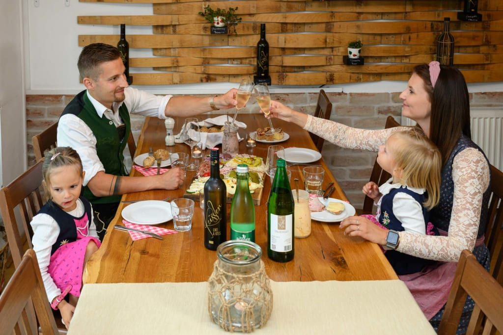• Wir bieten folgende Verpflegung am Betrieb: Frühstück, Produkte vom eigenen Hof, Halbpension, Winzerabend mit Führung, Weinverkostung, Heurigenschmankerl und Mehlspeisen