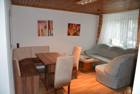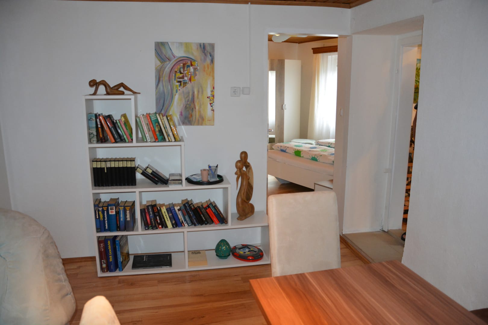 Unsere 65 m² große Ferienwohnung liegt am Fuße des Mandelstein. Die Wohnung verfügt über ein geräumiges Schlafzimmer Farb-TV und Infrarotkabine, ein gemütliches Wohnzimmer mit Gästebibliothek, SAT-TV mit Streaming-Angebot und W-Lan, eine gut ausgestattete Küche mit Kühl-Gefrierkombi, E-Herd, Holzofen, Geschirrspüler, Kaffeefiltermaschine und Espressomaschine, ausreichend Geschirr und Küchenequipment. Durch den geräumigen Vorraum kommen Sie in das Badezimmer mit Dusche und WC. Vor dem Eingang befindet sich ein gemütlicher Grillplatz samt Liegewiese. Ein romantischer kleiner Badeteich der auch von Hunden genutzt werden kann befindest sich in ca. 30 Gehminuten von der Unterkunft.