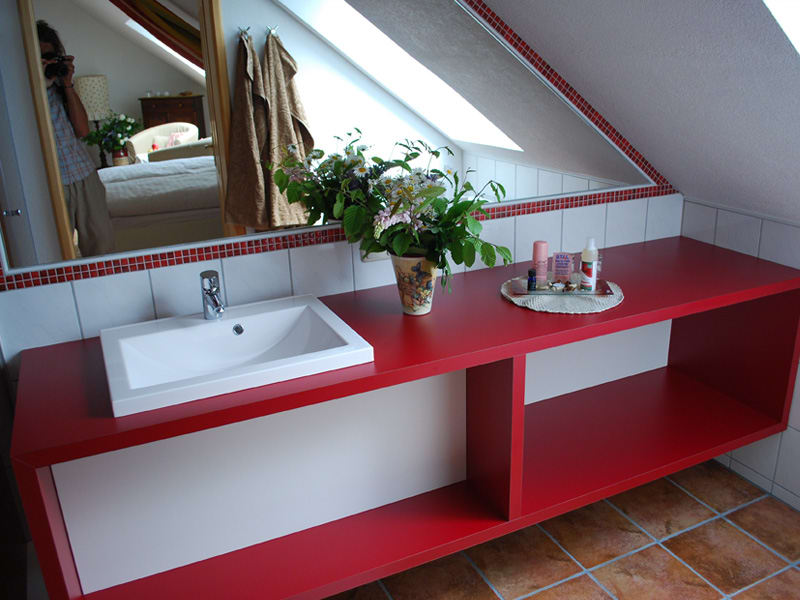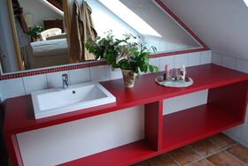Unser Genießerzimmer hat den Namen Kiebitz im Abendrot. Von hier aus kann man malerische Sonnenuntergänge erleben, die Seele baumeln lassen und richtig ausspannen. Das komfortable Bad ist mit einer modernen Doppeldusche ausgestattet.