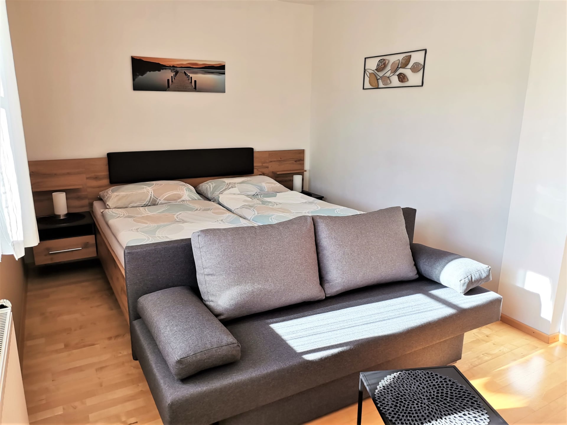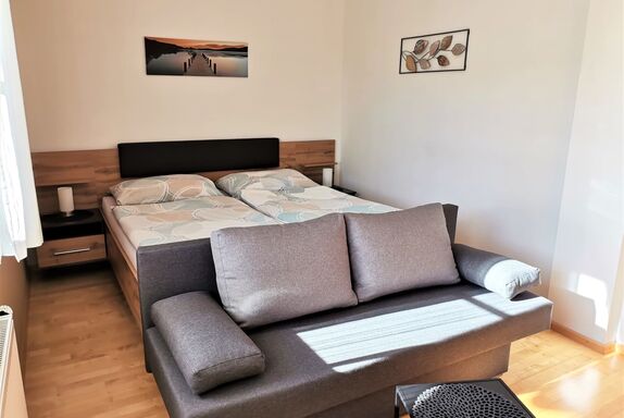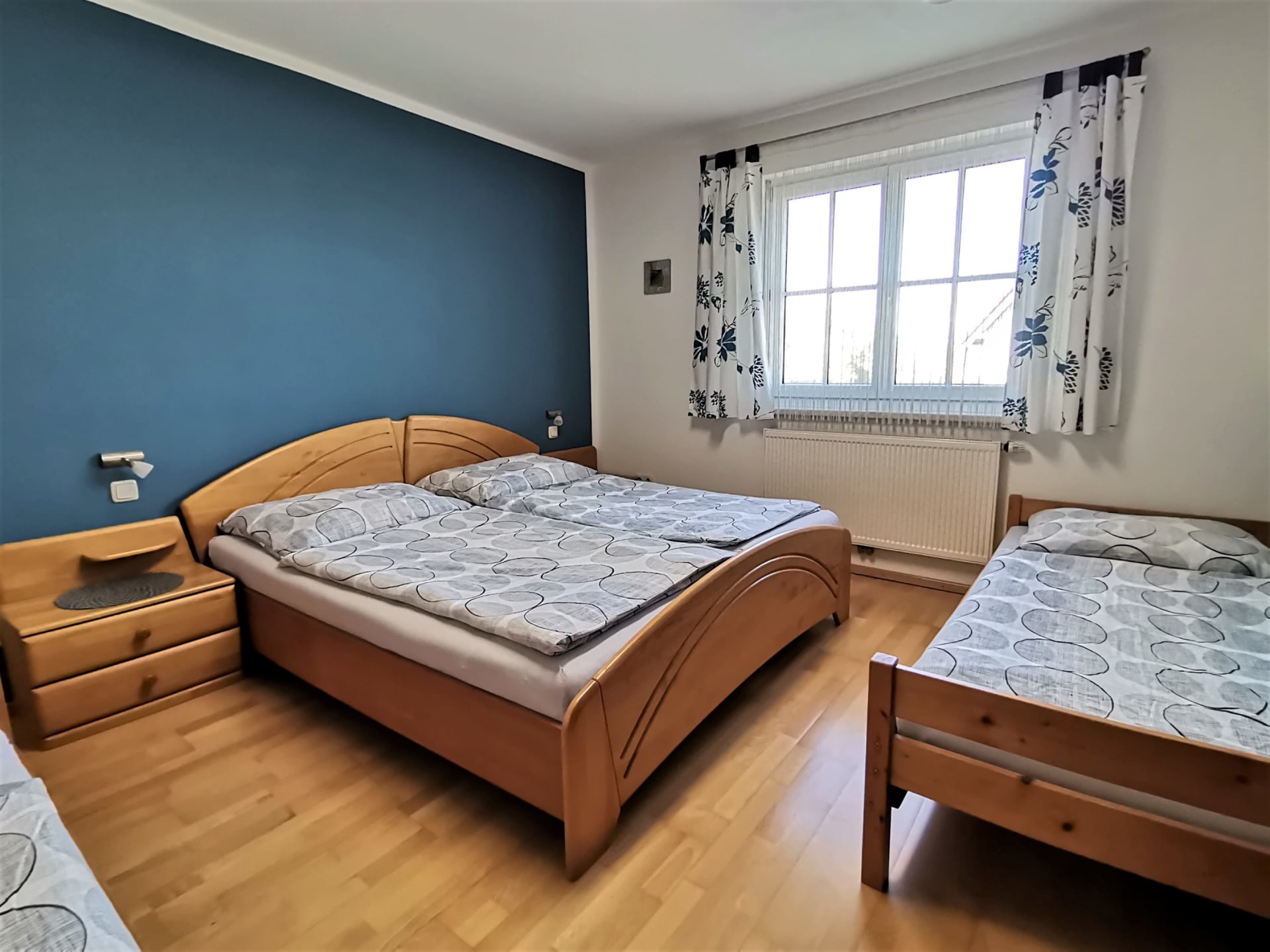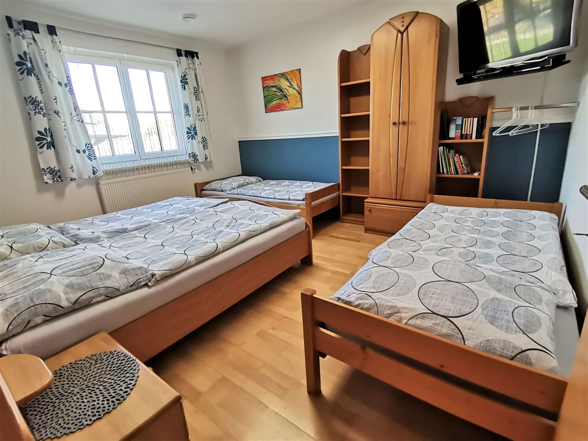 Die Ferienwohnung beinhaltet ein Doppelzimmer und ein Familienzimmer mit vier Betten.
