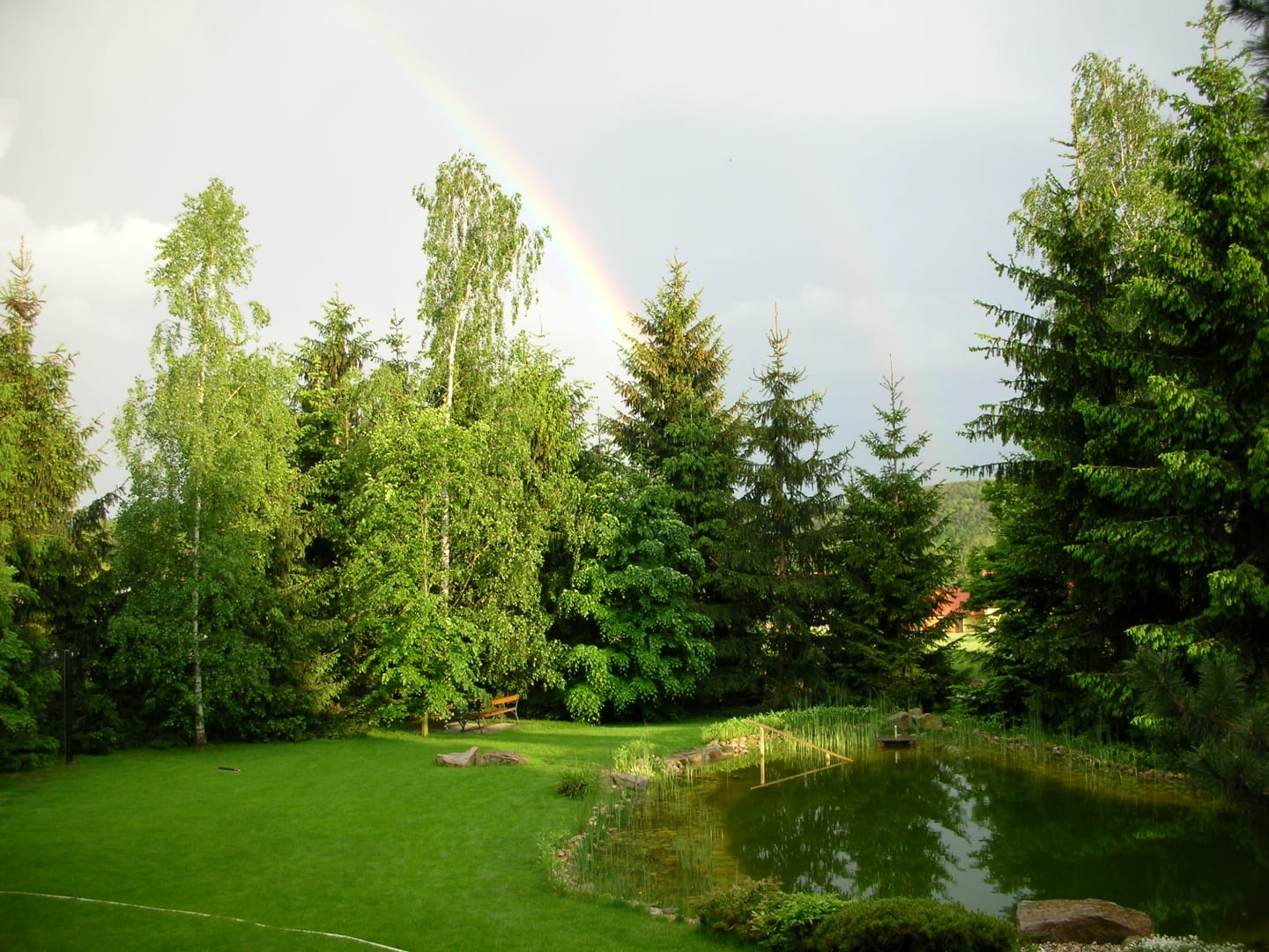 Es ist von einem großen, parkähnlichen Garten mit naturnahem Schwimmteich und Liegewiese mit Liegestühlen zur freien Benutzung umgeben.