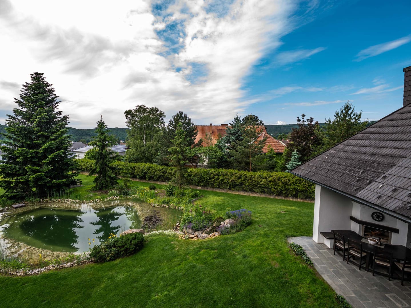 Es ist von einem großen, parkähnlichen Garten mit naturnahem Schwimmteich und Liegewiese mit Liegestühlen zur freien Benutzung umgeben.