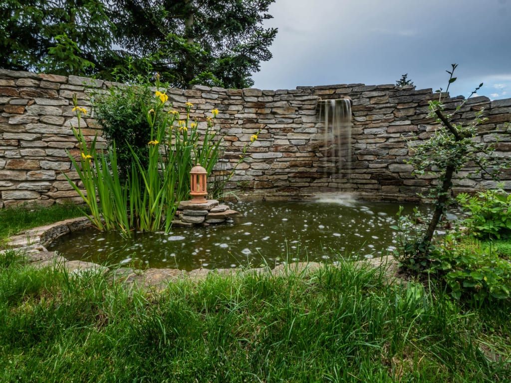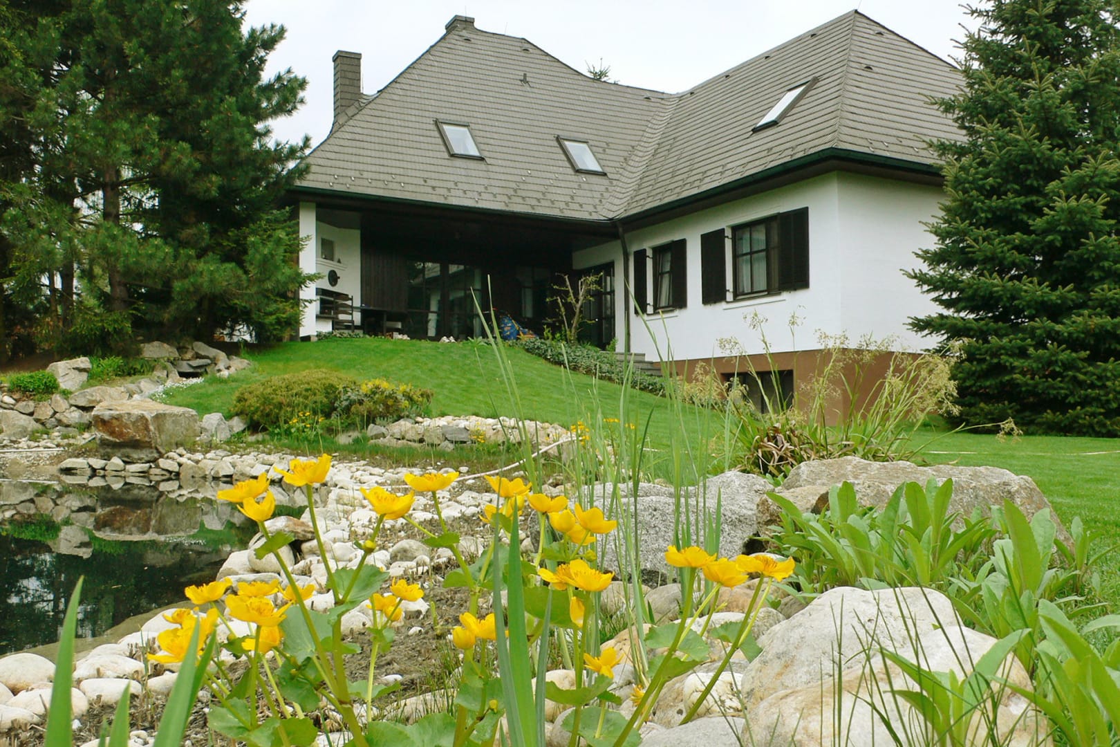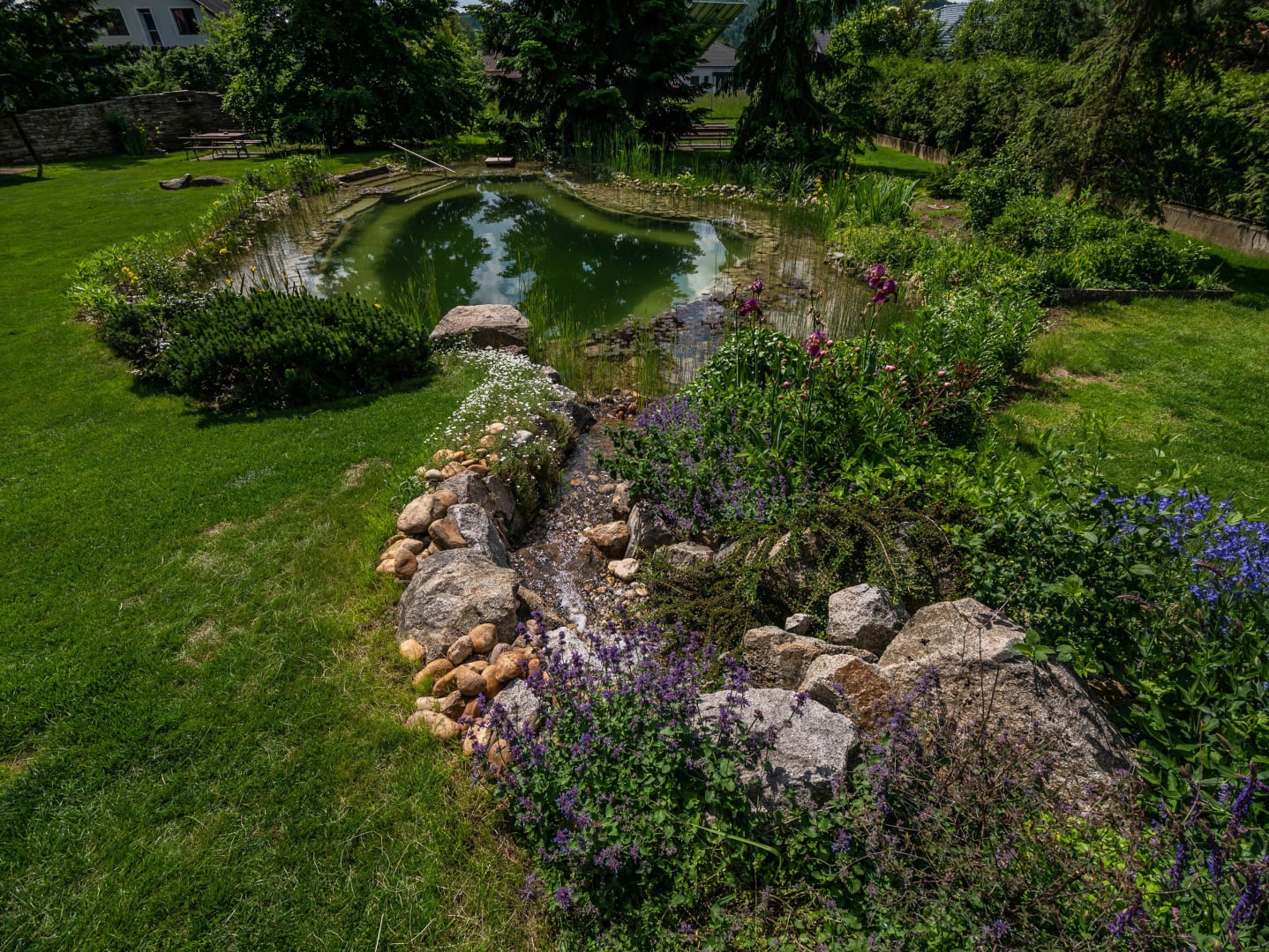Es ist von einem großen, parkähnlichen Garten mit naturnahem Schwimmteich und Liegewiese mit Liegestühlen zur freien Benutzung umgeben.