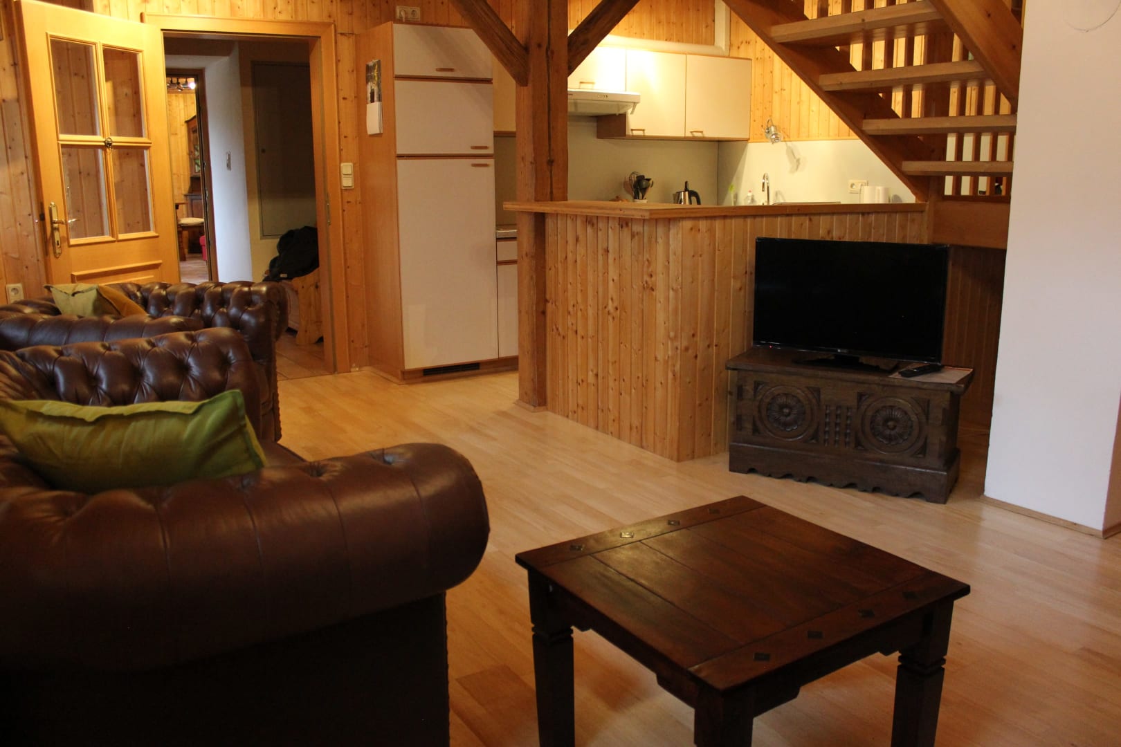 Unsere neue Ferienwohnung Jägerstube bietet auf zwei Etagen genügend Raum für größere Familien und Gruppen, alte Balken und viel Holz schaffen eine heimelige Atmosphäre.