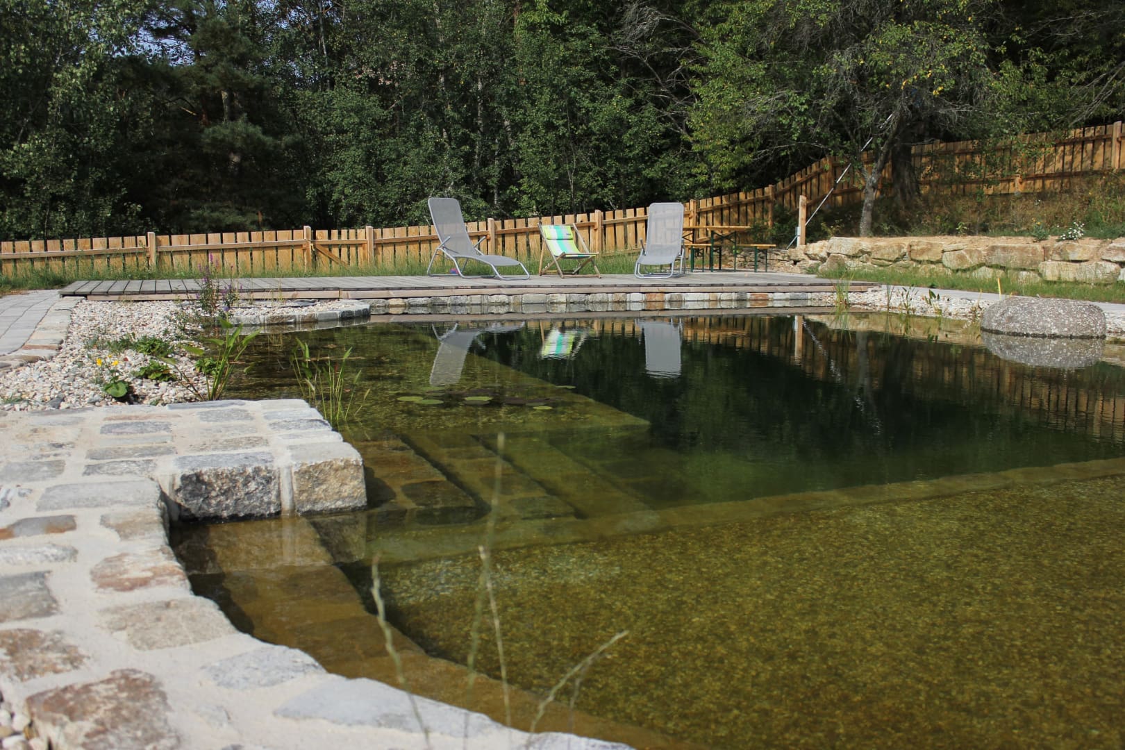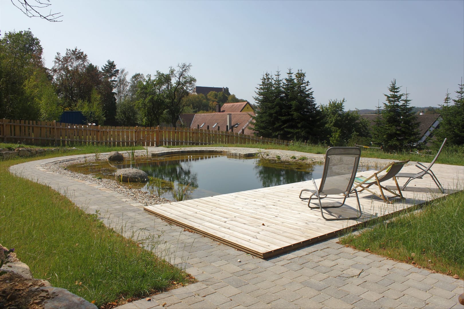 Unser neuer Schwimmteich, gut eingezäunt im äußeren Garten etwas abseits am Waldrand gelegen, verspricht Entspannung pur an heißen Sommertagen.