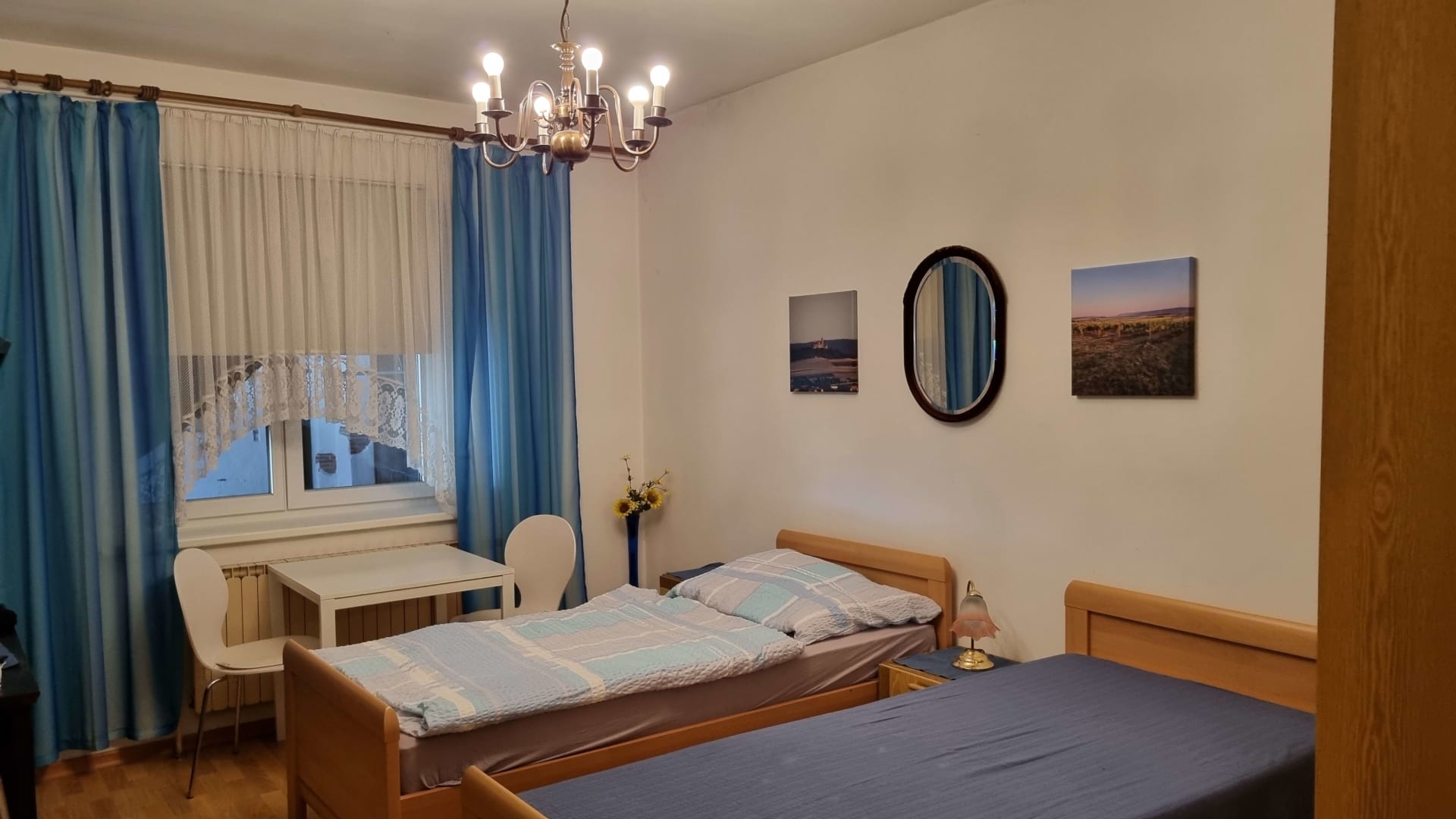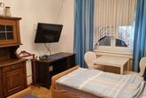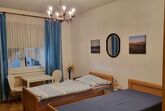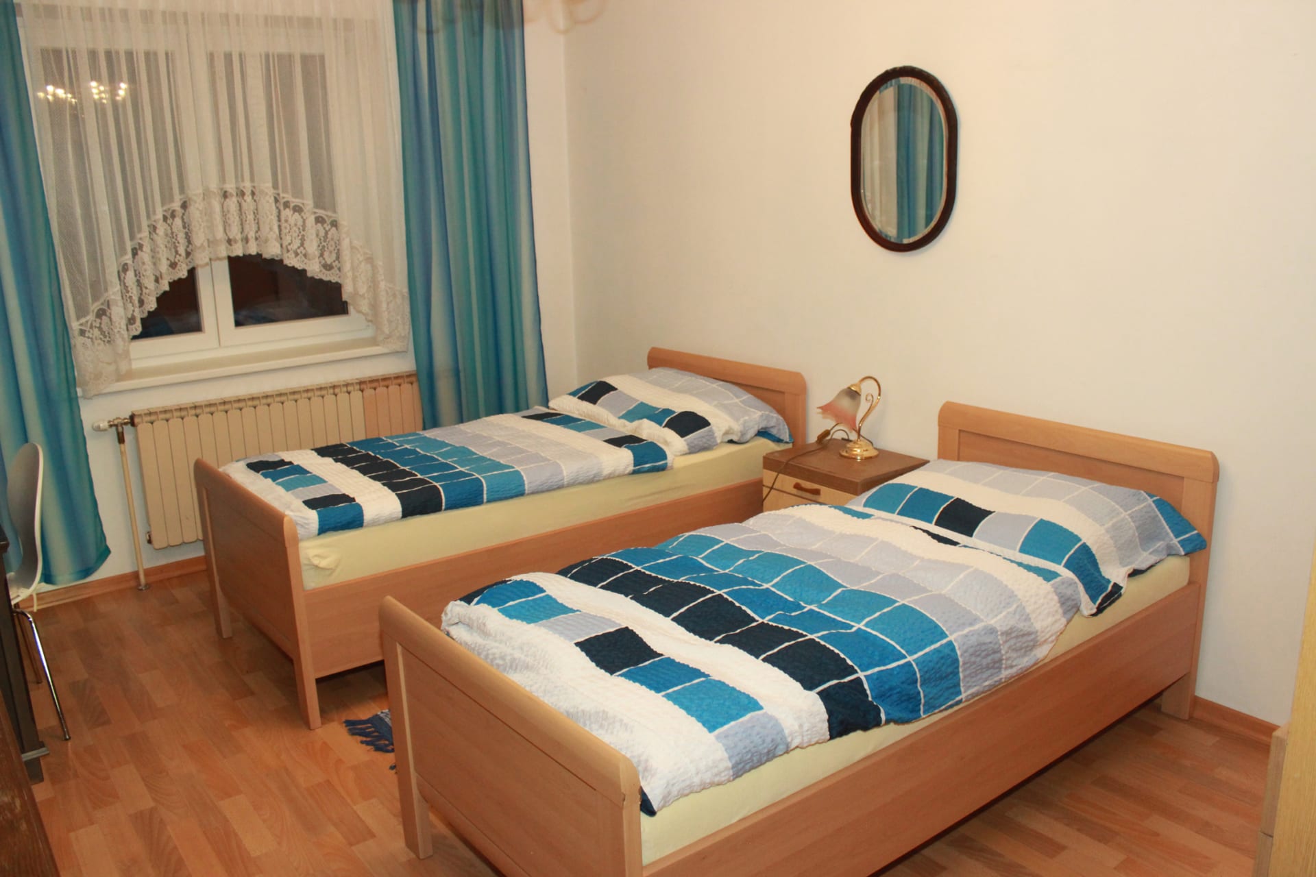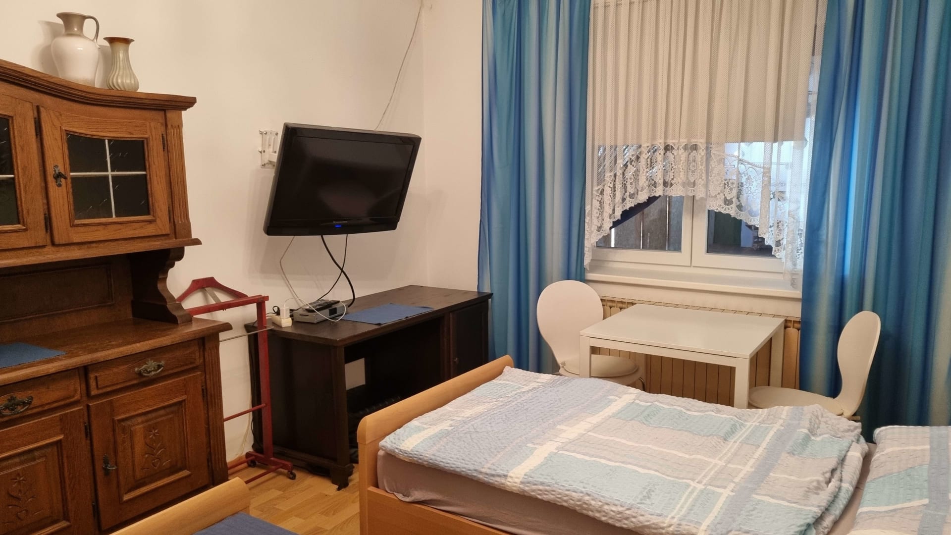 Unsere Suite 2 HINTAUS besteht aus zwei Zweibettzimmern und einem geräumigen Einbettzimmer (Bett in Überbreite 1,20m) Das große Badezimmer beinhaltet zwei Wachbecken, eine Badewanne, Dusche, WC, Waschmaschine mit Trocknerfunktion und einen Wäschetrockenständer. Die drei Zimmer sind mit SAT-TV ausgestattet. Die straßenseitigen Zimmer haben Fenster mit Außenrollläden.