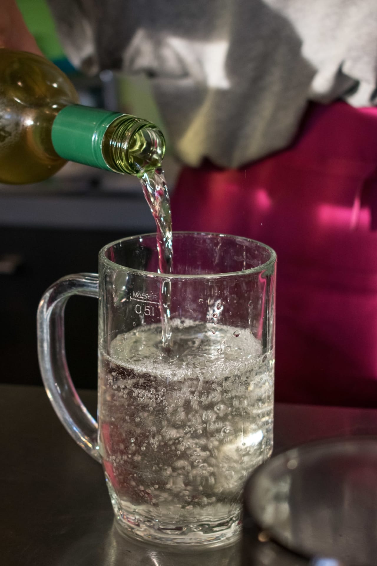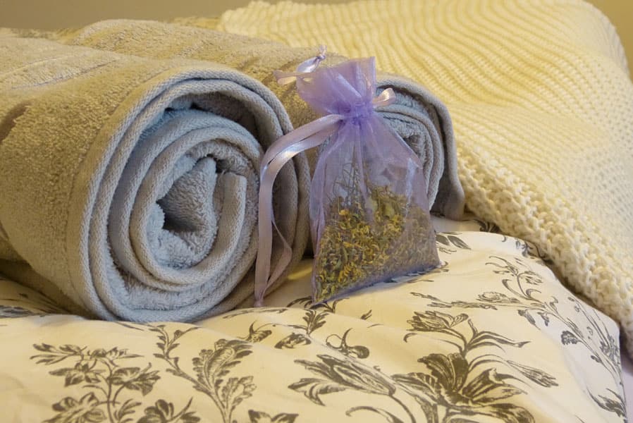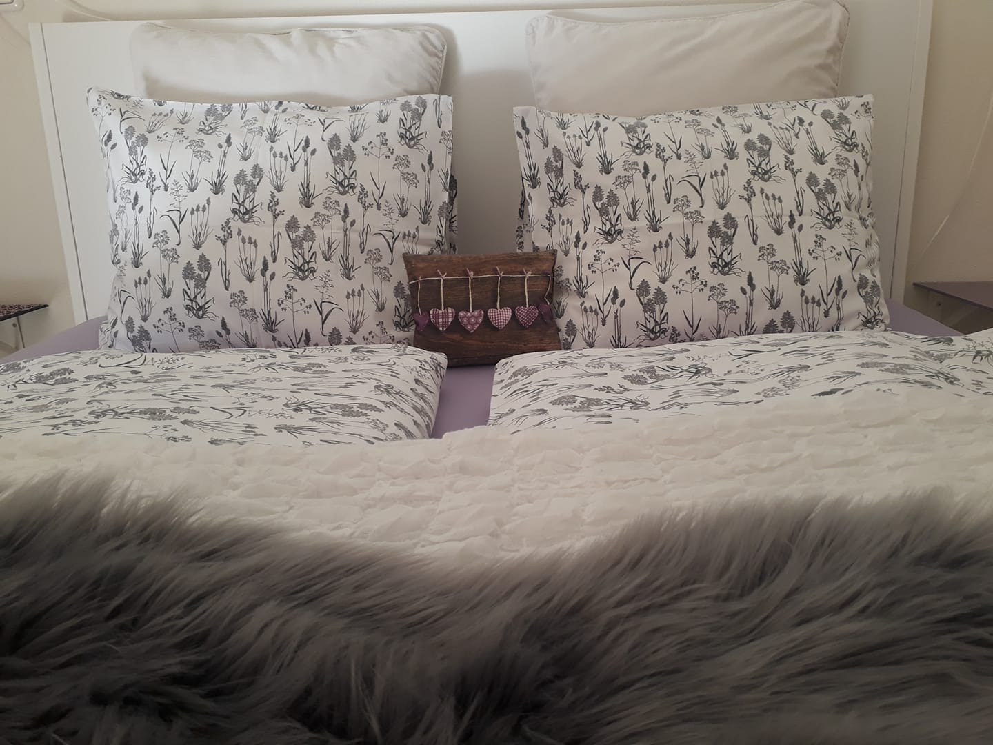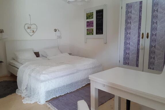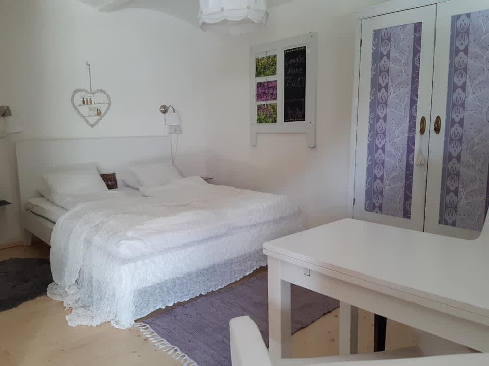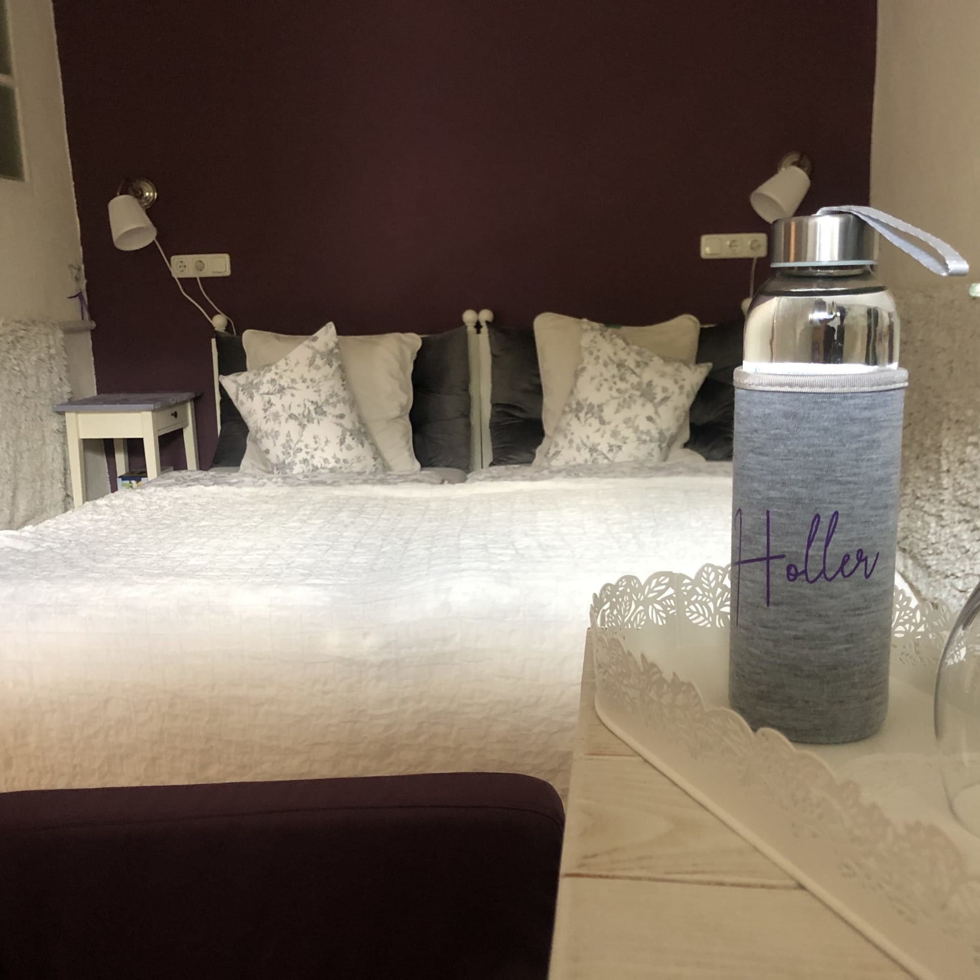 Zartes Lila als Farbakzent im Raum weist schon auf den Zimmernamen hin. Außerdem haben wir im Weingarten eine Fliederhecke, aus der wir Sirup herstellen! Zur Saison gibt es davon eine Kostprobe im Zimmer. Der alte Schrank aus Großmutters Zeiten und die moderne, lila Glaswand im Badezimmer zeigen die gelungene Verbindung von Altem und Neuem. Das Zimmer ist vom ruhigen Innenhof aus direkt begehbar. Das alte Gewölbe und dicken Außenmauern lassen dieses Zimmer im Sommer natürlich kühl bleiben.