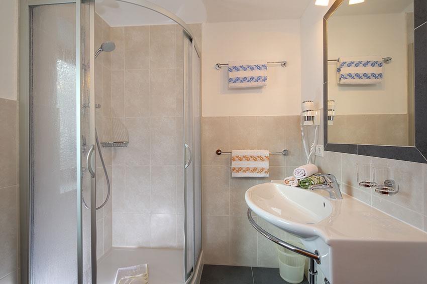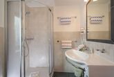 Ausstattung Badezimmer: Dusche und WC, Infrarotheizung, Hair-Body Shampoo in der Dusche, Seife am Waschbecken, Kosmetikspiegel sowie Haarfön.