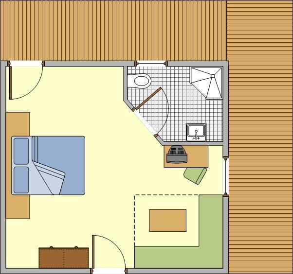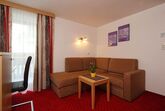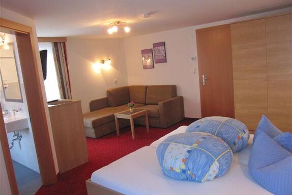 Ausstattung Zimmer: Doppelbett, Eckcouch (Schlafcouch für 1-2 Personen), Couchtisch, Flachbildschirm mit SAT-TV inkl. Radio, Radiowecker, Schreibtisch, Zimmersafe, Minikühlschrank, Wasserkocher, W-LAN (limitiertes Datenvolumen inklusive) und Terrasse.