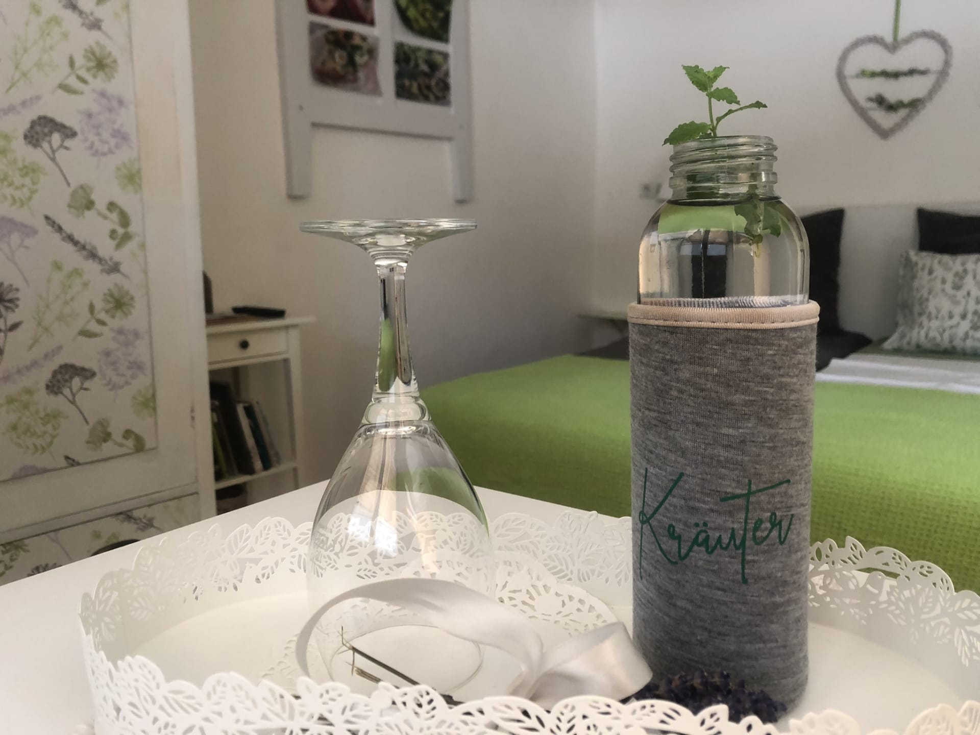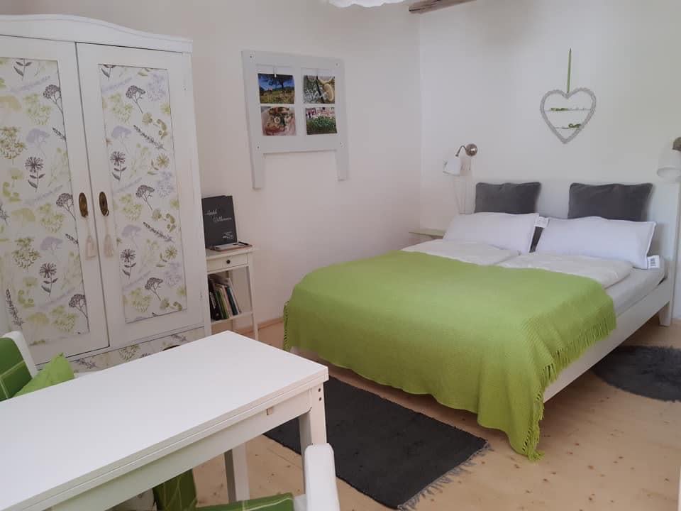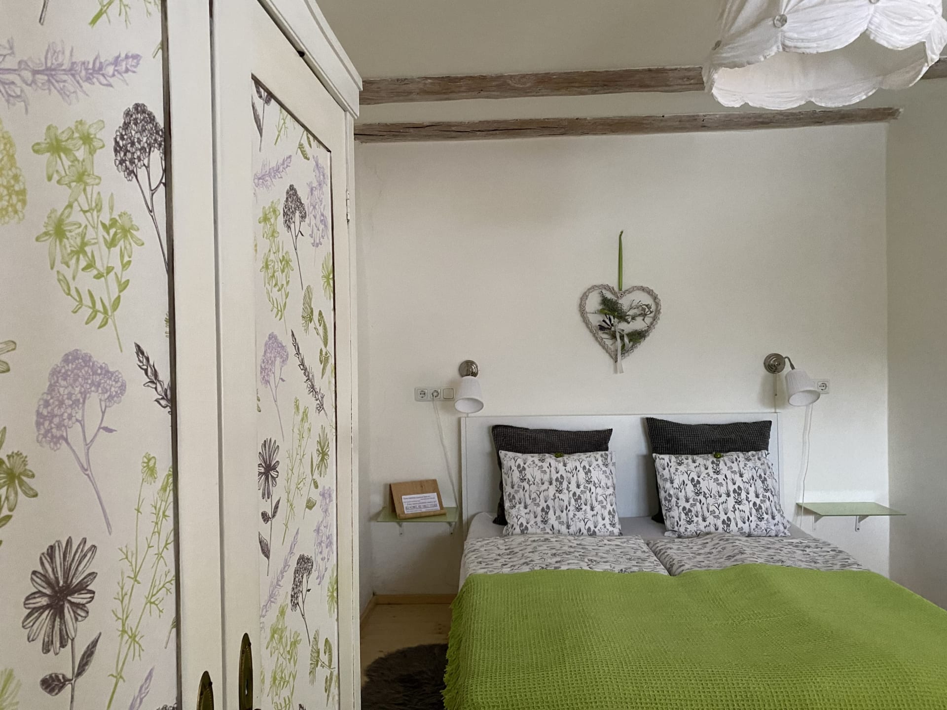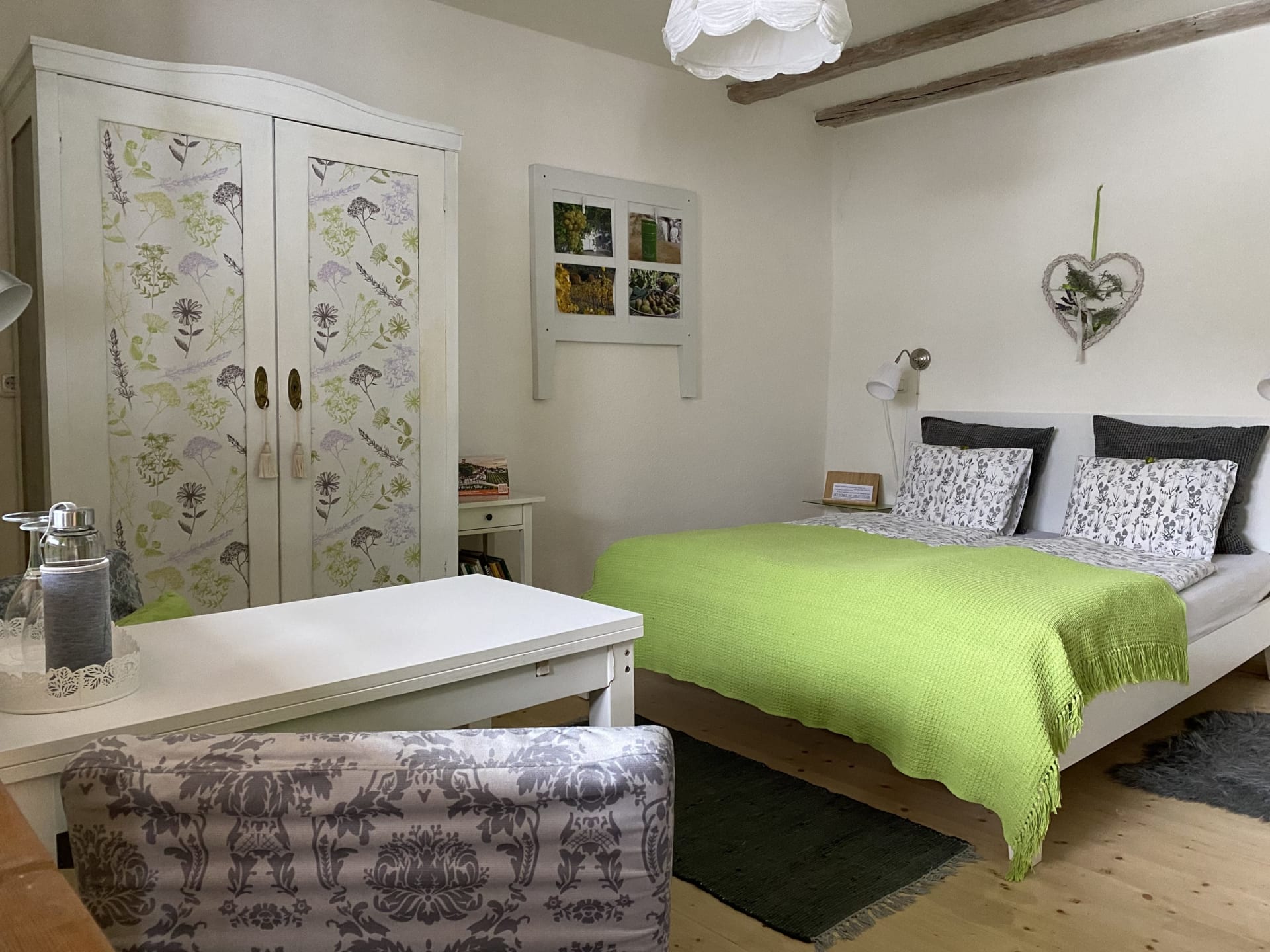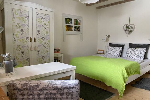 Frisches Grün als Farbakzent im Raum und eine Kräuterwanne beim Eingang des Doppelzimmers weisen schon auf den Zimmernamen hin. Der alte Schrank aus Großmutters Zeiten und die moderne, grüne Glaswand im Badezimmer zeigen die gelungene Verbindung von Altem und Neuem. Das Zimmer ist vom ruhigen Innenhof aus direkt begehbar. Der Blick aus dem Zimmer geht über den überdachten Bereich vom Eingang über den Garten bis zur großen, schönen Dorfkirche.