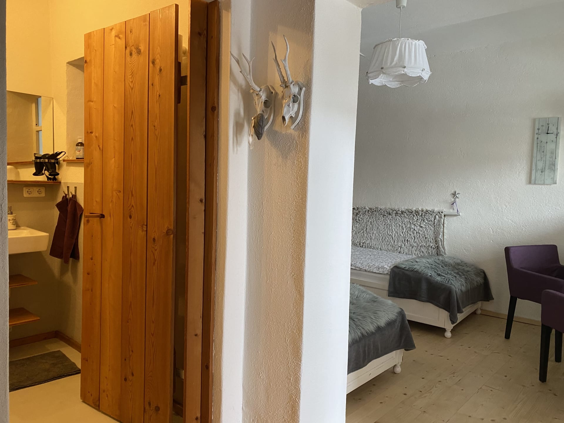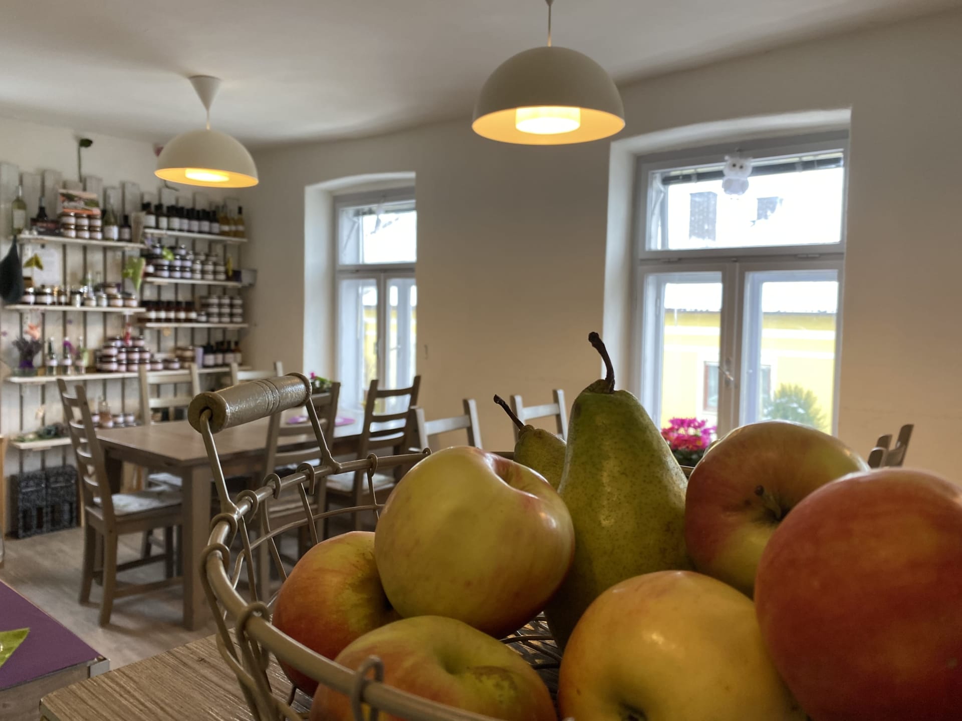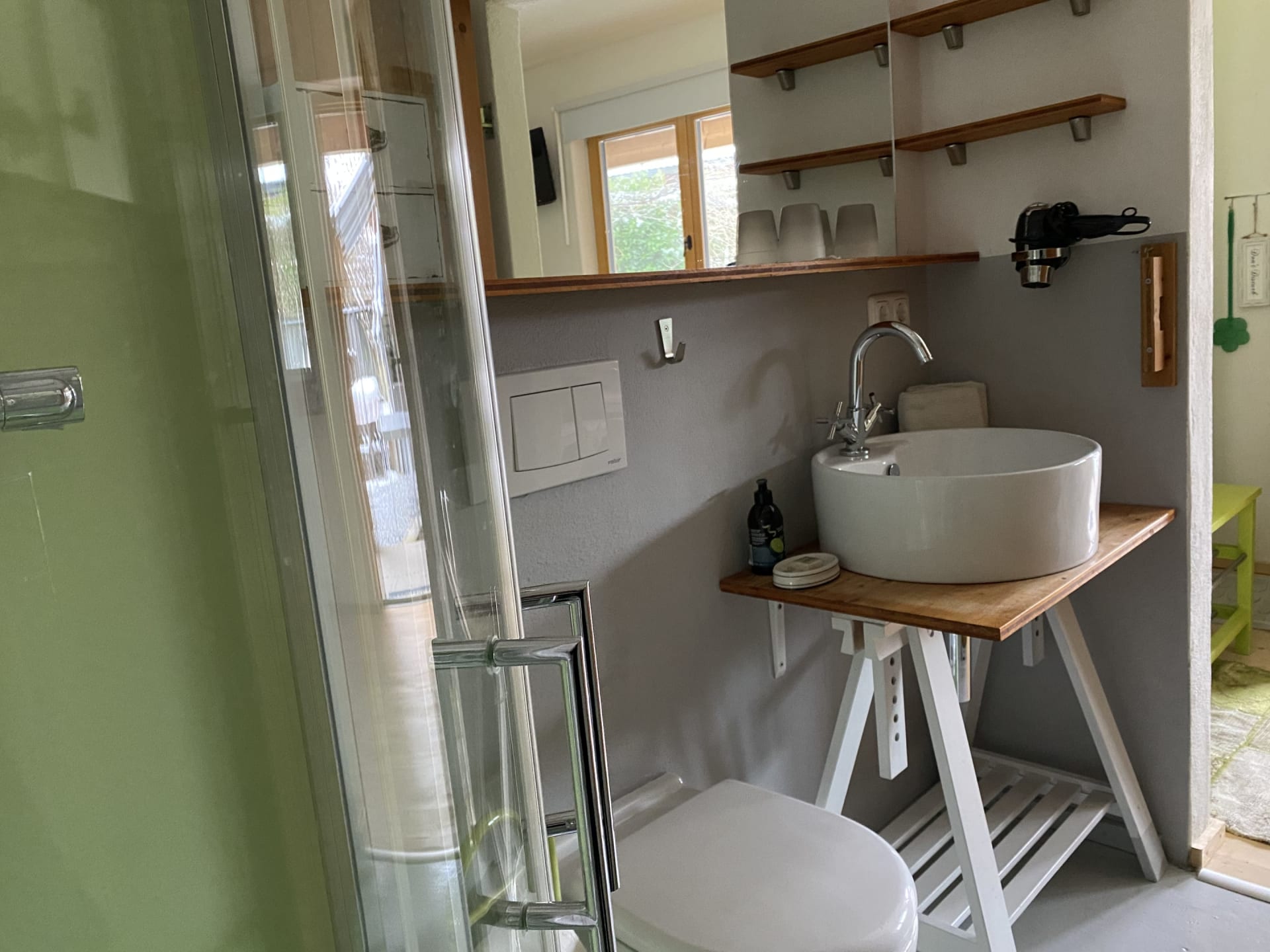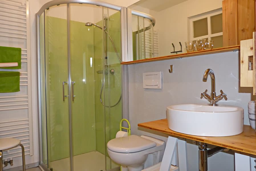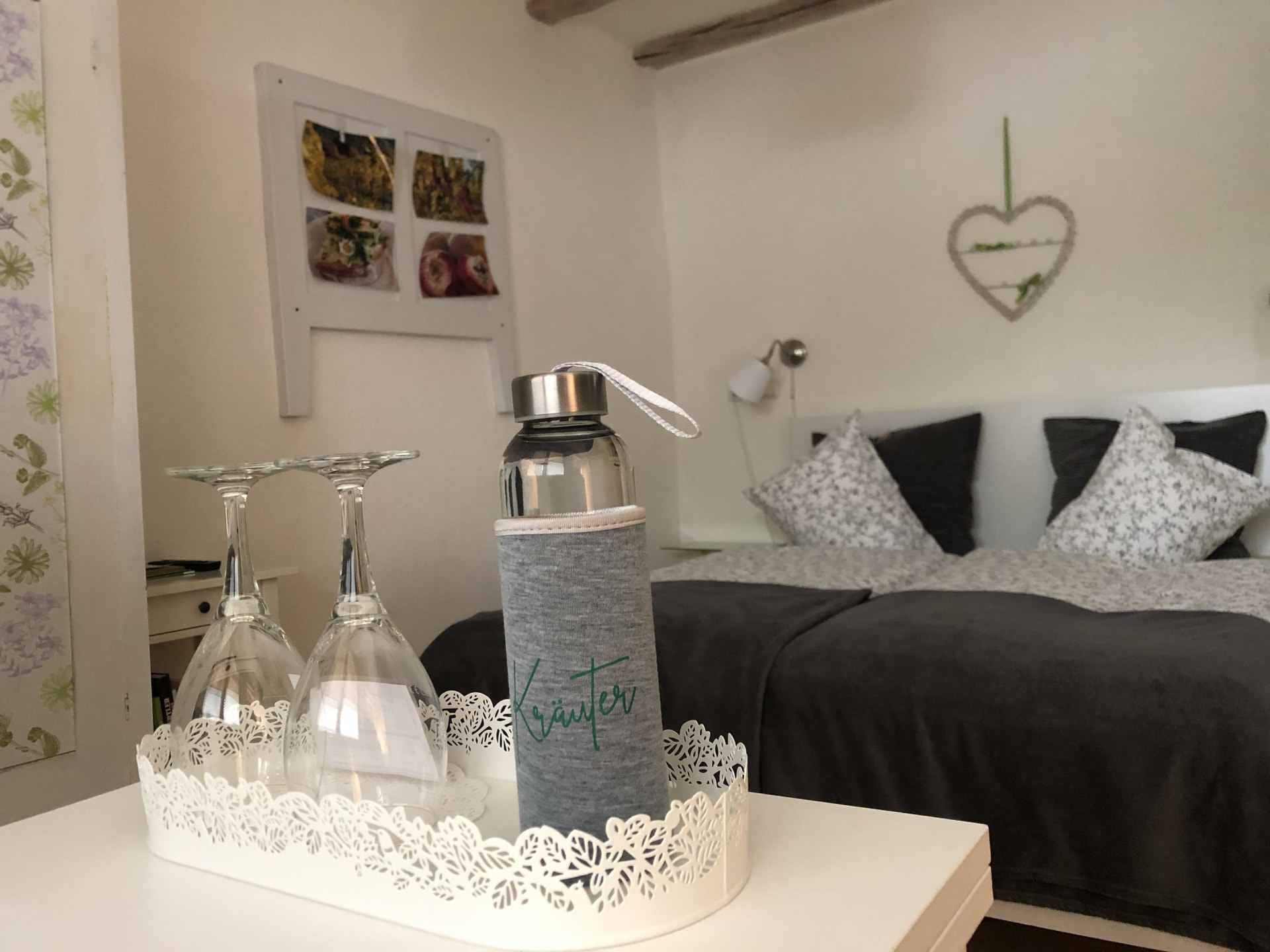 Frisches Grün als Farbakzent im Raum und eine Kräuterwanne beim Eingang des Doppelzimmers weisen schon auf den Zimmernamen hin. Der alte Schrank aus Großmutters Zeiten und die moderne, grüne Glaswand im Badezimmer zeigen die gelungene Verbindung von Altem und Neuem. Das Zimmer ist vom ruhigen Innenhof aus direkt begehbar. Der Blick aus dem Zimmer geht über den überdachten Bereich vom Eingang über den Garten bis zur großen, schönen Dorfkirche.