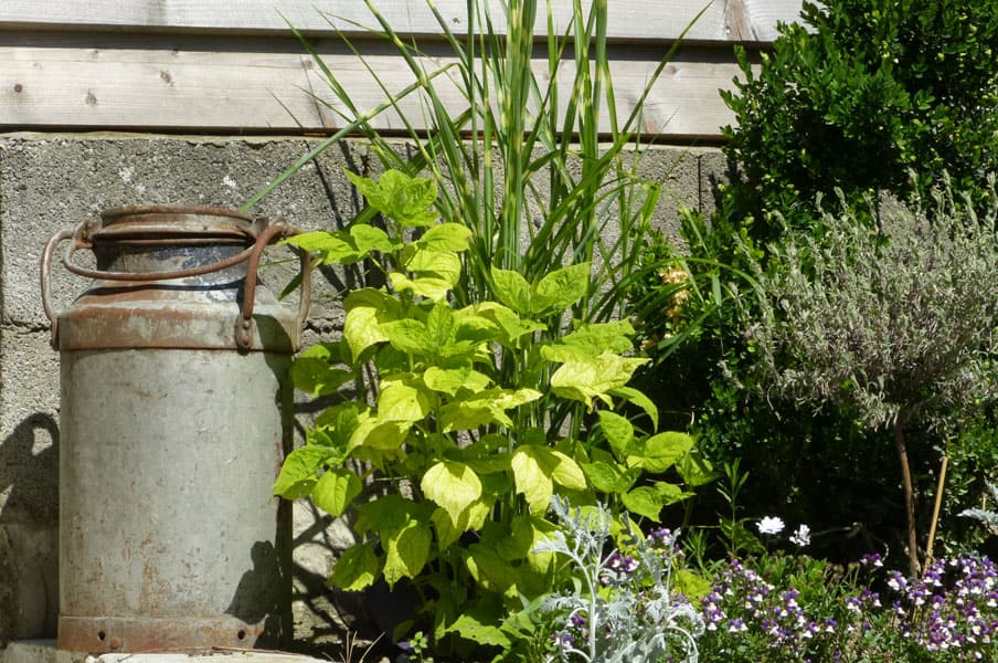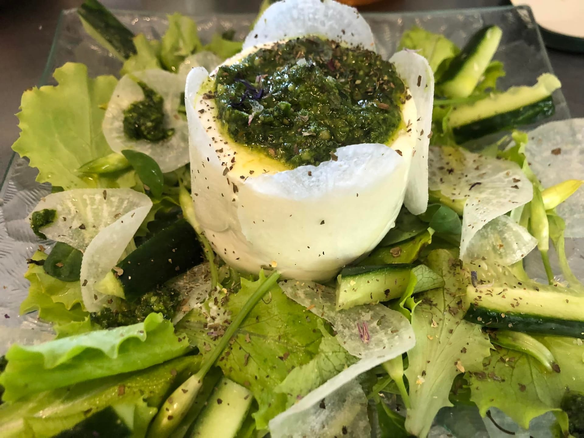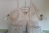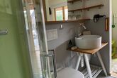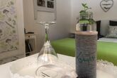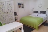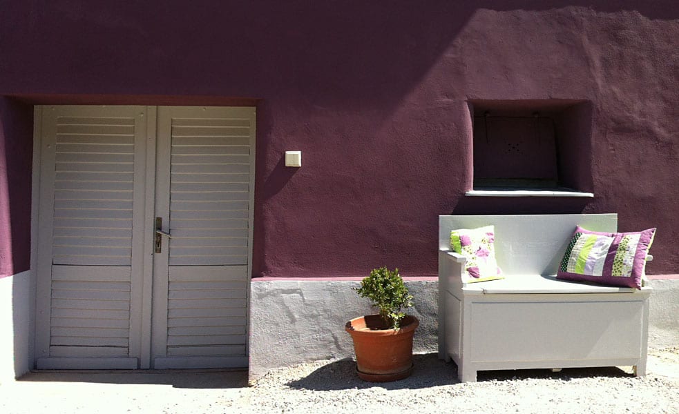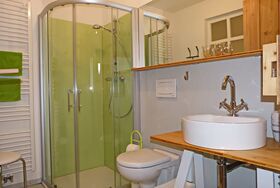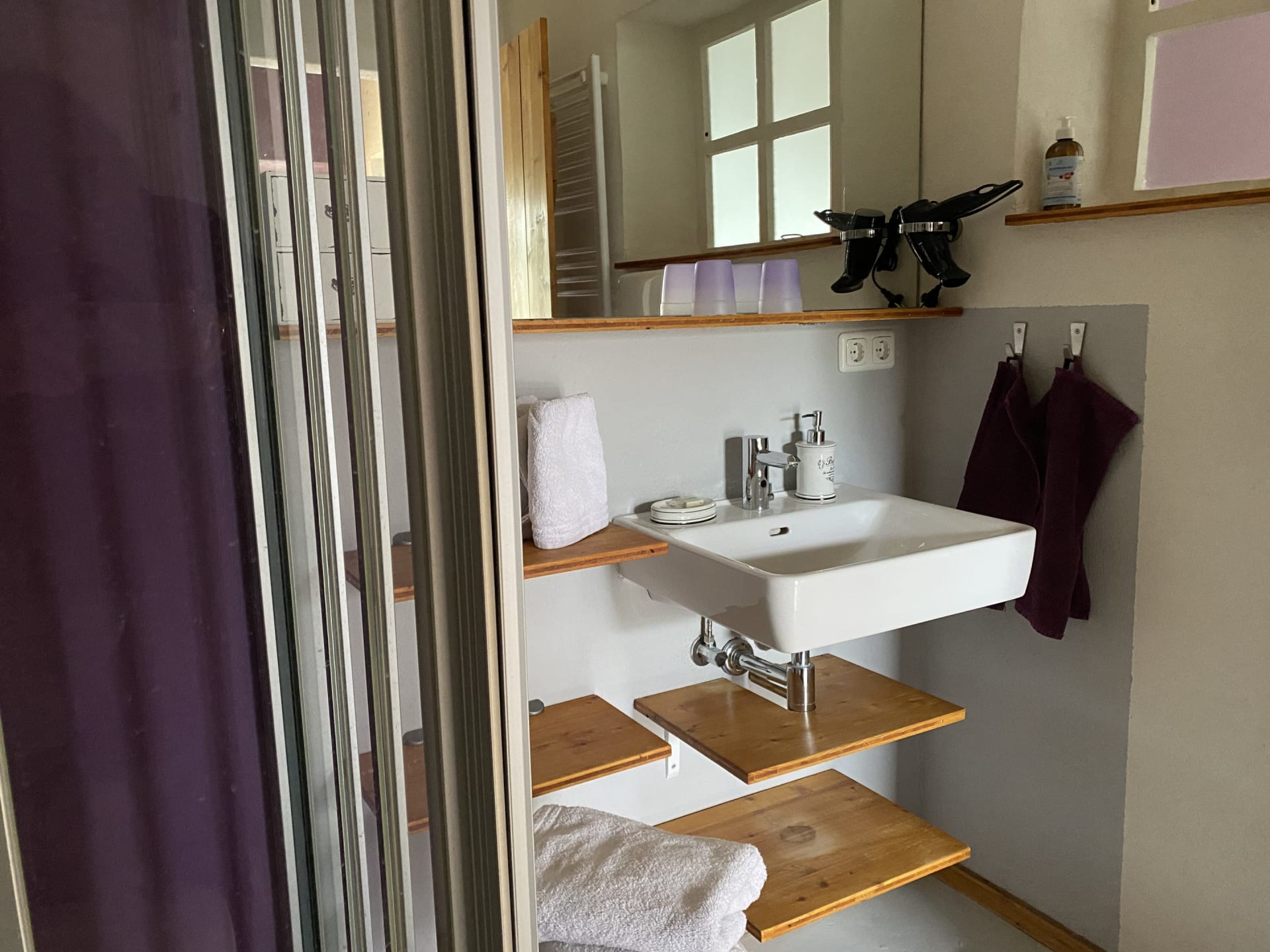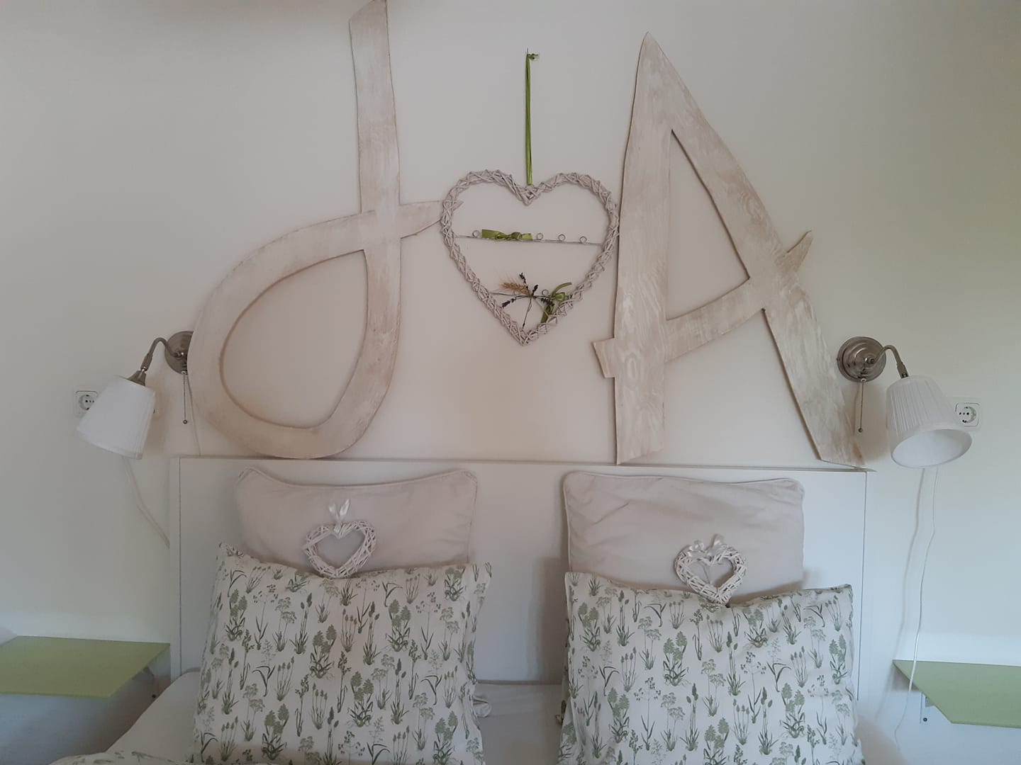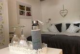 Frisches Grün als Farbakzent im Raum und eine Kräuterwanne beim Eingang des Doppelzimmers weisen schon auf den Zimmernamen hin. Der alte Schrank aus Großmutters Zeiten und die moderne, grüne Glaswand im Badezimmer zeigen die gelungene Verbindung von Altem und Neuem. Das Zimmer ist vom ruhigen Innenhof aus direkt begehbar. Der Blick aus dem Zimmer geht über den überdachten Bereich vom Eingang über den Garten bis zur großen, schönen Dorfkirche.