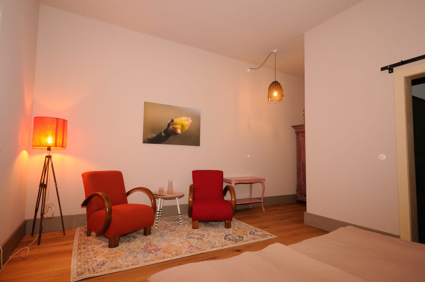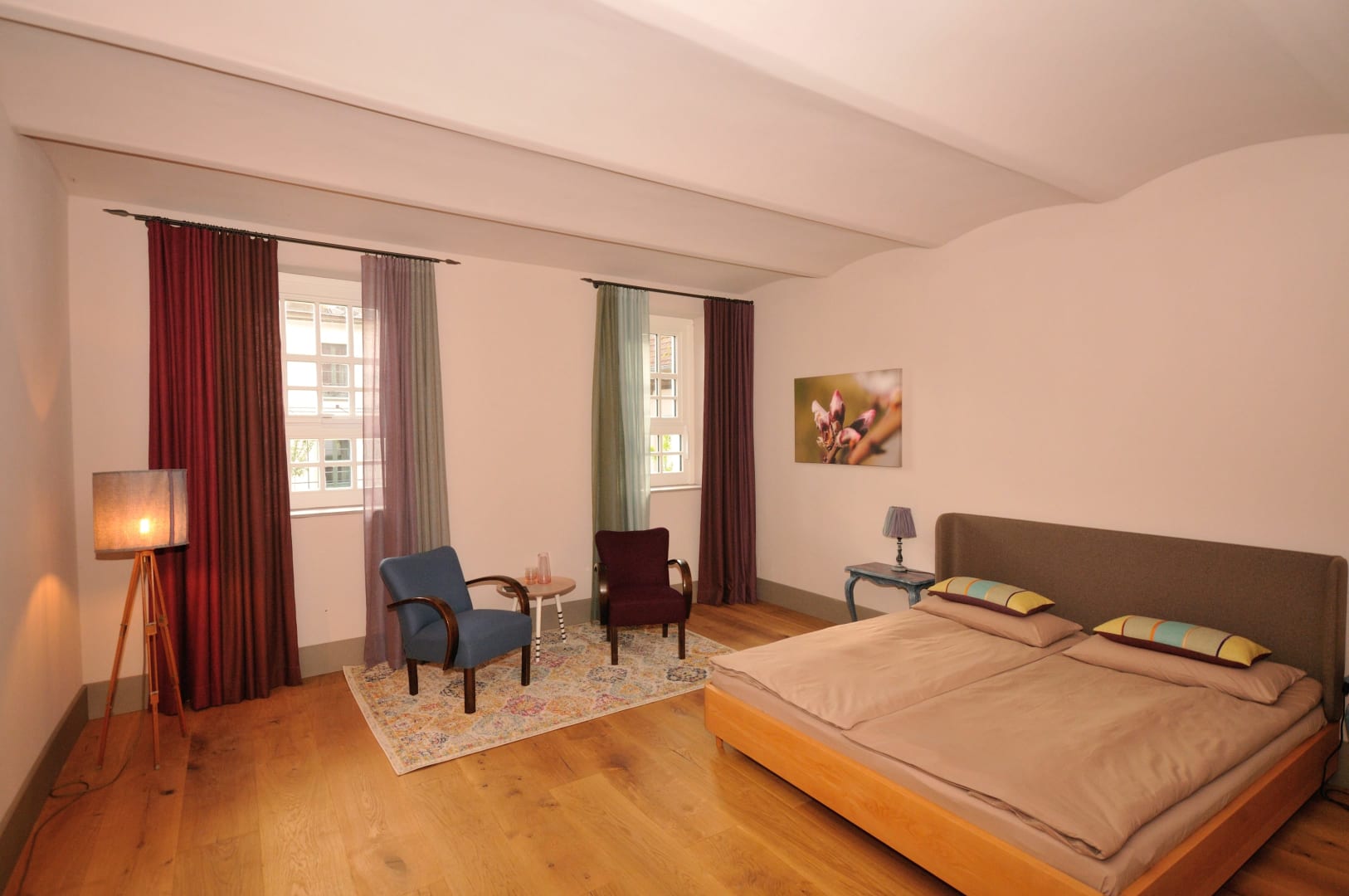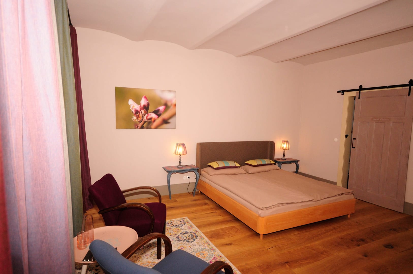 Wir haben bei der Gestaltung unserer Zimmer harmonische Farben gewählt, die gemütlichen Betten sind aus Naturmaterialien und von Grüner Erde. Lehmputz an den Wänden sorgt für ein gutes Raumklima und die geräumige Dusche sorgt für die richtige Entspannung nach sportlichen Aktivitäten
