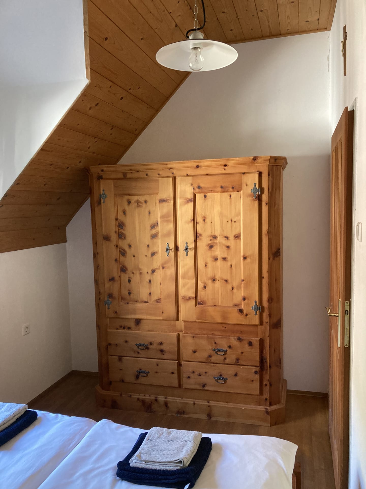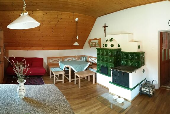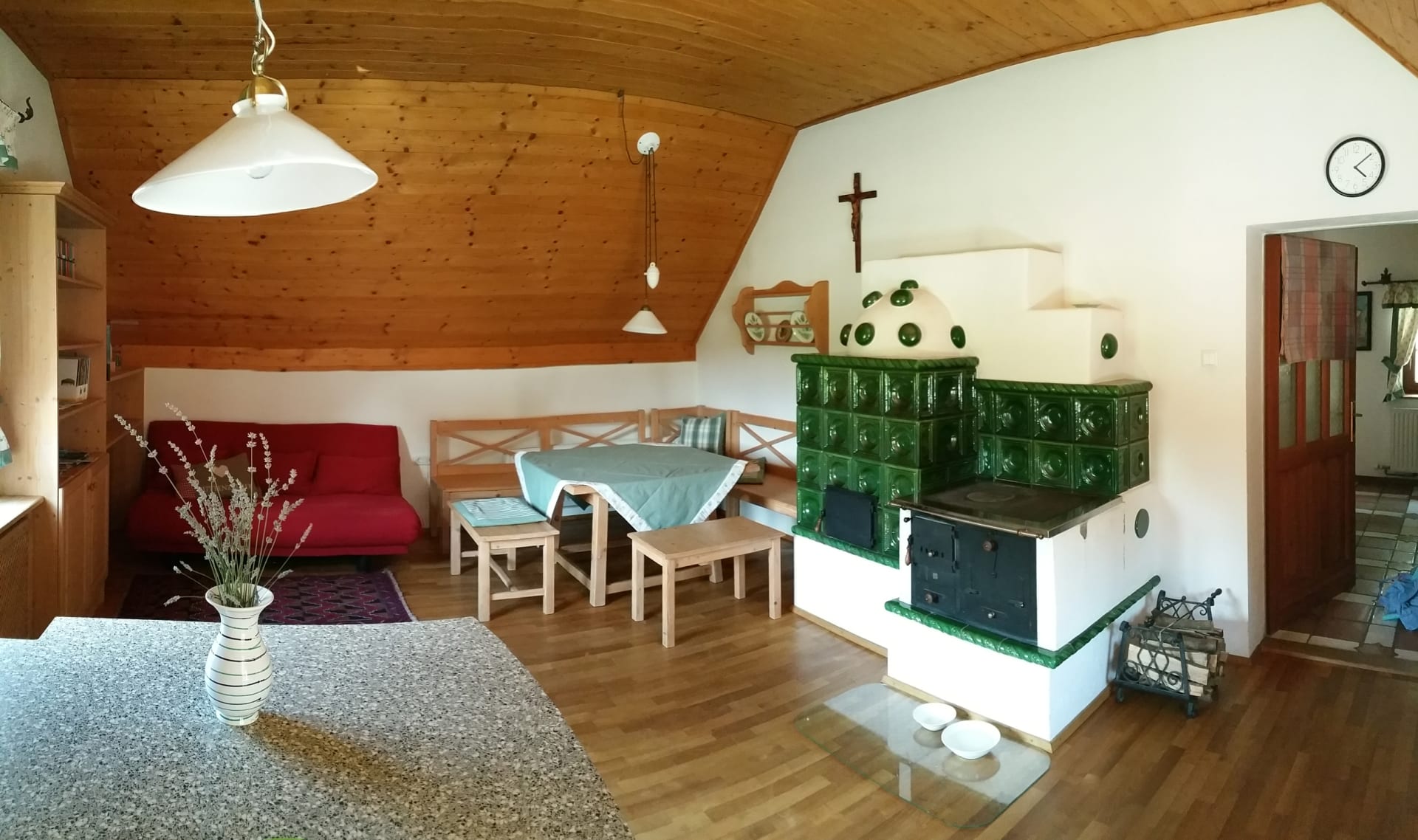 Die 56 m² große Wohnung ist mit einer komplett eingerichteten Wohnküche ausgestattet. Zusätzlich zur Zentralheizung können der Holz- und der Kachelofen eingeheizt werden, Holz steht zur Verfügung. Das Zimmer mit einem Doppelbett und einem geräumigem Kasten aus Zirbenholz bietet ein sehr angenehmes Raumklima, im Badezimmer befinden sich Dusche und WC.