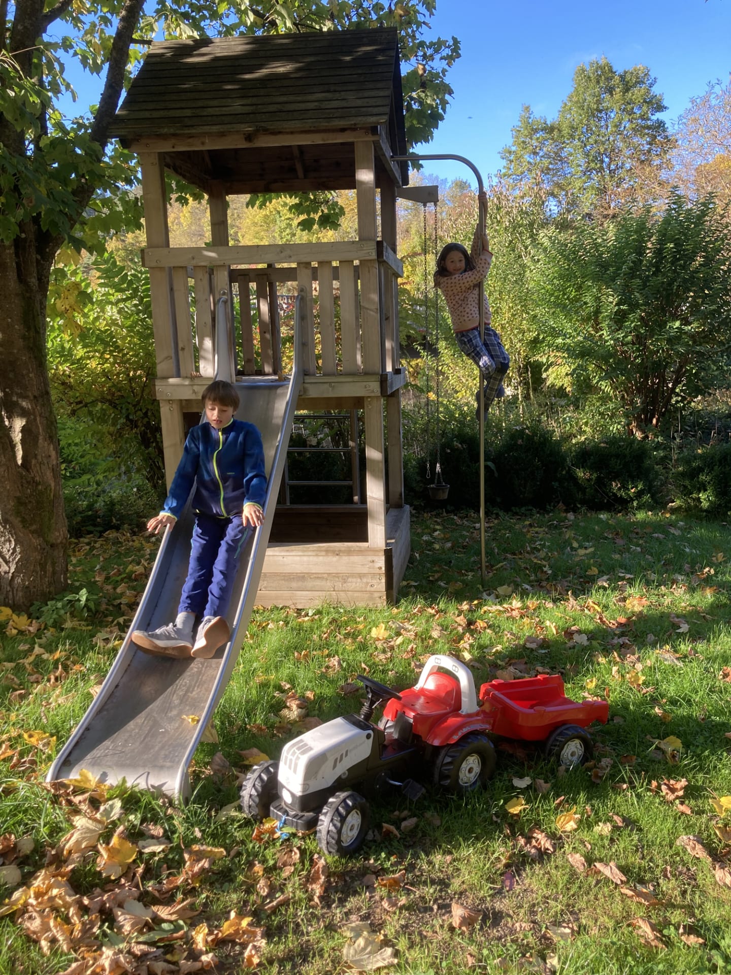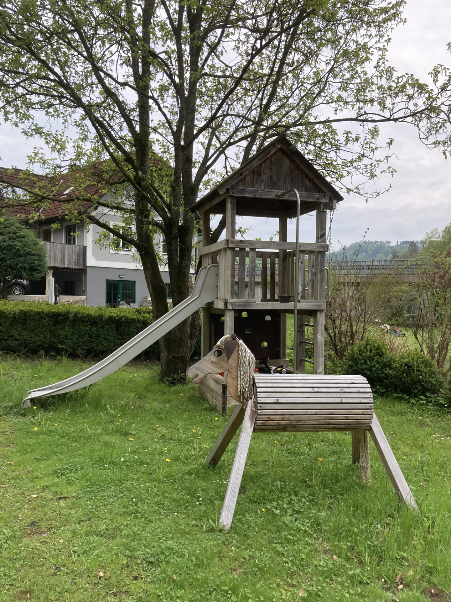 Unsere ruhige Lage außerhalb der Ortschaft bietet die Möglichkeit für Spaziergänge. Der Garten bietet Erholung und Entspannung, ein Kletterturm mit Rutsche und viel Spielzeug warten auf die Kinder.