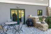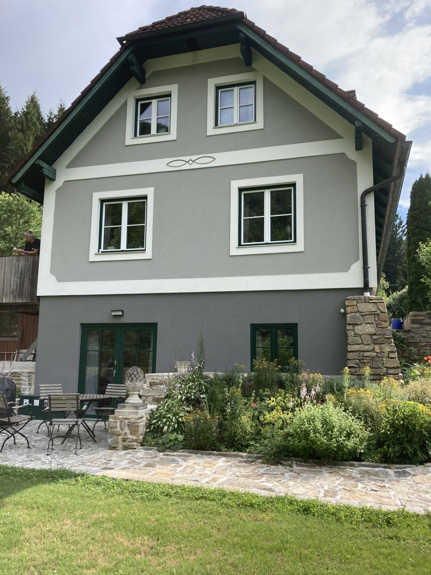 Auf der Terrasse befindet eine Sitzgarnitur und ein Holzkohlengrill.