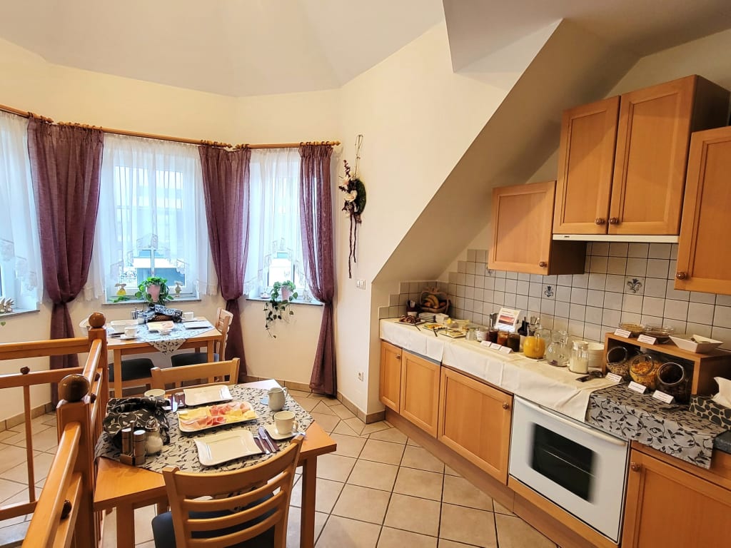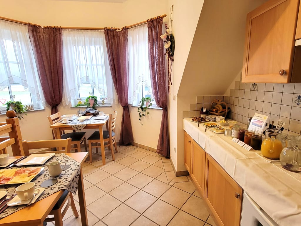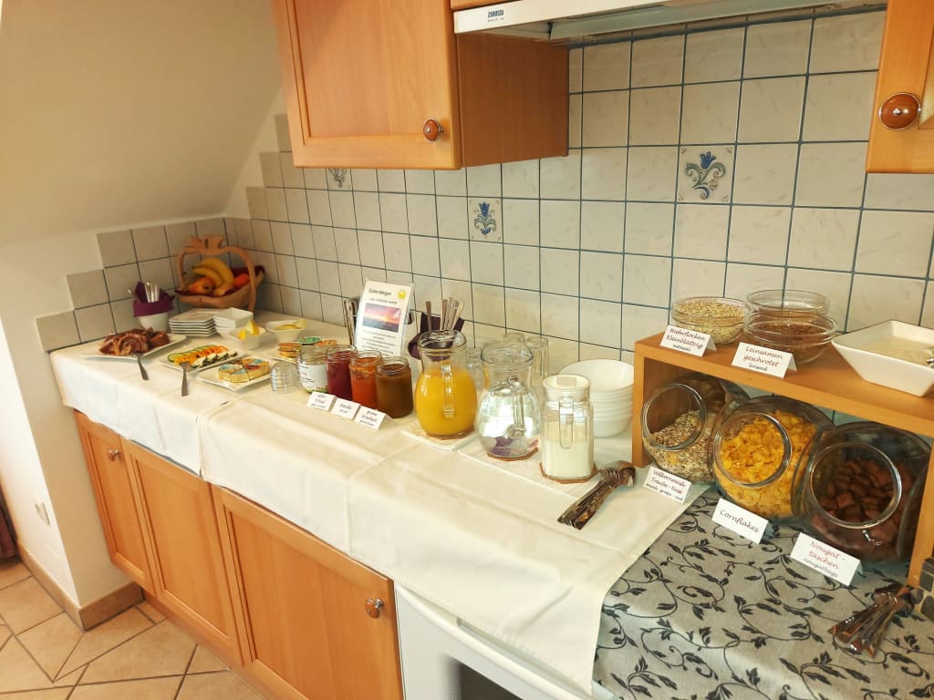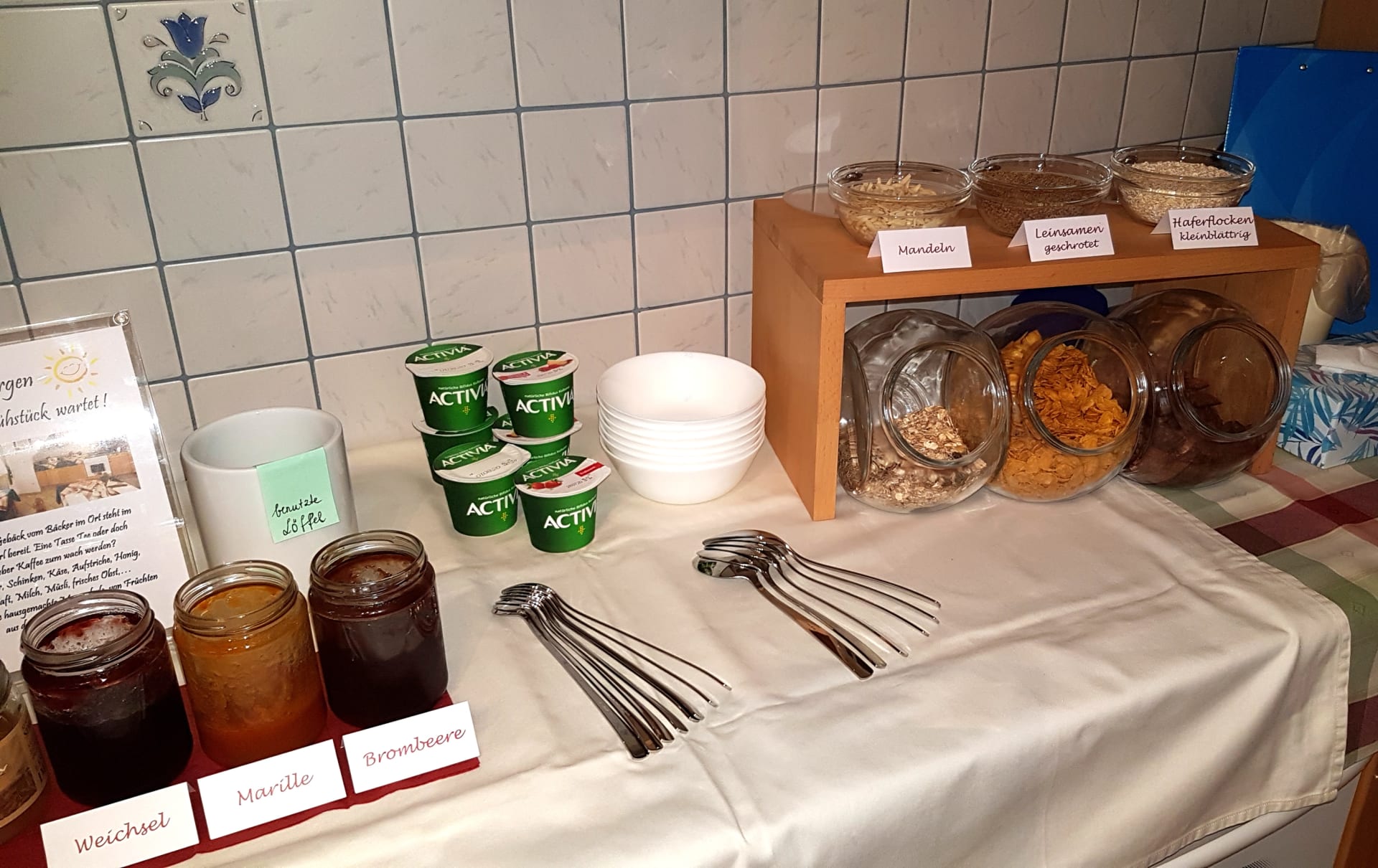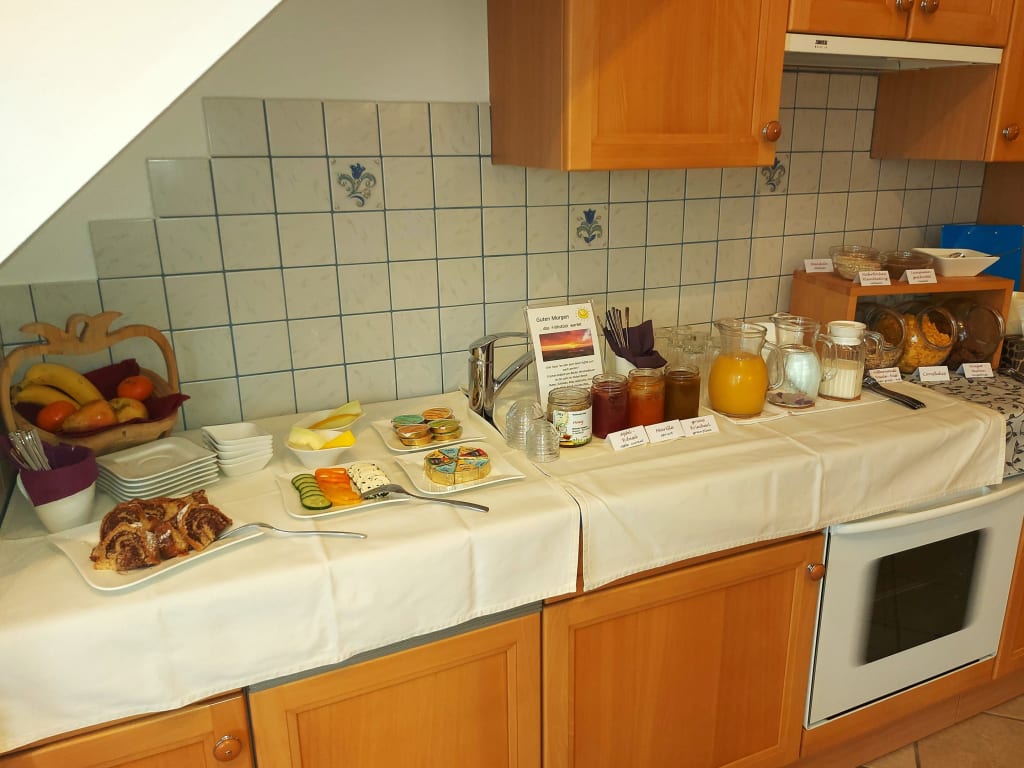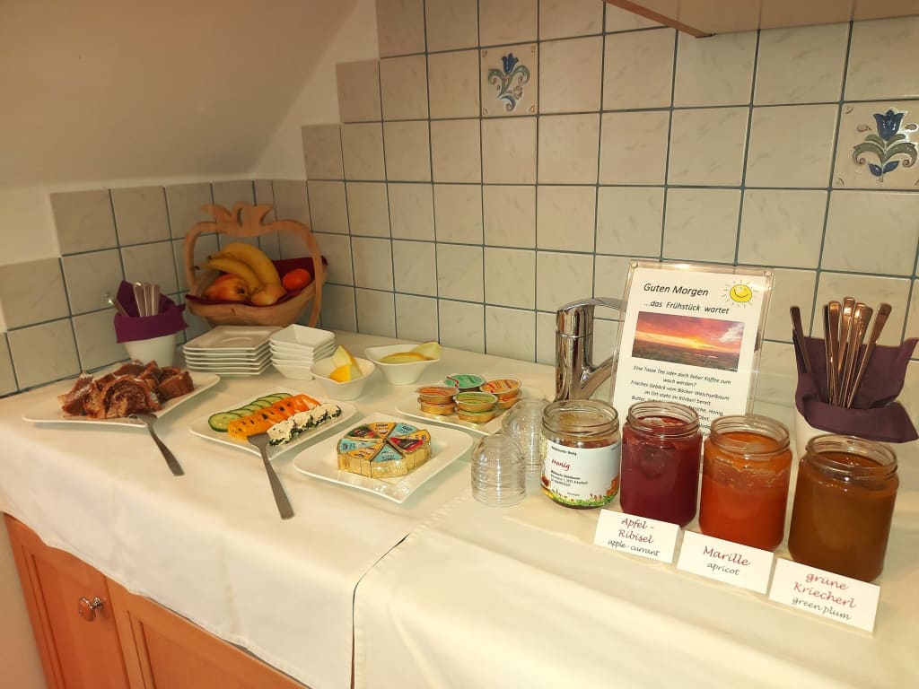 Am Morgen erwartet sie ein reichhaltiges Frühstück mit Schinken, Käse, hausgemachter Marmelade, Müsli, Fruchtsaft, Obst und manchem mehr.