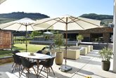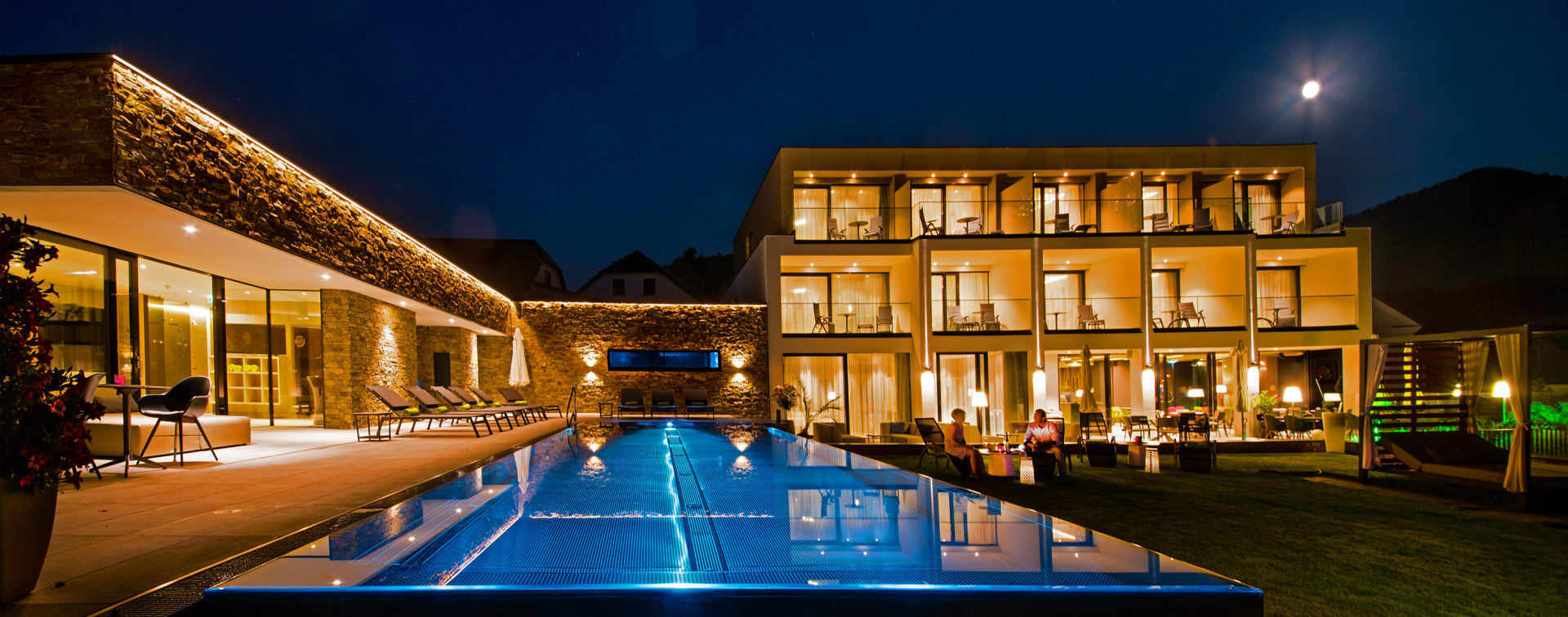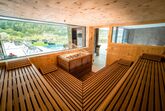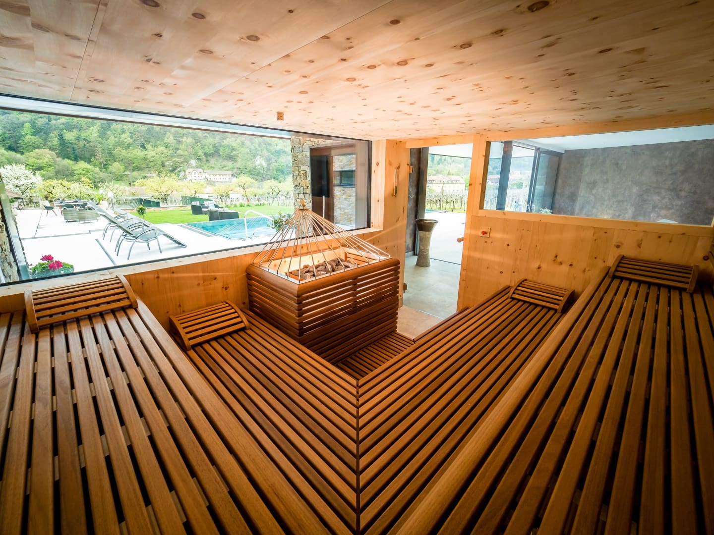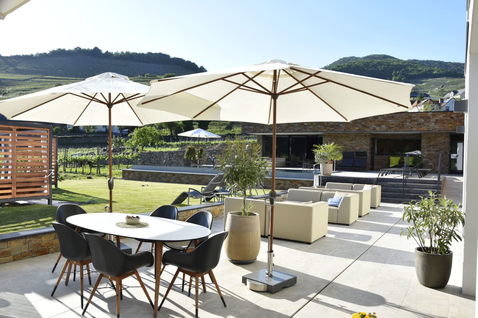 Zum Verweilen und Erholen inmitten der traumhaften Kulisse der Wachauer Weinberge laden ein großzügiger beheizbarer Edelstahl-Infinity-Pool und ein Saunahaus mit einer Sauna und eine Infrarotkabine im Garten, sowie ein idyllischer Loungebereich mit herrlichem Ausblick ein.