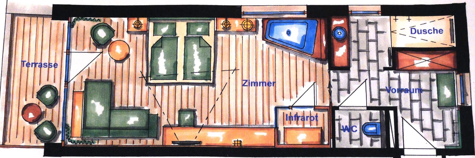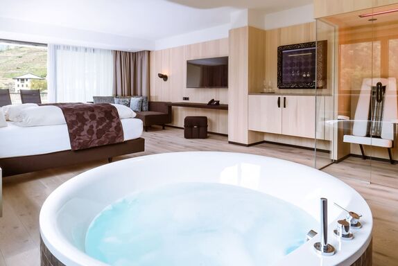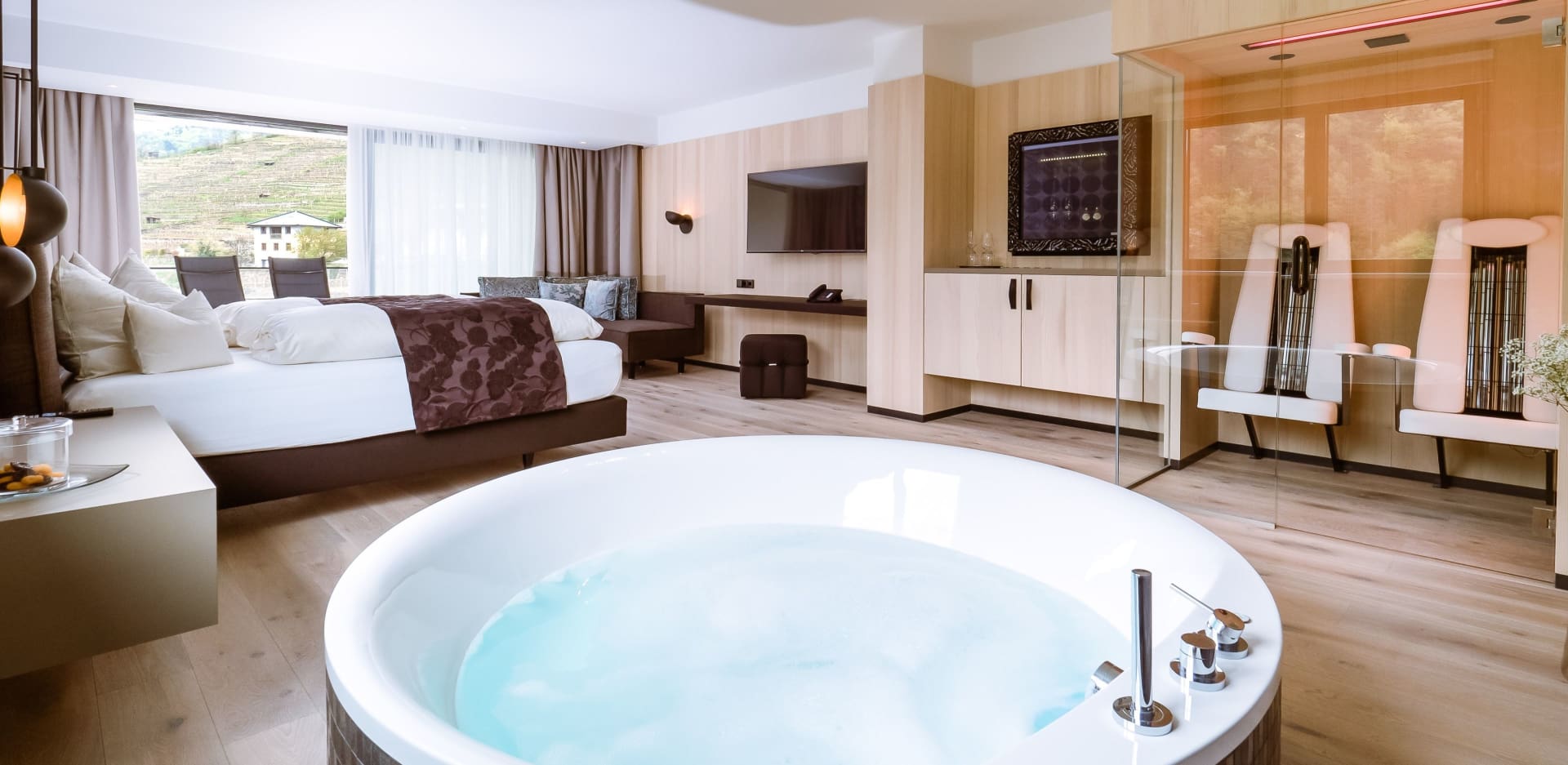 Die Wellness-Suite DELUXE befindet sich im Boutiquehotel WEINSPITZund ist mit einer Badewanne im Zimmer mit herrlichem Ausblick von dem großen Balkon, einer Infrarotkabine, großzügigem Bad mir einer Regendusche und separatem WC, Boxspringbett, einer Klimaanlage, und einer Minibar ausgestattet.