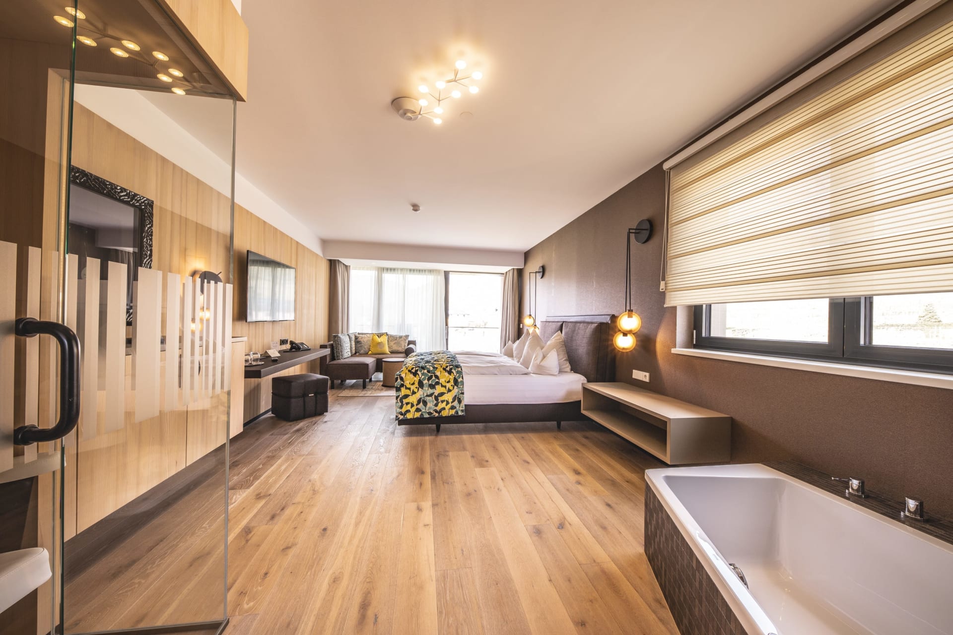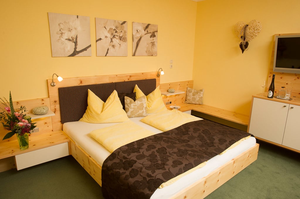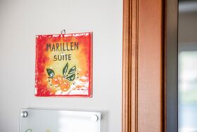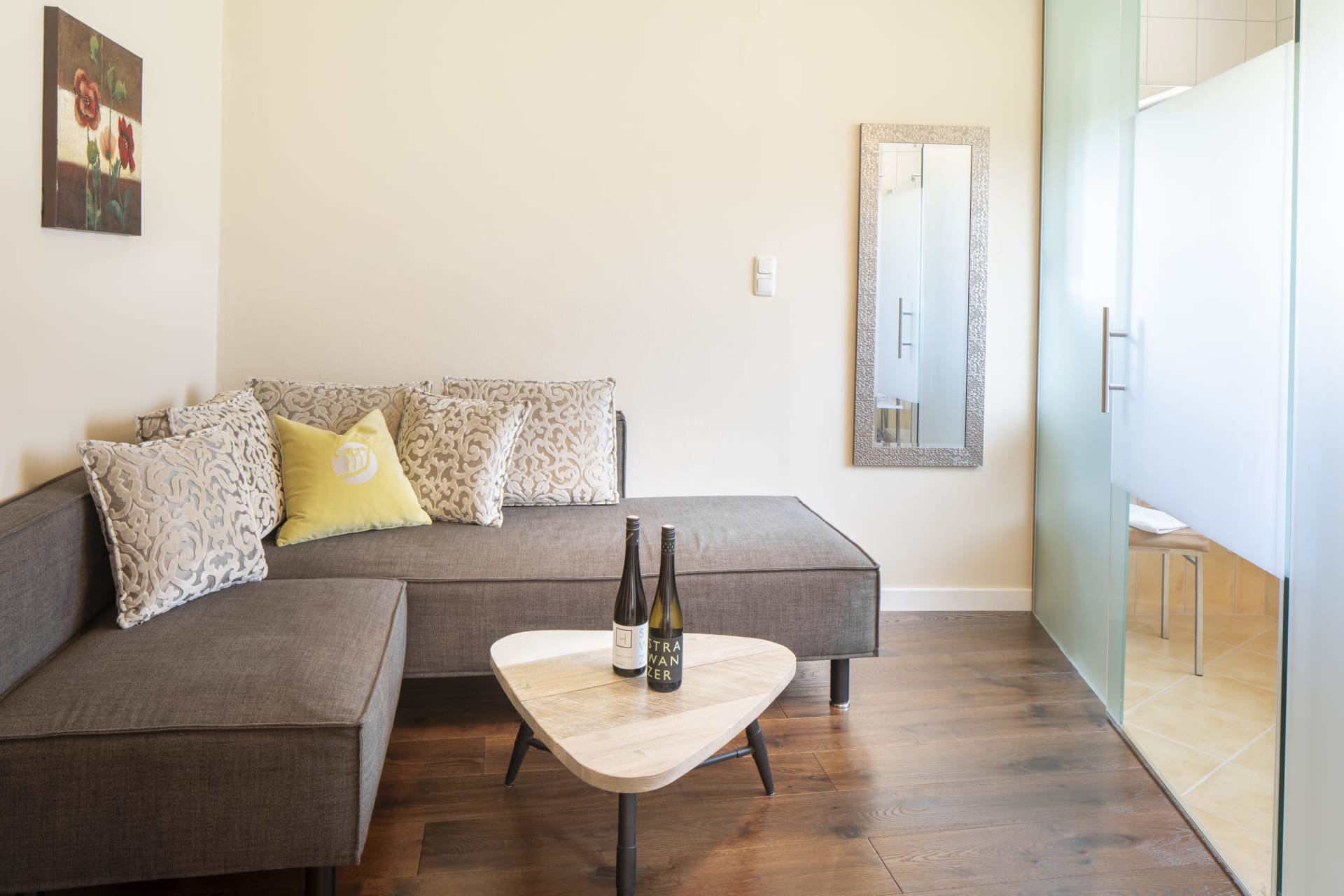 Unser Genießerzimmer MARILLE im Gästehaus am Weingut ist mit einem Wohnzimmer, einem Schlafzimmer, einer Klimaanlage, einer Minibar, einem Flachbildfernseher und großem Bad ausgestattet. Holzboden und Vollholzmöbeln garantieren einen erholsamen Schlaf.