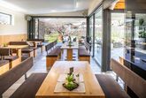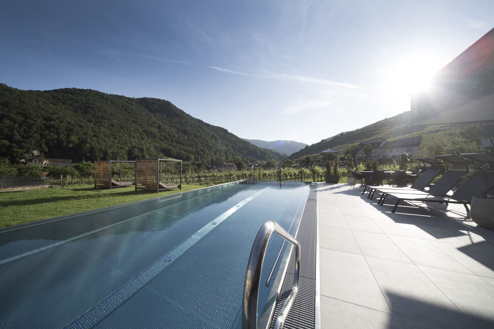 Zum Verweilen und Erholen inmitten der traumhaften Kulisse der Wachauer Weinberge laden ein großzügiger beheizbarer Edelstahl-Infinity-Pool und ein Saunahaus mit einer Sauna und eine Infrarotkabine im Garten, sowie ein idyllischer Loungebereich mit herrlichem Ausblick ein.