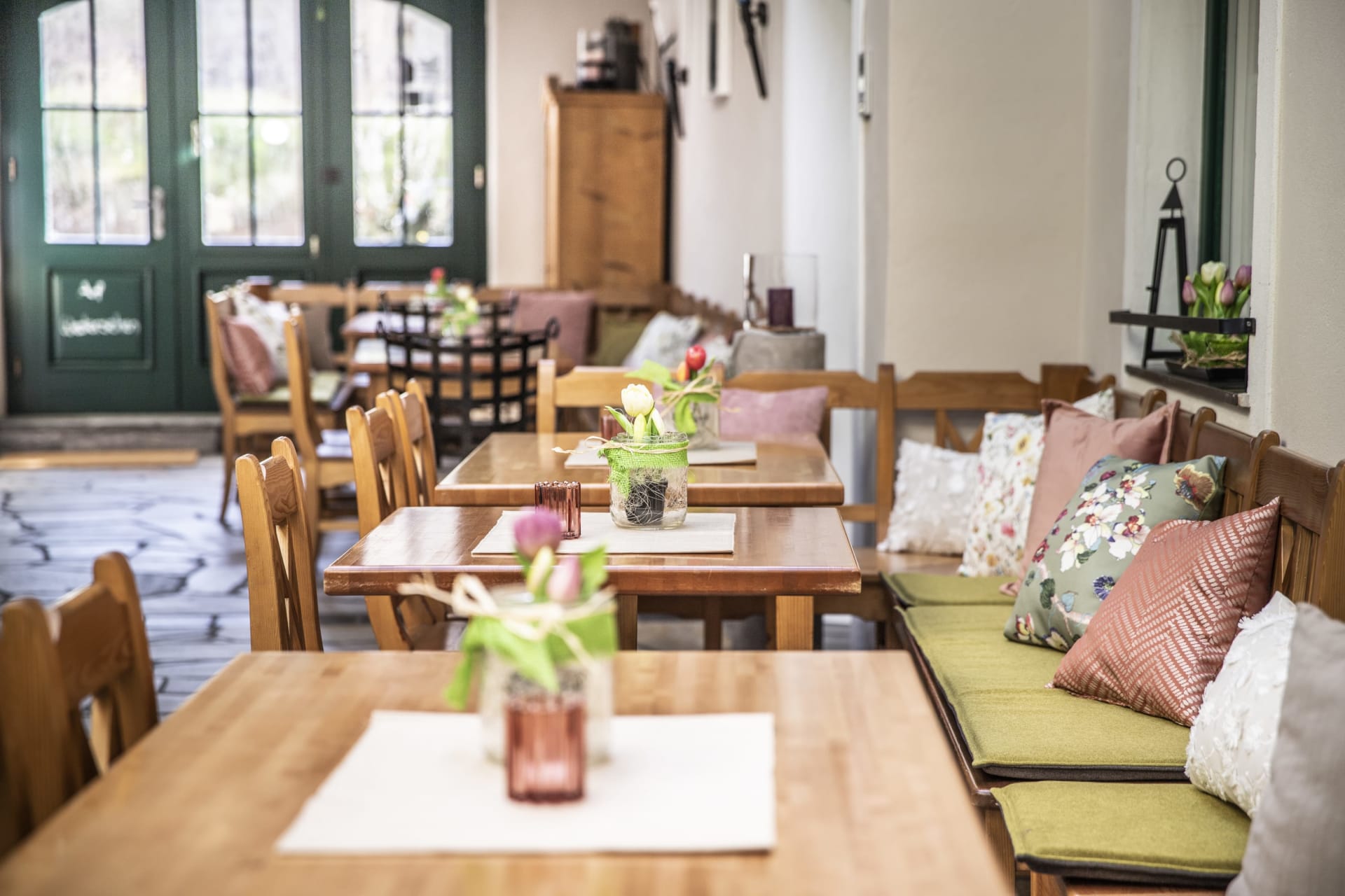 Ein ausgewogenes Frühstücksbuffet mit Produkten aus der Region und hausgemachten Marmeladen steht jeden Morgen für Sie bereit, während Sie die bezaubernde Aussicht auf die Umgebung genießen können.