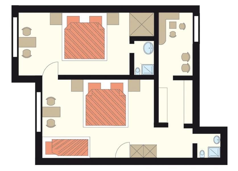 Schönes Appartement mit 2 Schlafzimmern (Doppelzimmer über eine Verbindungstür vom Dreibettzimmer aus erreichbar) und jeweils ein Badezimmer mit Dusche/WC. Voll ausgestattete Wohnküche mit E-Herd, Kühlshrank uvm., Größe ca. 62-80 m².