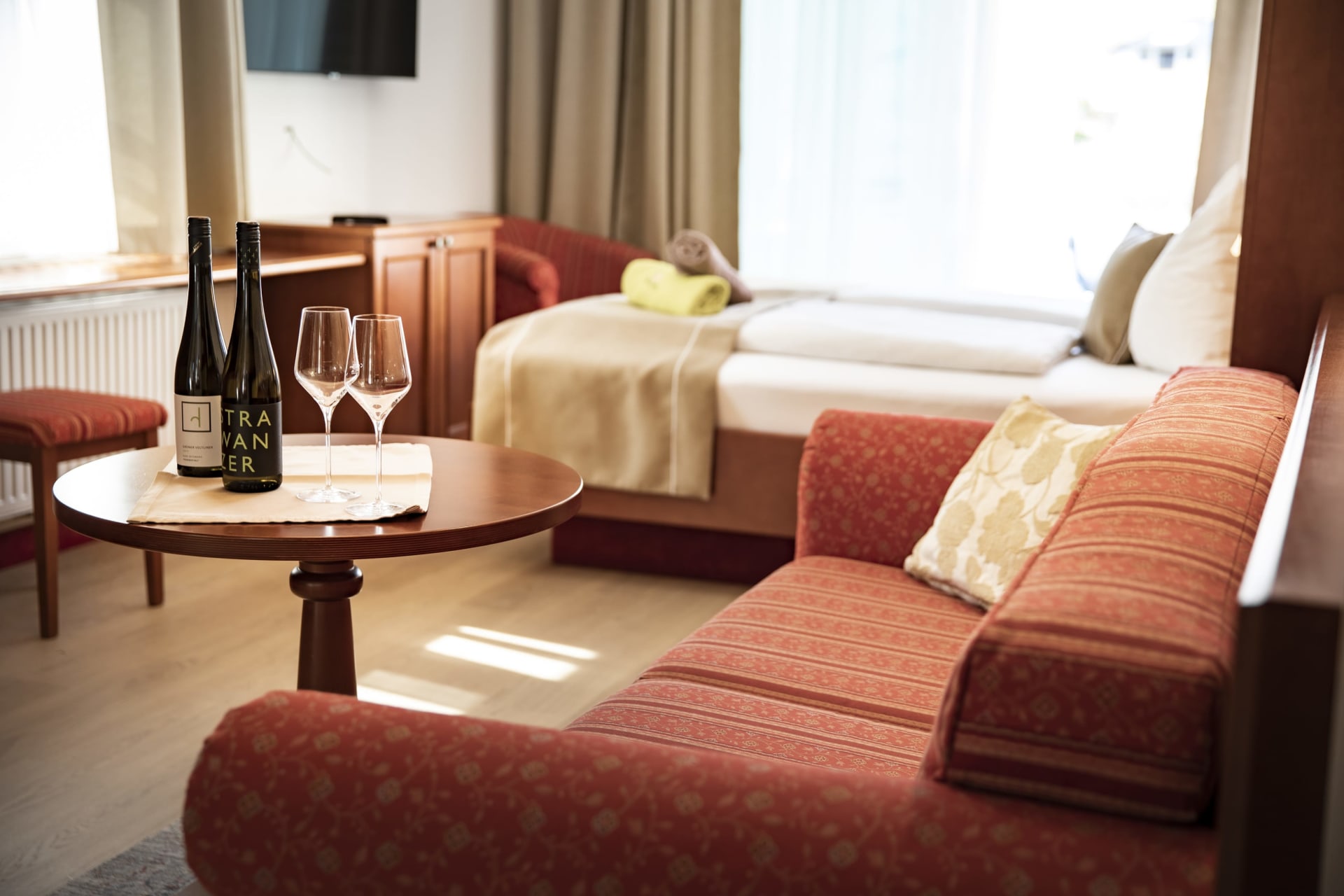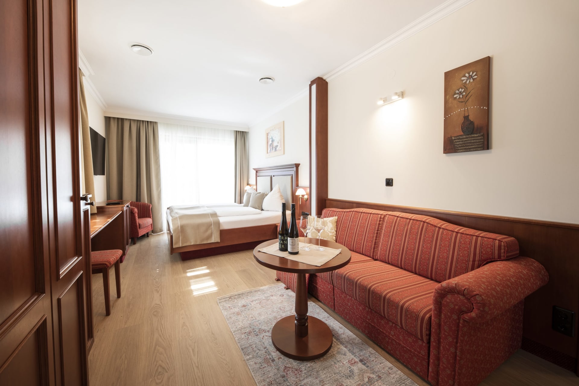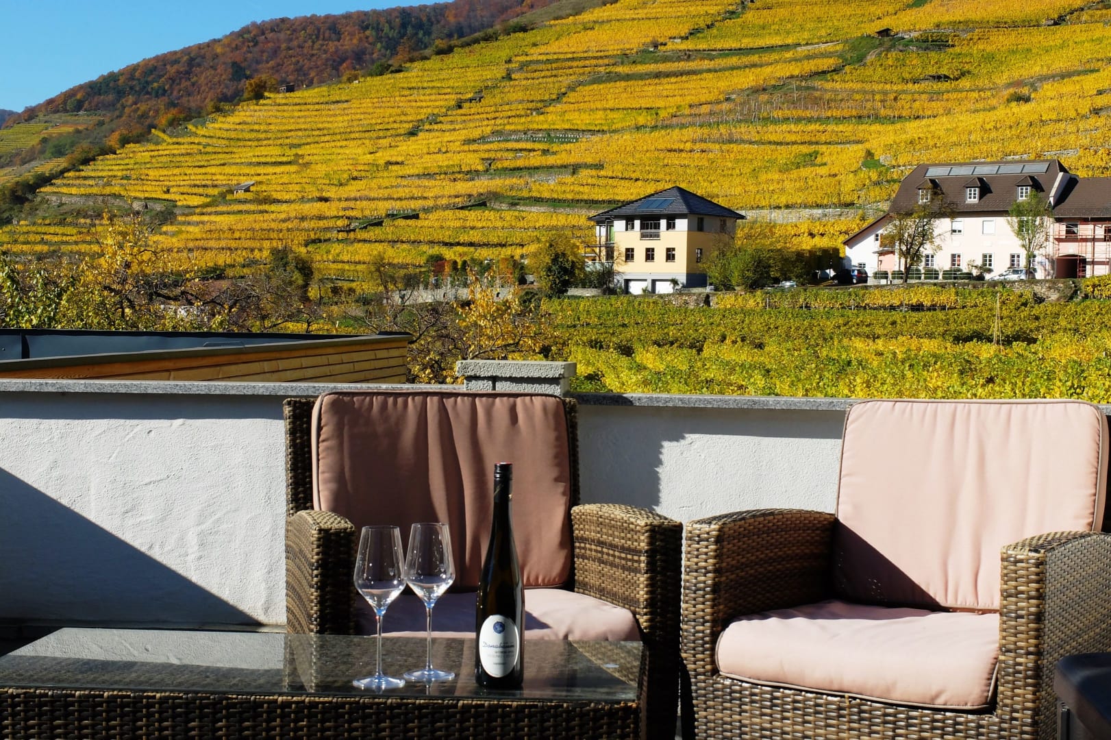 Unser Genießerzimmer SMARAGD im Gästehaus am Weingut verfügt über eine große Terrasse mit herrlichem Blick auf die Weinberge.