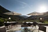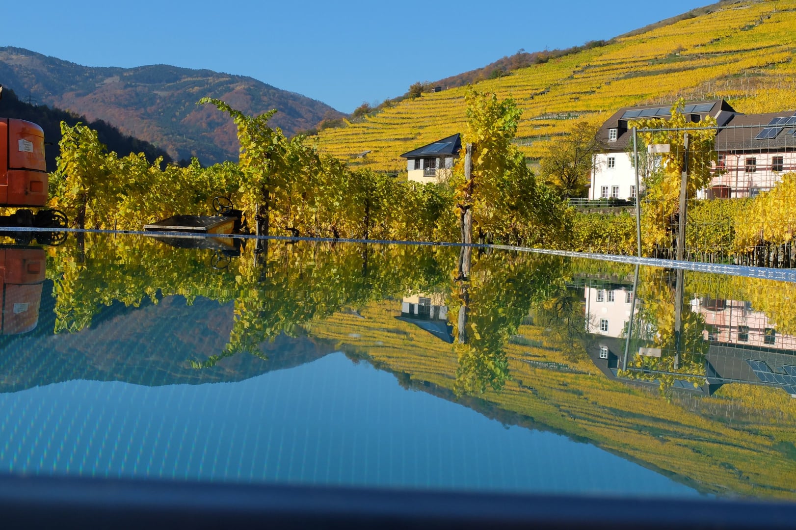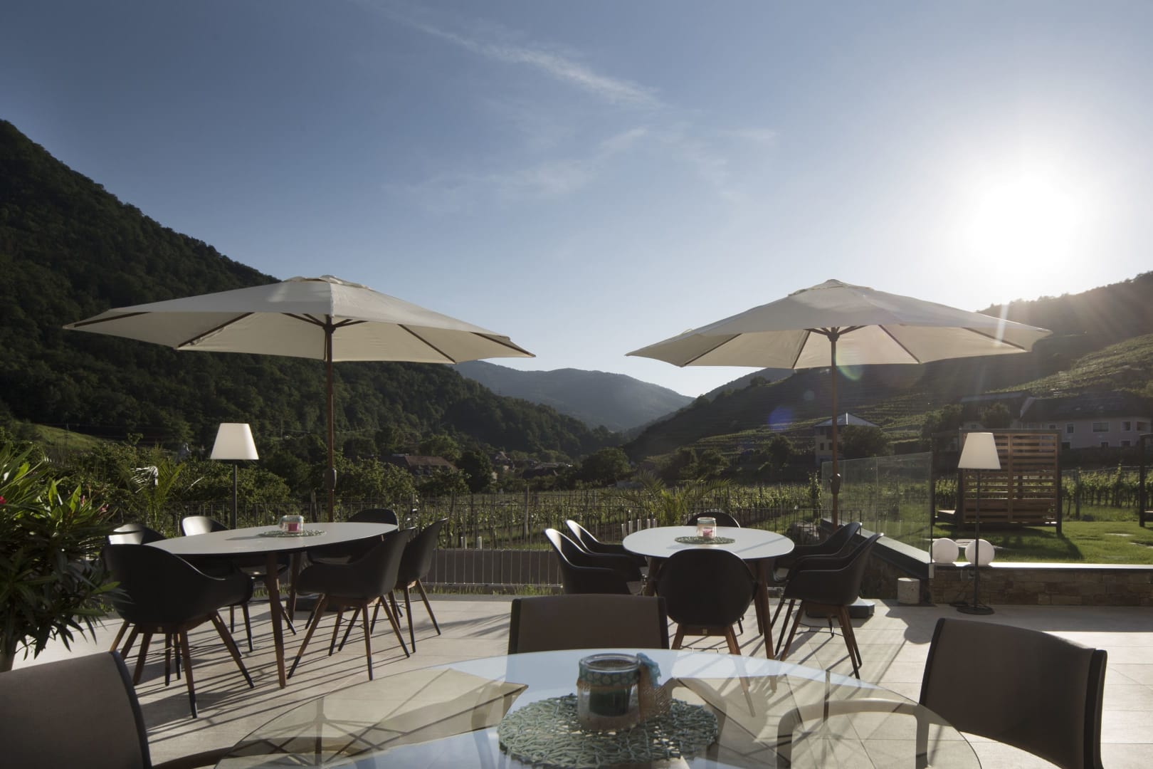Panoramaglasfronten auf die Terrasse mit einem herrlichem Blick auf die Weinberge.