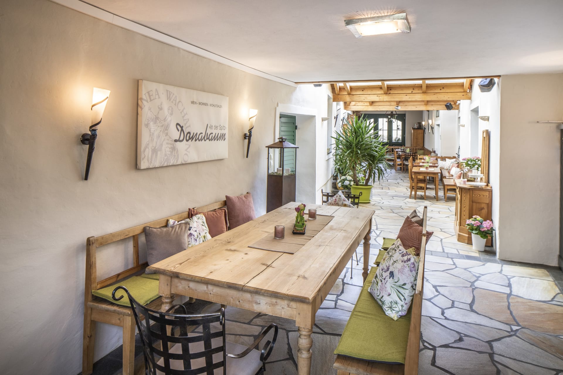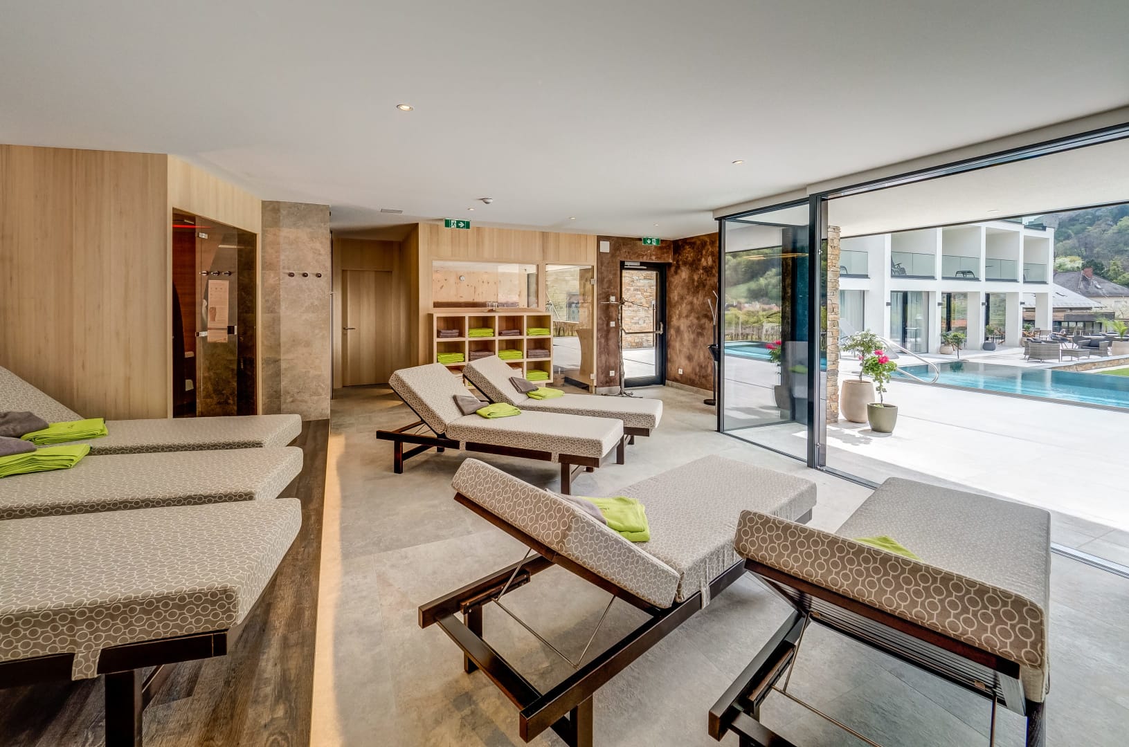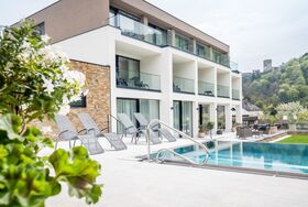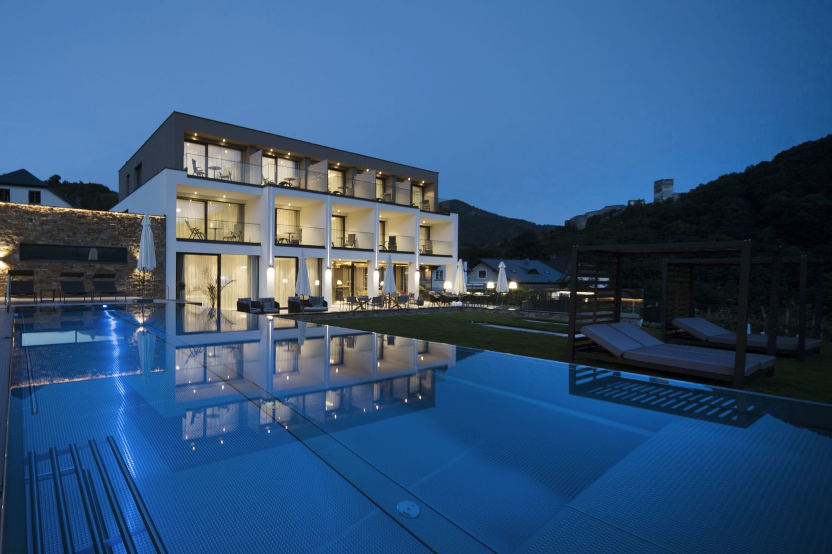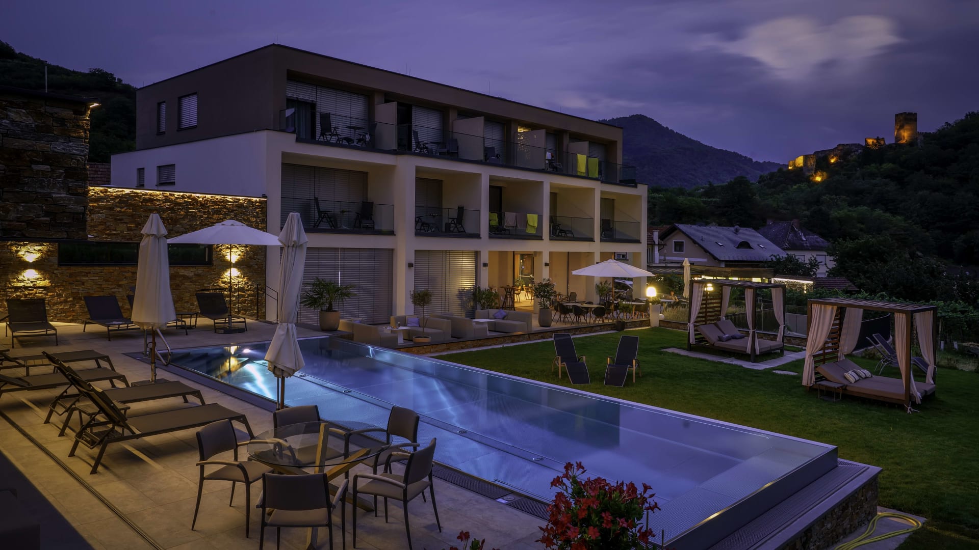 Zum Verweilen und Erholen inmitten der traumhaften Kulisse der Wachauer Weinberge laden ein großzügiger beheizbarer Edelstahl-Infinity-Pool und ein Saunahaus mit einer Sauna und eine Infrarotkabine im Garten, sowie ein idyllischer Loungebereich mit herrlichem Ausblick ein.