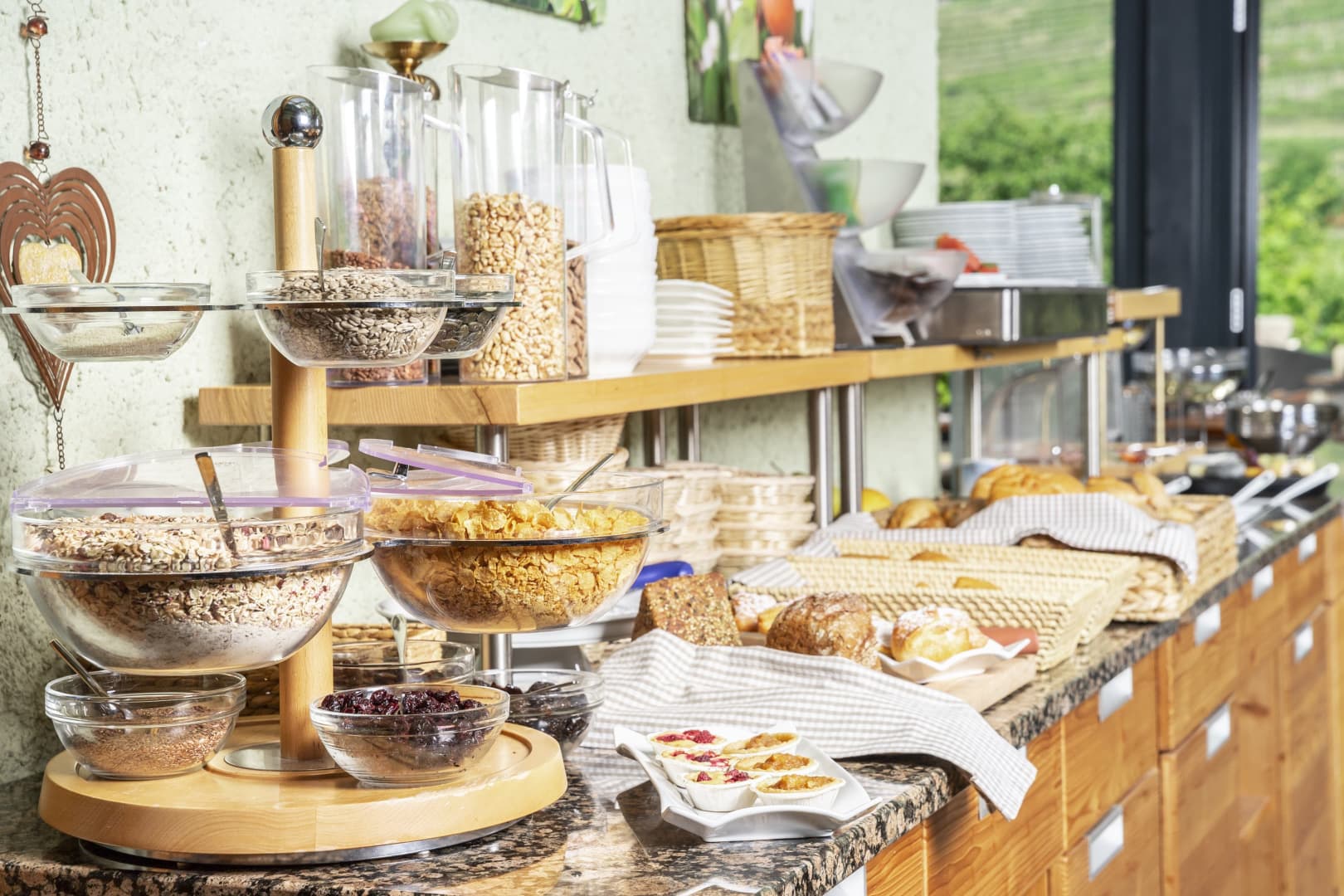 Ein ausgewogenes Frühstücksbuffet mit Produkten aus der Region und hausgemachten Marmeladen steht jeden Morgen für Sie bereit, während Sie die bezaubernde Aussicht auf die Umgebung genießen können.