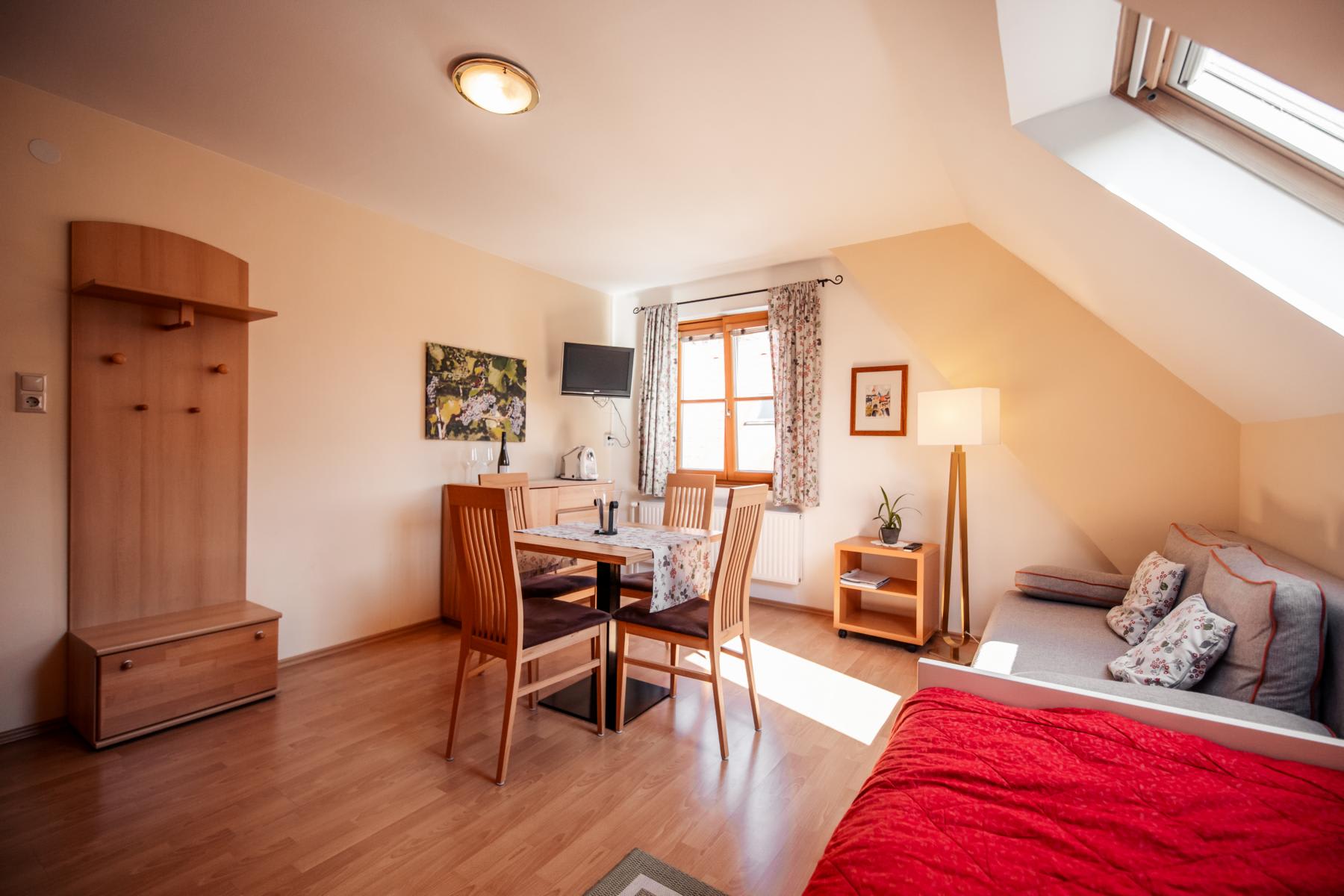 1 Schlafzimmer, 1 kombinierter Wohn-Essraum (Schlafgelegenheit für 3 Personen), 1 Kleinküche, 1 Badezimmer und ein WC.