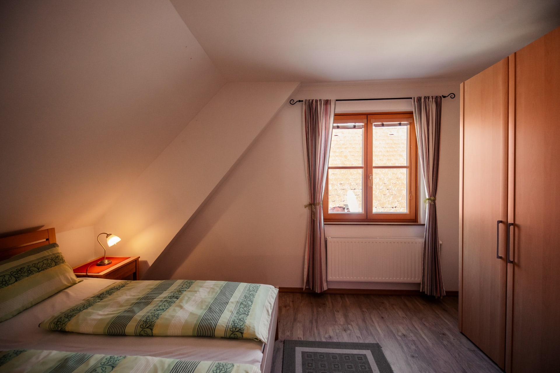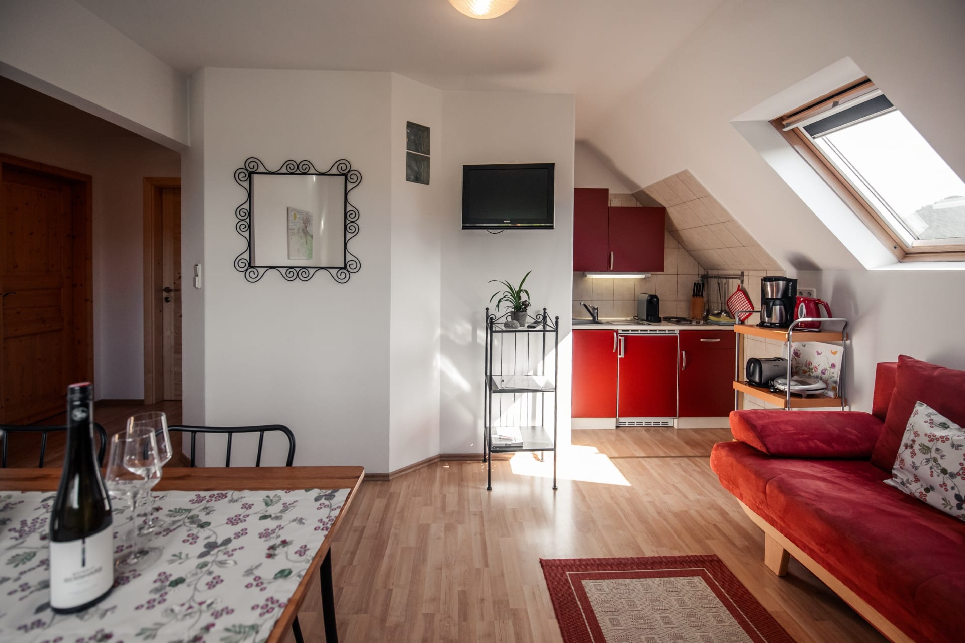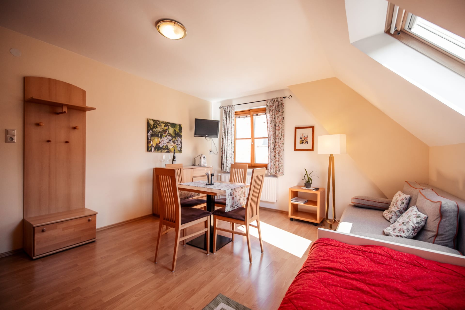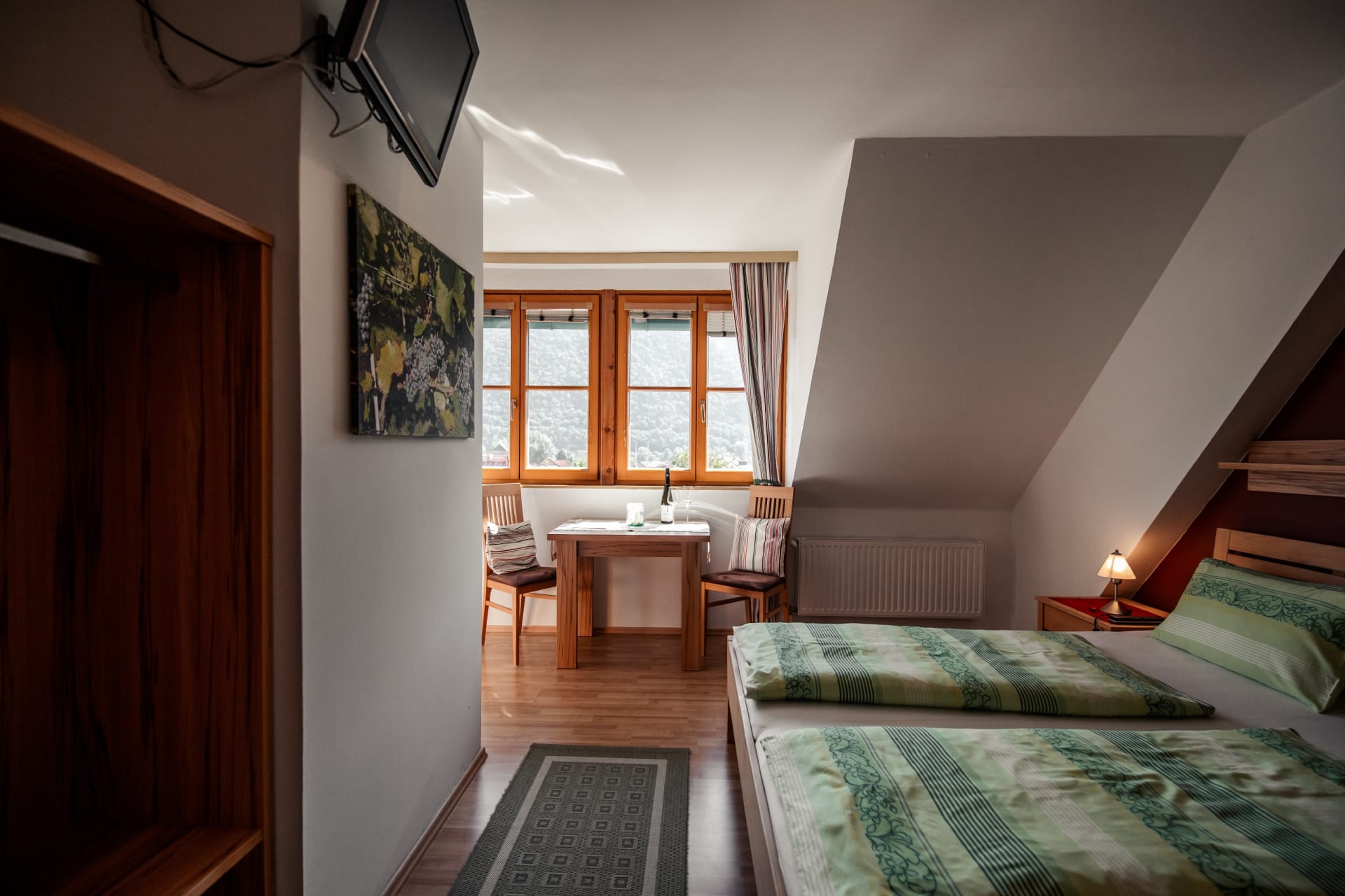 Freundlich, helles Doppelzimmer, DU/WC, Haartrockner, SAT-TV. Das Zimmer ist farblich harmonisch abgestimmt und mit liebevollen Details ausgestattet. Herrlicher Ausblick in unseren Naturgarten und Weingärten!