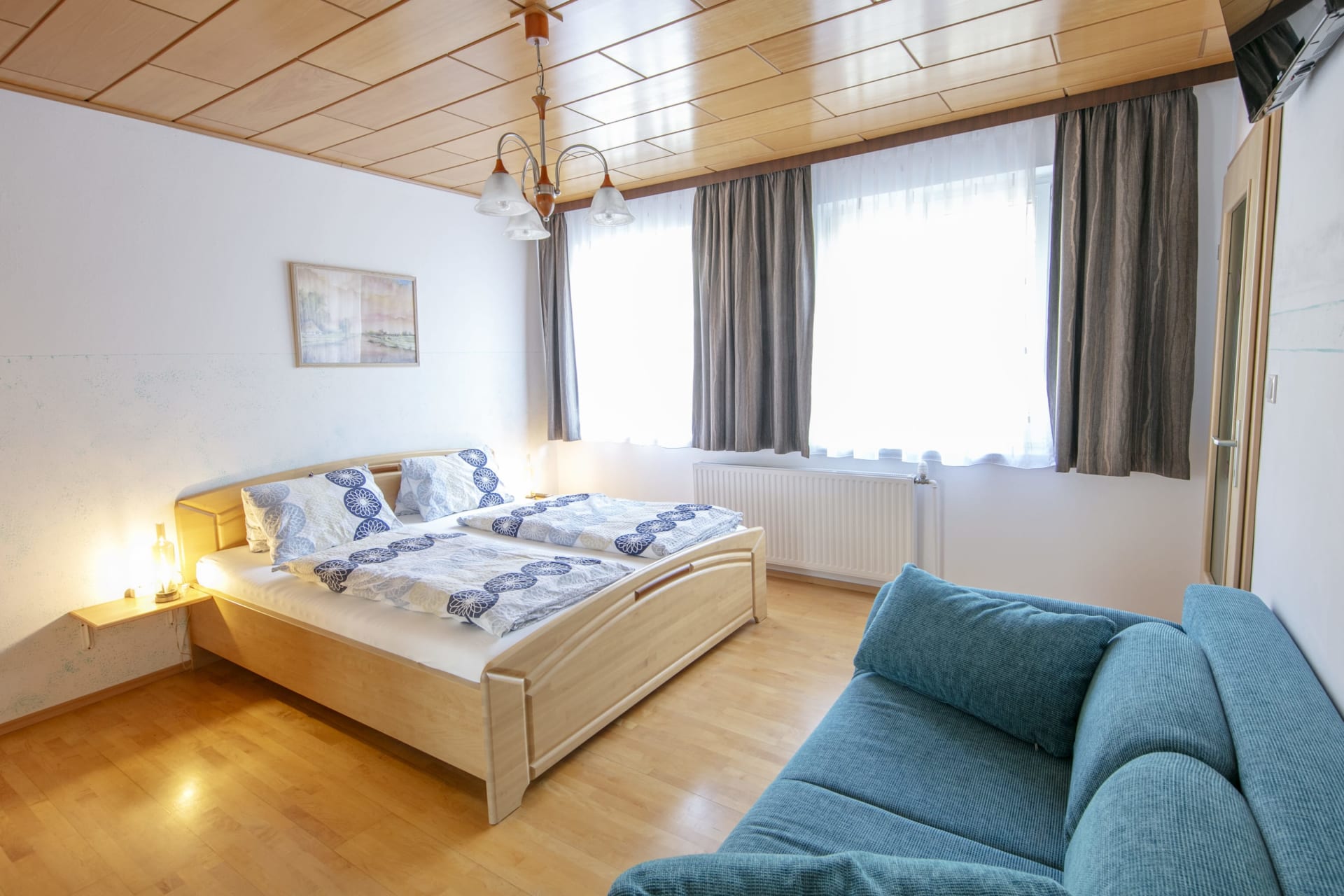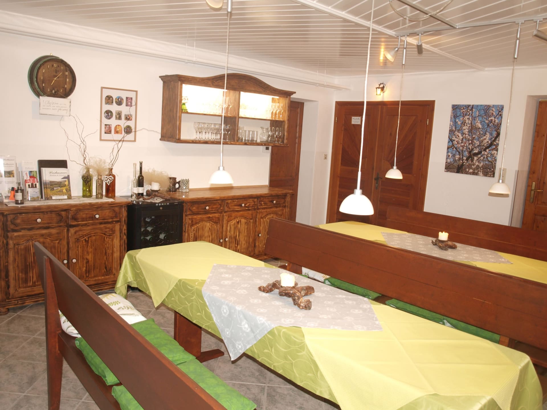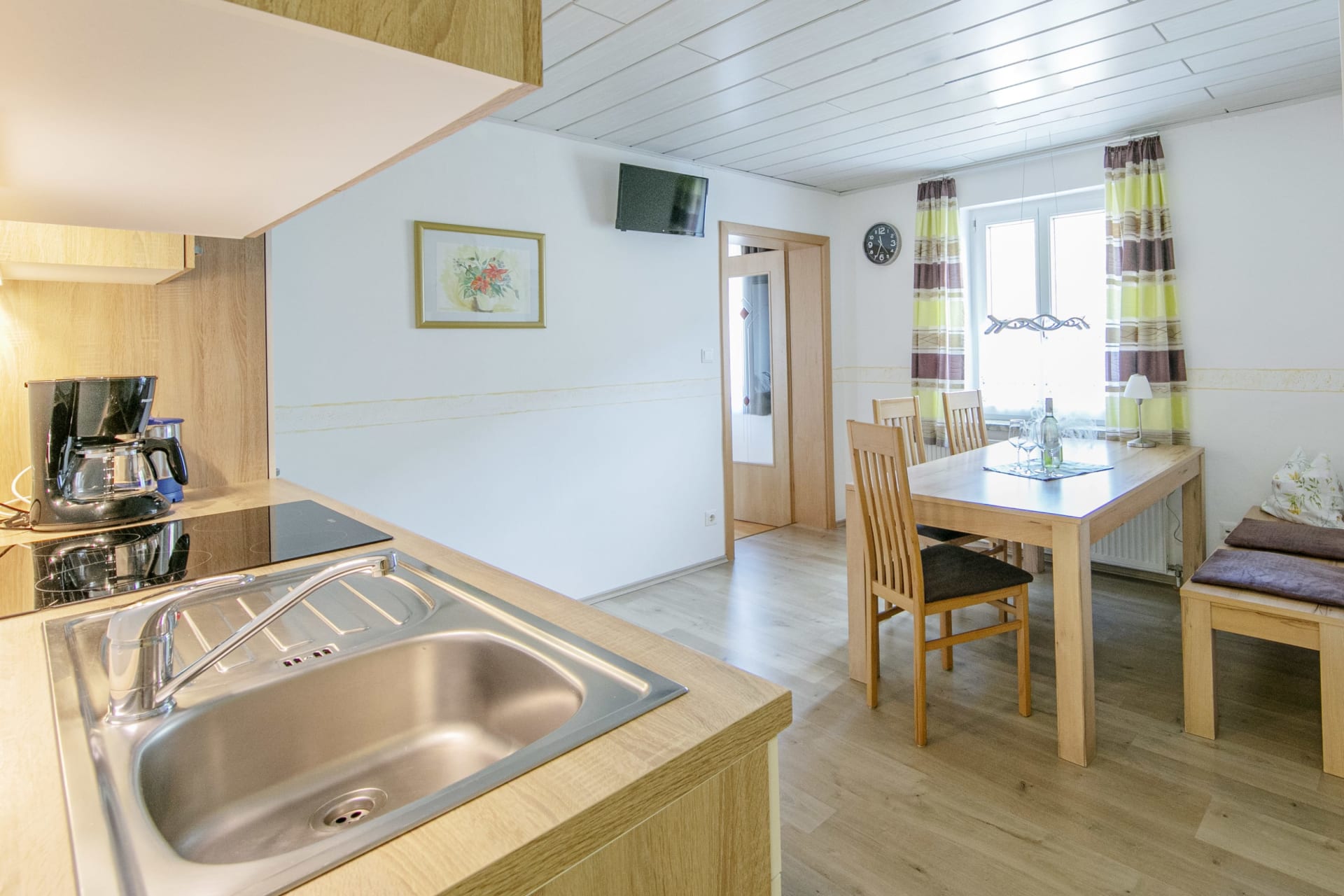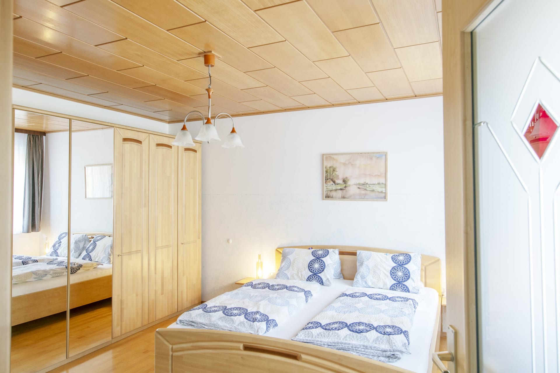 Willkommen in unserer charmanten Ferienwohnung, die auf großzügigen 43 m² Ruhe und Erholung verspricht. Ideal für Paare oder kleine Familien (bis zu 3 Personen), bietet sie einen separat gelegenen Schlafbereich mit einem komfortablen Doppelbett. Ein gemütliches Schlafsofa im Schlafzimmer bietet zusätzlichen Raum für eine dritte Person. Die moderne Wohnküche verfügt über einen Herd, Backofen, Kühlschrank, Kaffeemaschine, Wasserkocher, Toaster und Eierkocher. Sowohl im Schlafzimmer als auch im Wohnbereich ist jeweils ein Fernseher vorhanden. Das Badezimmer mit Dusche, WC und einem Haarföhn ist zudem mit frischen Handtüchern ausgestattet. Für Ihre Kleinsten stellen wir auf Wunsch gerne ein Gitterbett und einen Hochstuhl bereit. Genießen Sie sonnige Stunden und gemütliche Abende auf der Gemeinschaftsterrasse, die mit einer Grillmöglichkeit versehen ist – perfekt für gesellige Stunden im Freien. Selbstverständlich steht Ihnen kostenfreies WLAN zur Verfügung. Starten Sie energiegeladen in den Tag: Auf Wunsch verwöhnen wir Sie gerne mit unserem reichhaltigen Frühstücksbuffet. Bitte beachten Sie, dass dieses Angebot während der Weinlesezeit im Herbst leider nicht verfügbar ist.