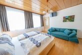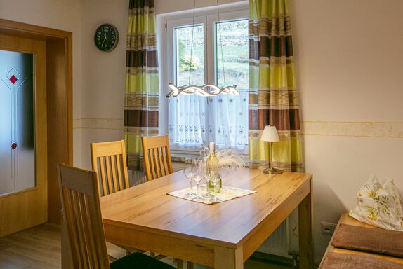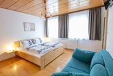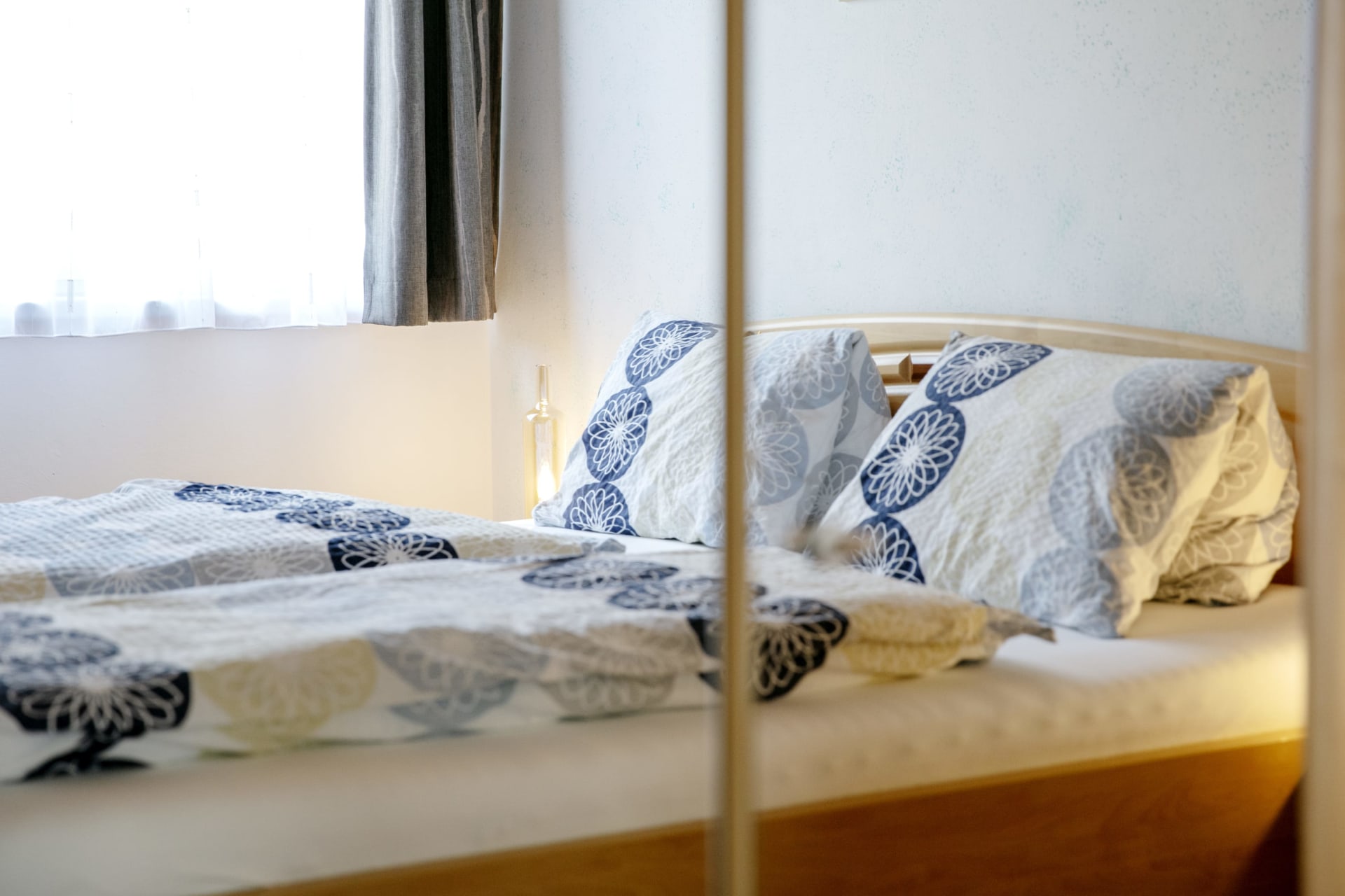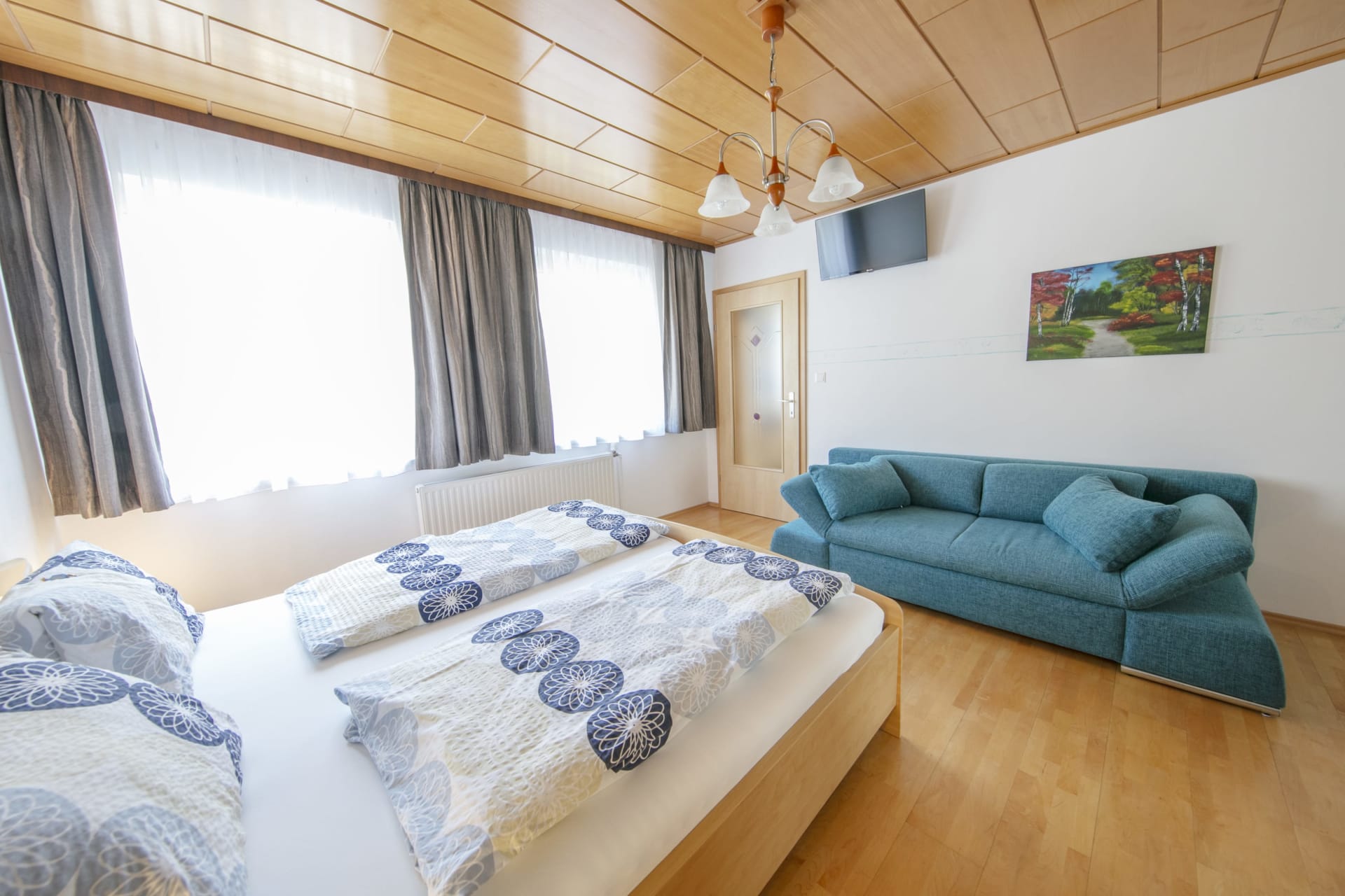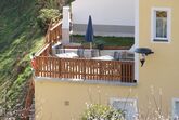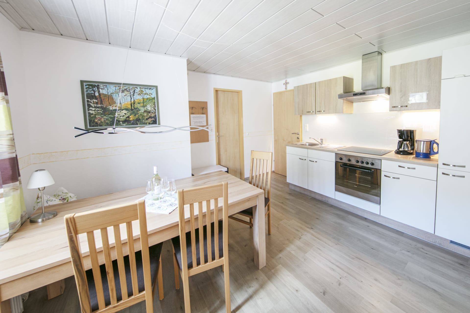 Willkommen in unserer charmanten Ferienwohnung, die auf großzügigen 43 m² Ruhe und Erholung verspricht. Ideal für Paare oder kleine Familien (bis zu 3 Personen), bietet sie einen separat gelegenen Schlafbereich mit einem komfortablen Doppelbett. Ein gemütliches Schlafsofa im Schlafzimmer bietet zusätzlichen Raum für eine dritte Person. Die moderne Wohnküche verfügt über einen Herd, Backofen, Kühlschrank, Kaffeemaschine, Wasserkocher, Toaster und Eierkocher. Sowohl im Schlafzimmer als auch im Wohnbereich ist jeweils ein Fernseher vorhanden. Das Badezimmer mit Dusche, WC und einem Haarföhn ist zudem mit frischen Handtüchern ausgestattet. Für Ihre Kleinsten stellen wir auf Wunsch gerne ein Gitterbett und einen Hochstuhl bereit. Genießen Sie sonnige Stunden und gemütliche Abende auf der Gemeinschaftsterrasse, die mit einer Grillmöglichkeit versehen ist – perfekt für gesellige Stunden im Freien. Selbstverständlich steht Ihnen kostenfreies WLAN zur Verfügung. Starten Sie energiegeladen in den Tag: Auf Wunsch verwöhnen wir Sie gerne mit unserem reichhaltigen Frühstücksbuffet. Bitte beachten Sie, dass dieses Angebot während der Weinlesezeit im Herbst leider nicht verfügbar ist.