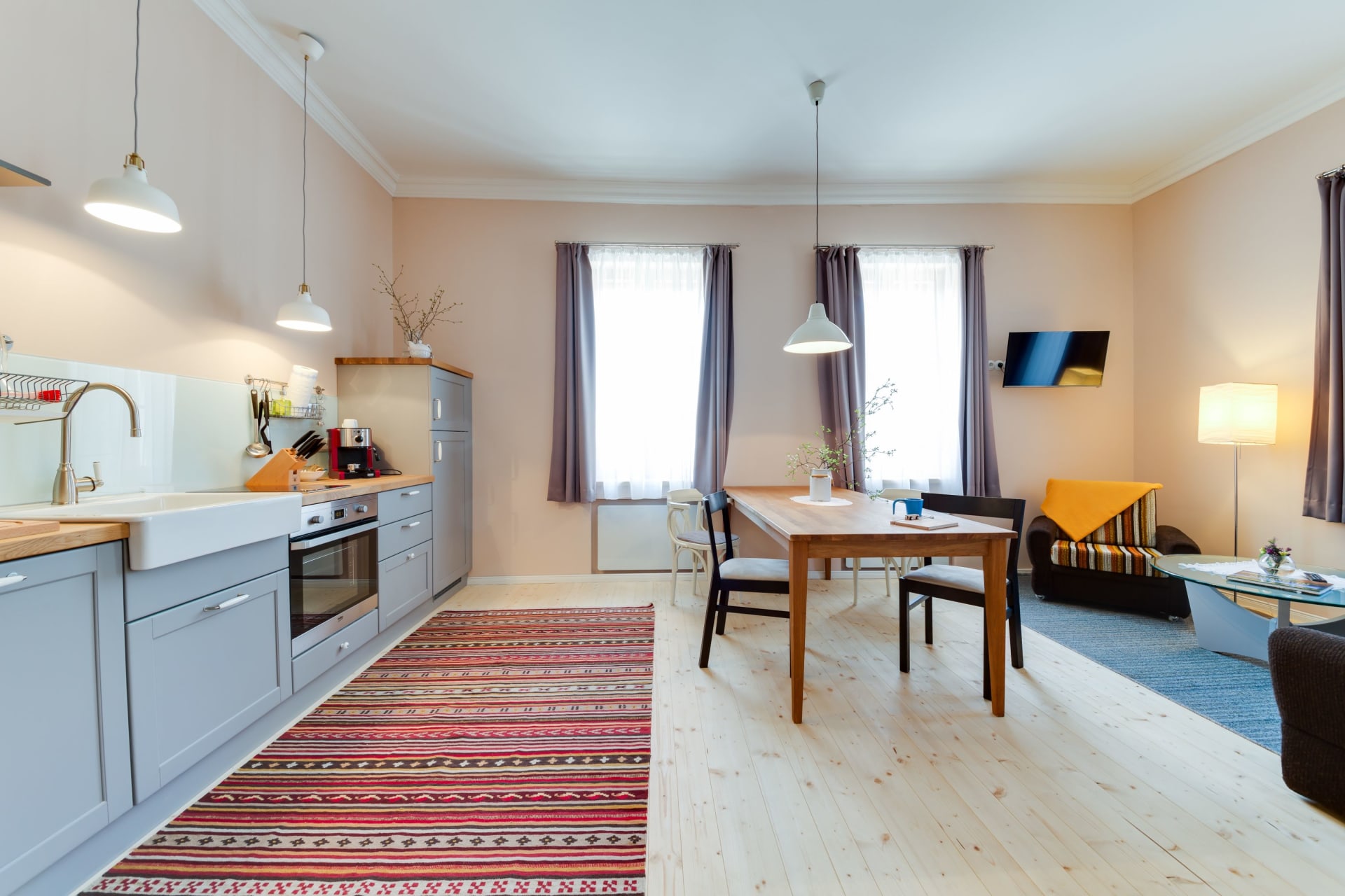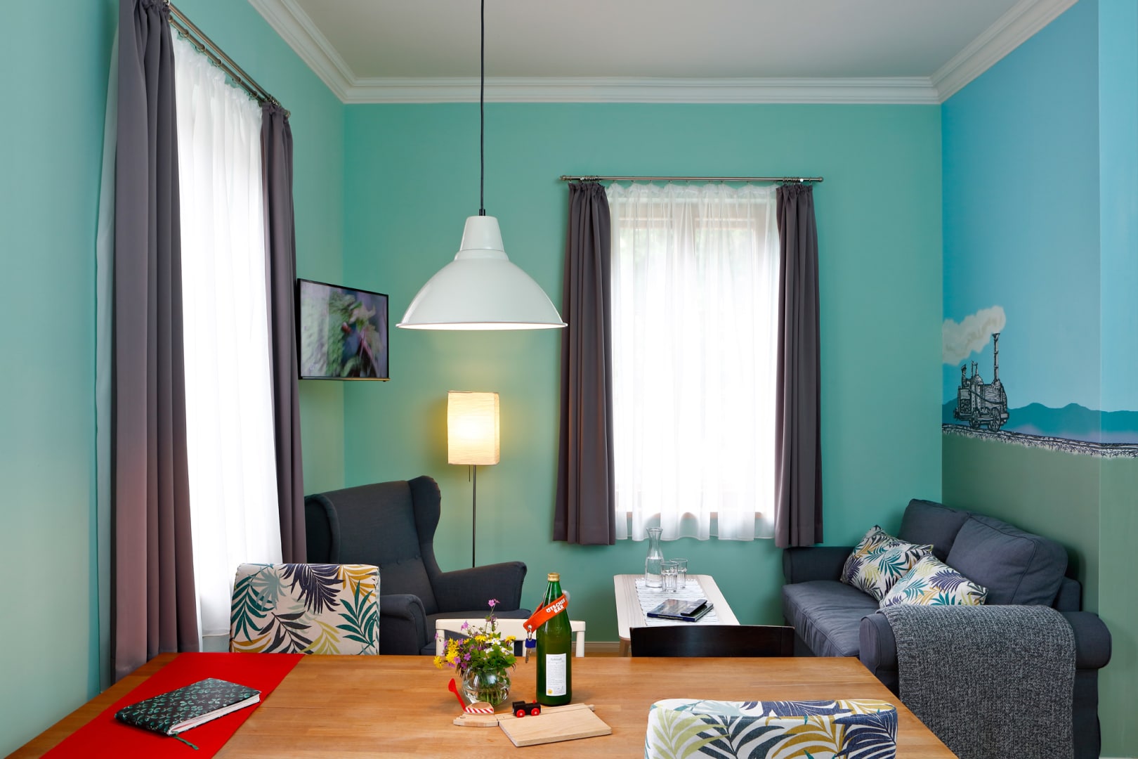 Diese Wohnung bietet Wohnküche, Schlafzimmer und Bad/WC. Im Wohnzimmer befindet sich eine Ausziehcouch. Eingerichtet ist die Wohnung in einer Mischung aus Jahrhundertwendemöbeln (aus der Zeit des Baus der Mariazellerbahn) und modernen Details. Barrierefrei, mit Kabel-TV und W-LAN.