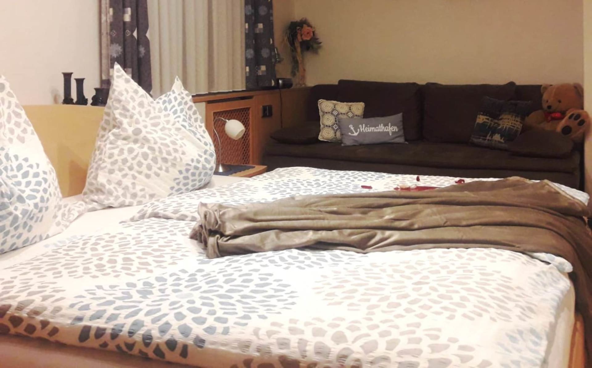 Unser geräumigen Komfort-Dreibettzimmer verfügt über Sat-TV und kostenfreies WLAN. Das Badezimmer ist mit WC und Dusche sowie mit einem Haartrockner ausgestattet. In den großzügig eingerichteten Zimmern befinden sich ein ein gemütliches Bett, Sitzgelegenheit, Kleiderschrank und die Couch lässt sich zu einer zusätzlichen Schlafgelegenheit verwandeln.